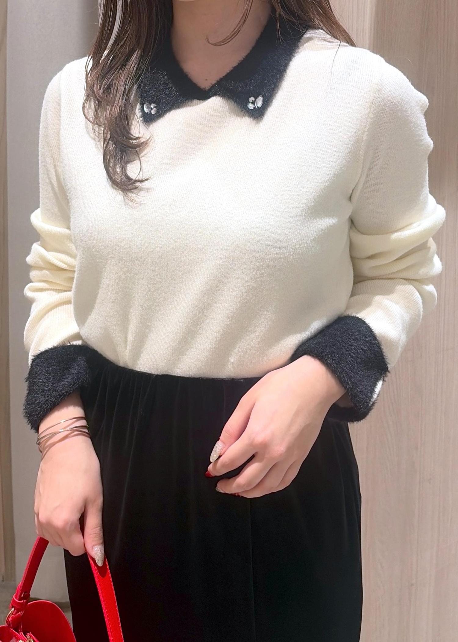 襟のビジューでシンプルながら華やかに見えるニットになっております♪ -