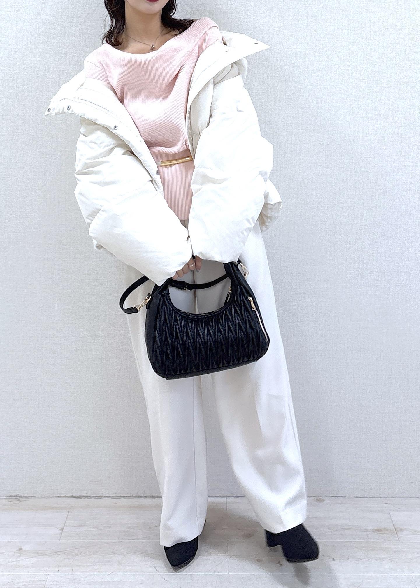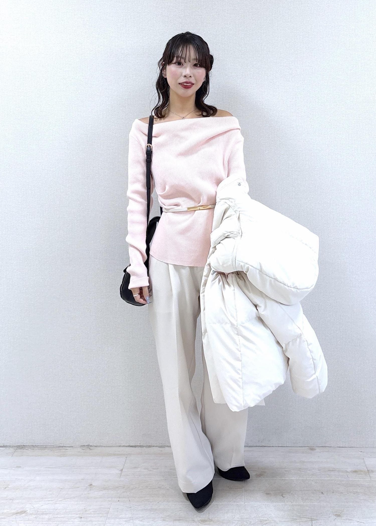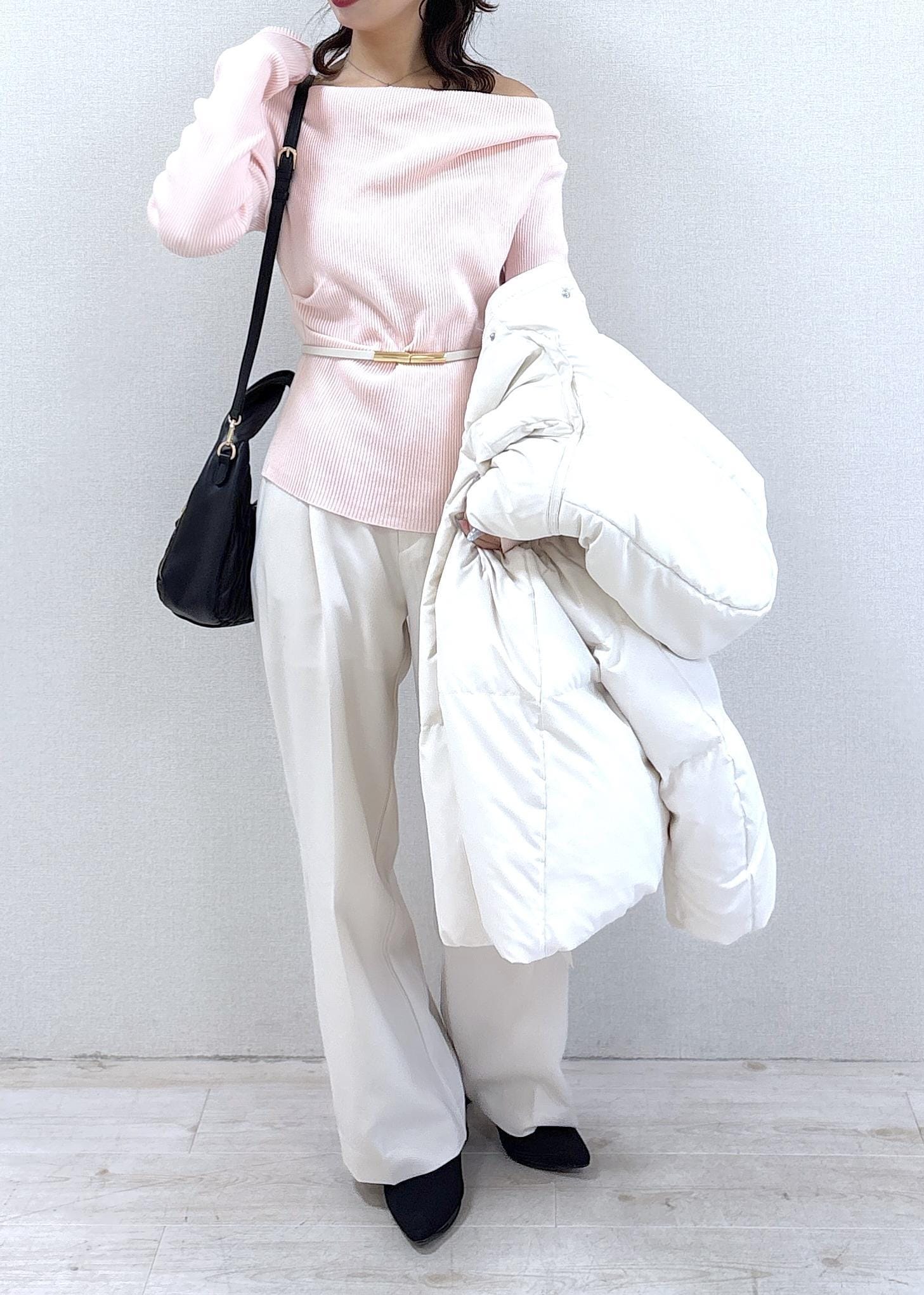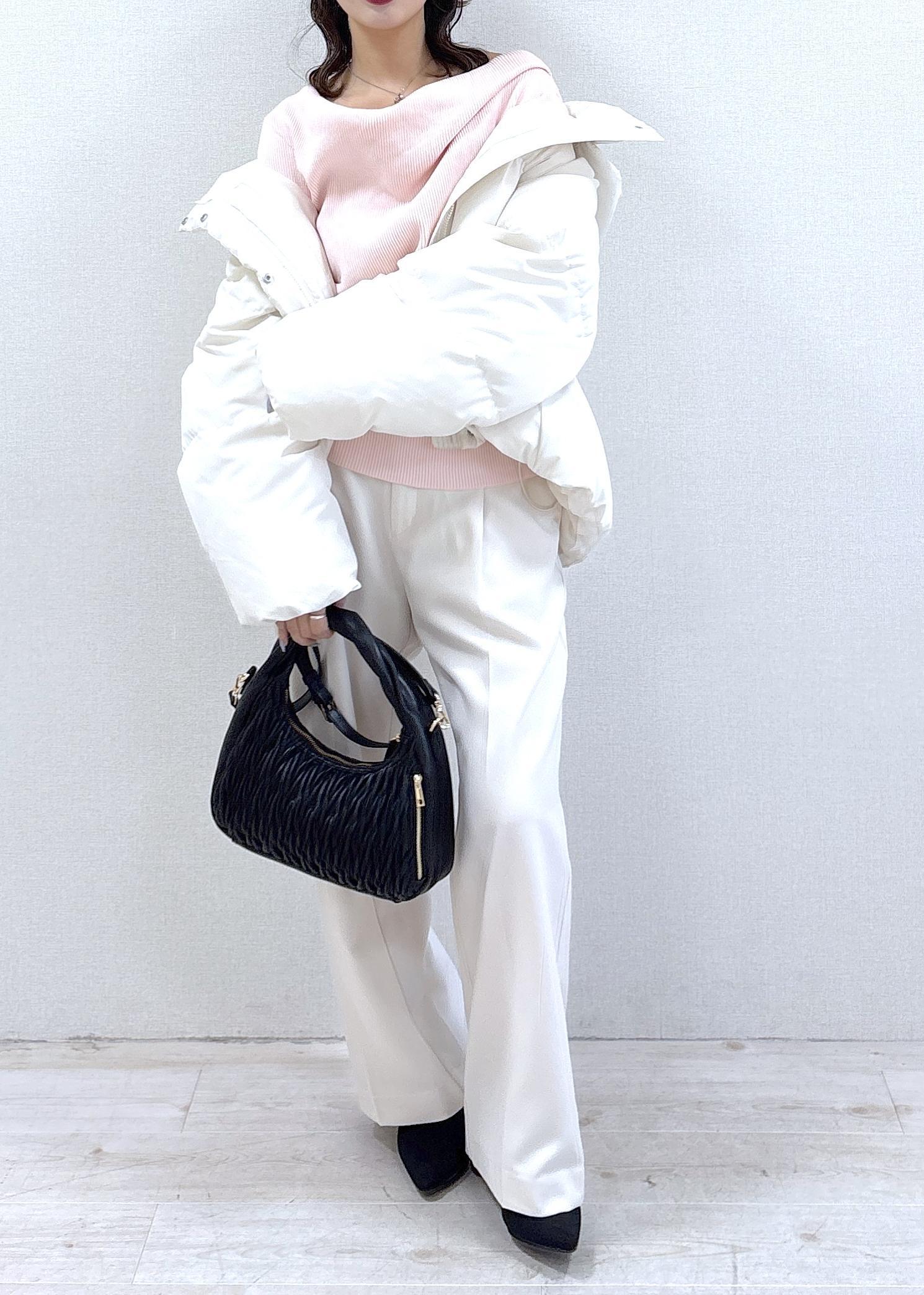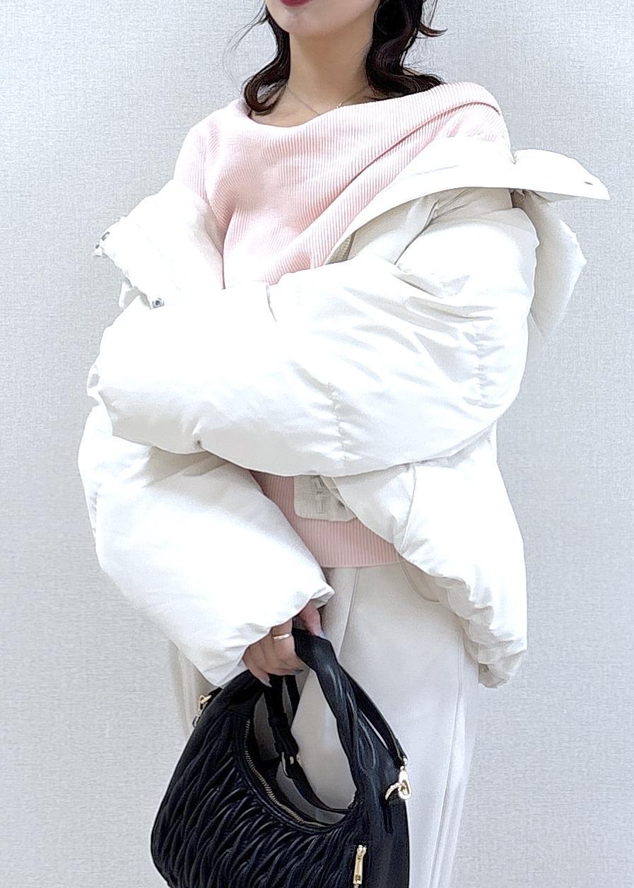 個人的にはマフラーをつけたりハイネックのニットを着ることが多いので、ダウンは肩を抜いてラフに着るのがオシャレ見えでお気に入りです☺︎ -