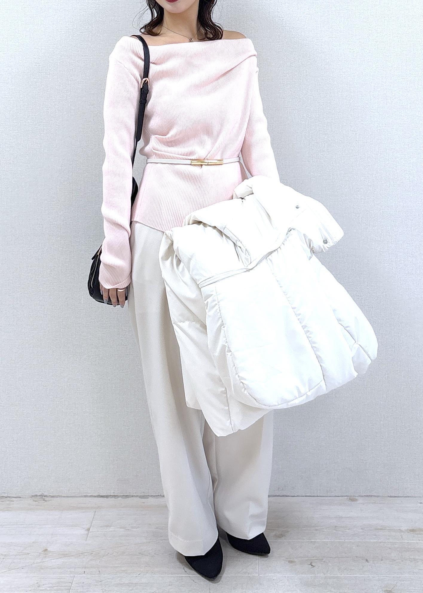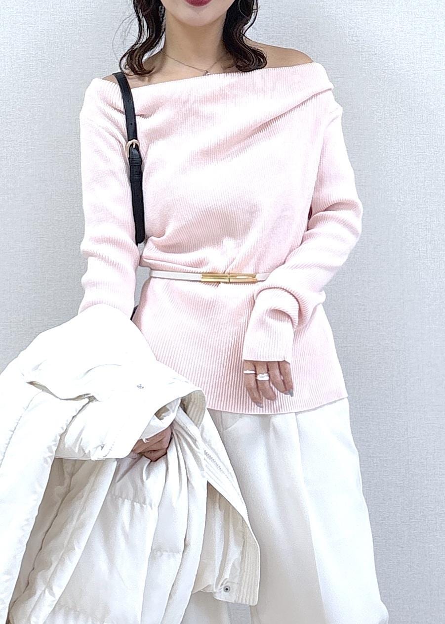 予約VISもちもちドレープリブニットトップス/イージーケアピンク / F¥4,389レビュー伸縮性があり柔らかい素材のニットで、ドレープのネックテザインもあるのでオフショルにしたりあえて弛みを強調して露出感を抑えたりと、着方が調整できます!