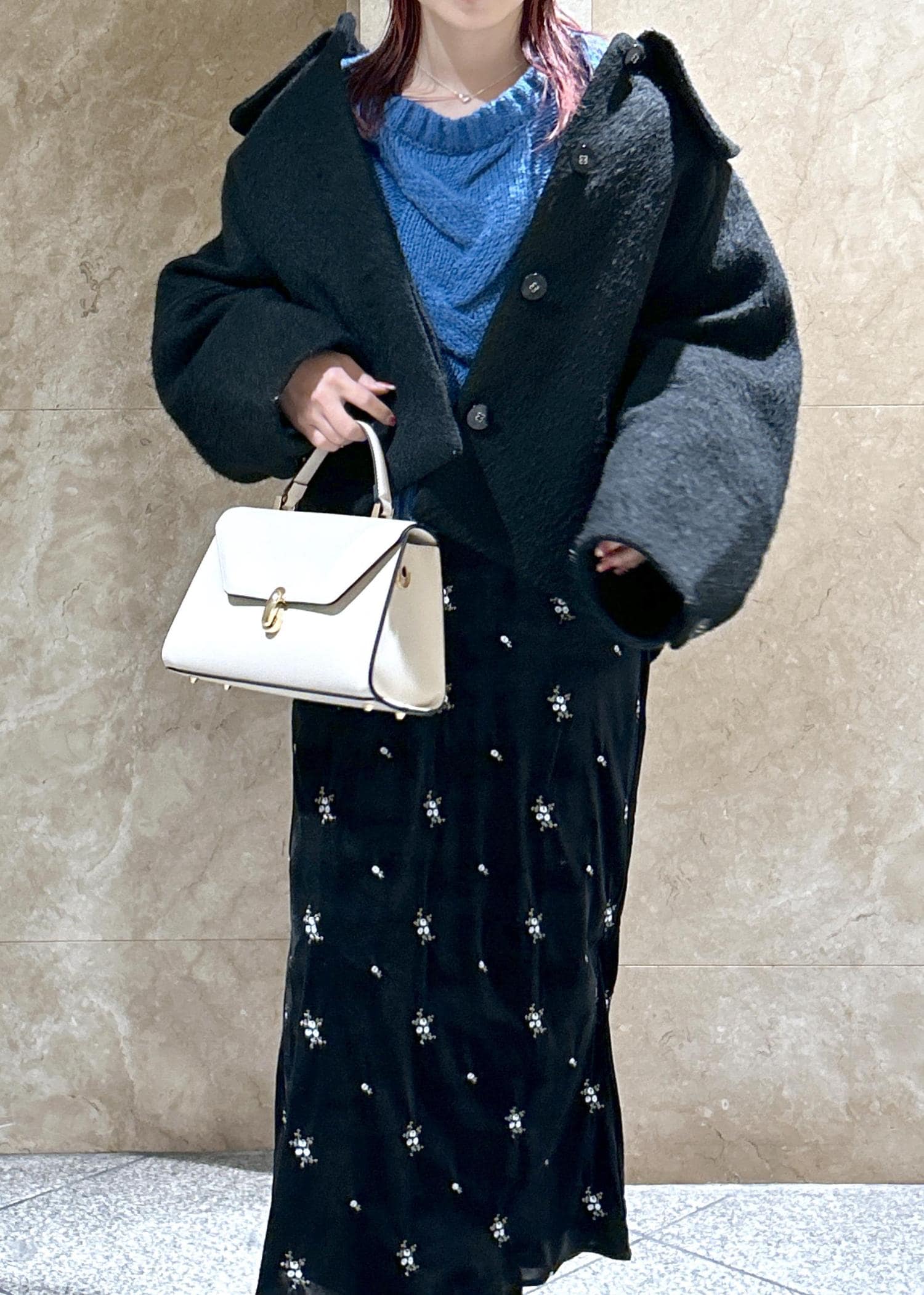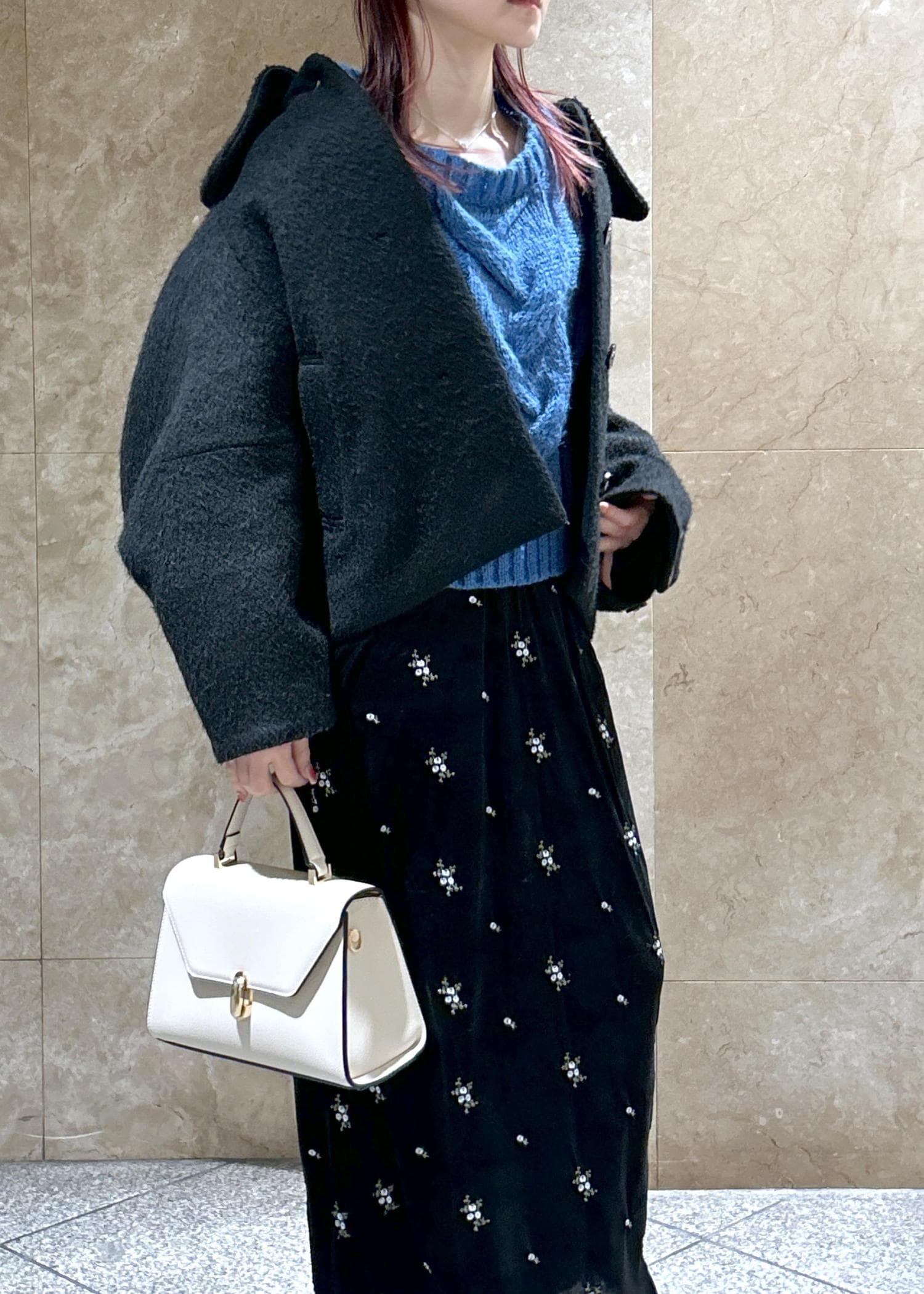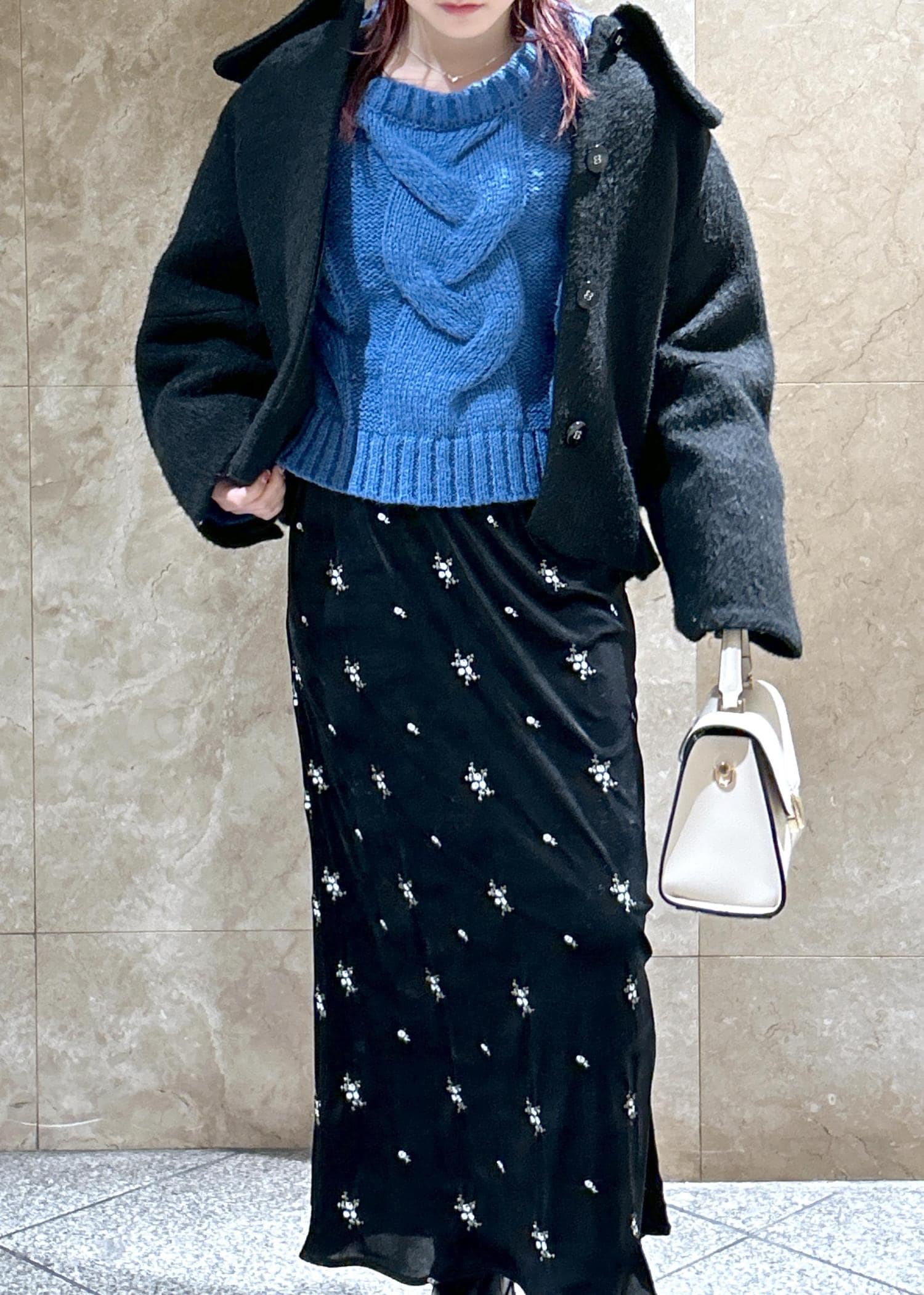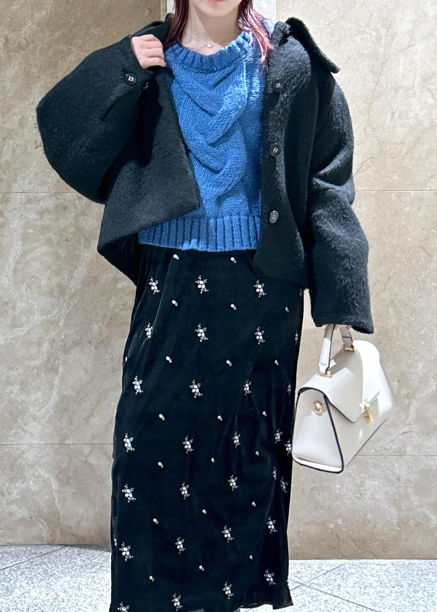 花柄のベロアワンピの上からケーブルニットと、アウターにはモモンガショートコートを合わせてみました。
