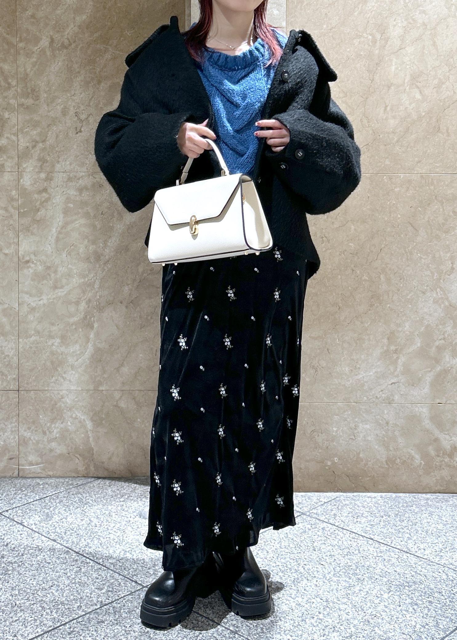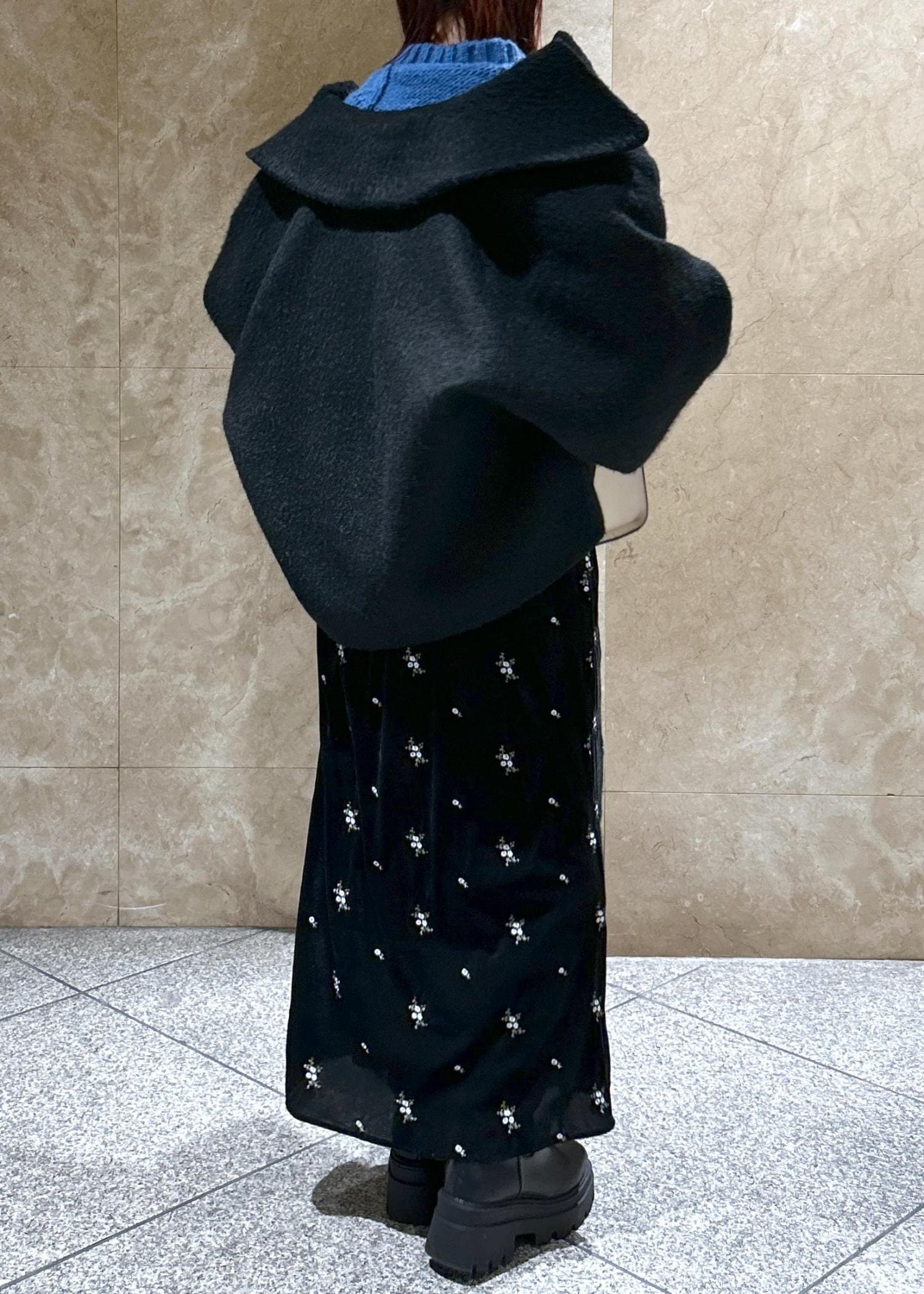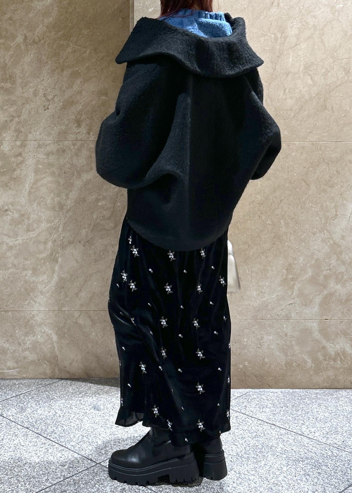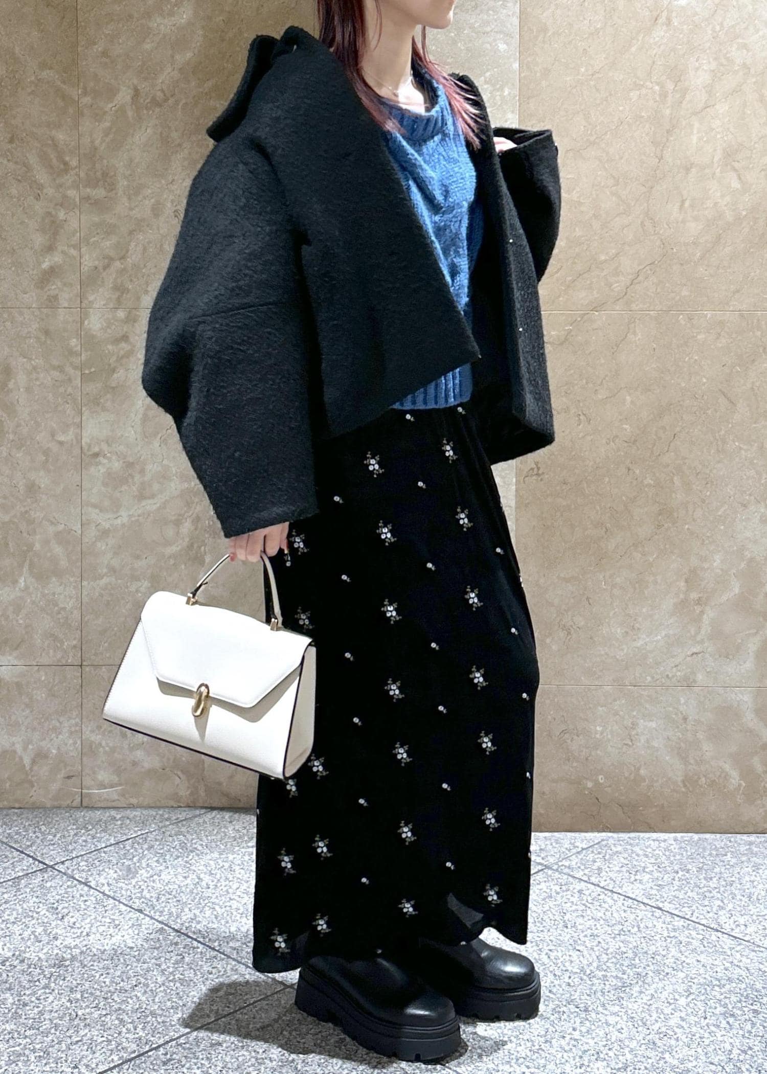 花柄のベロアワンピの上からケーブルニットと、アウターにはモモンガショートコートを合わせてみました。
