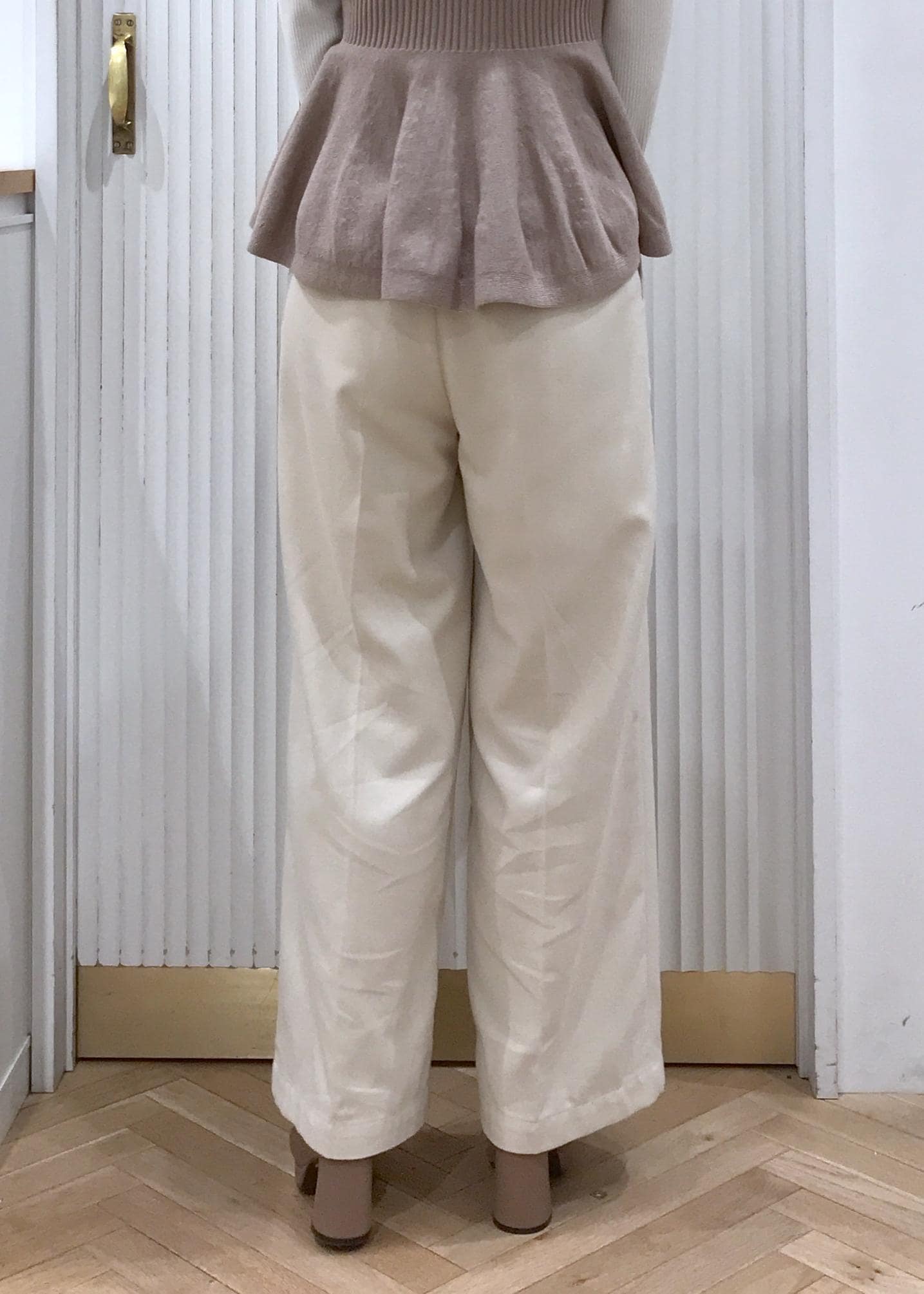 ややハイウエストで腰位置が高く見え、ベルトが付属で付いているので腰回りがスッキリ見えるシルエットです。
