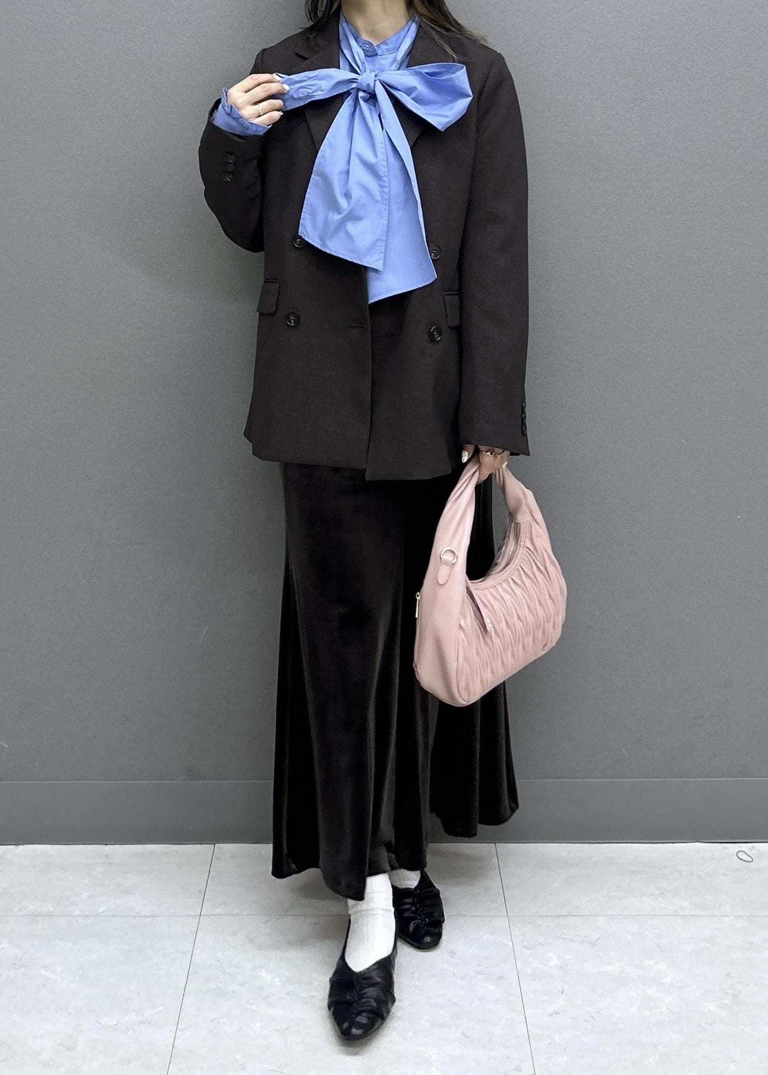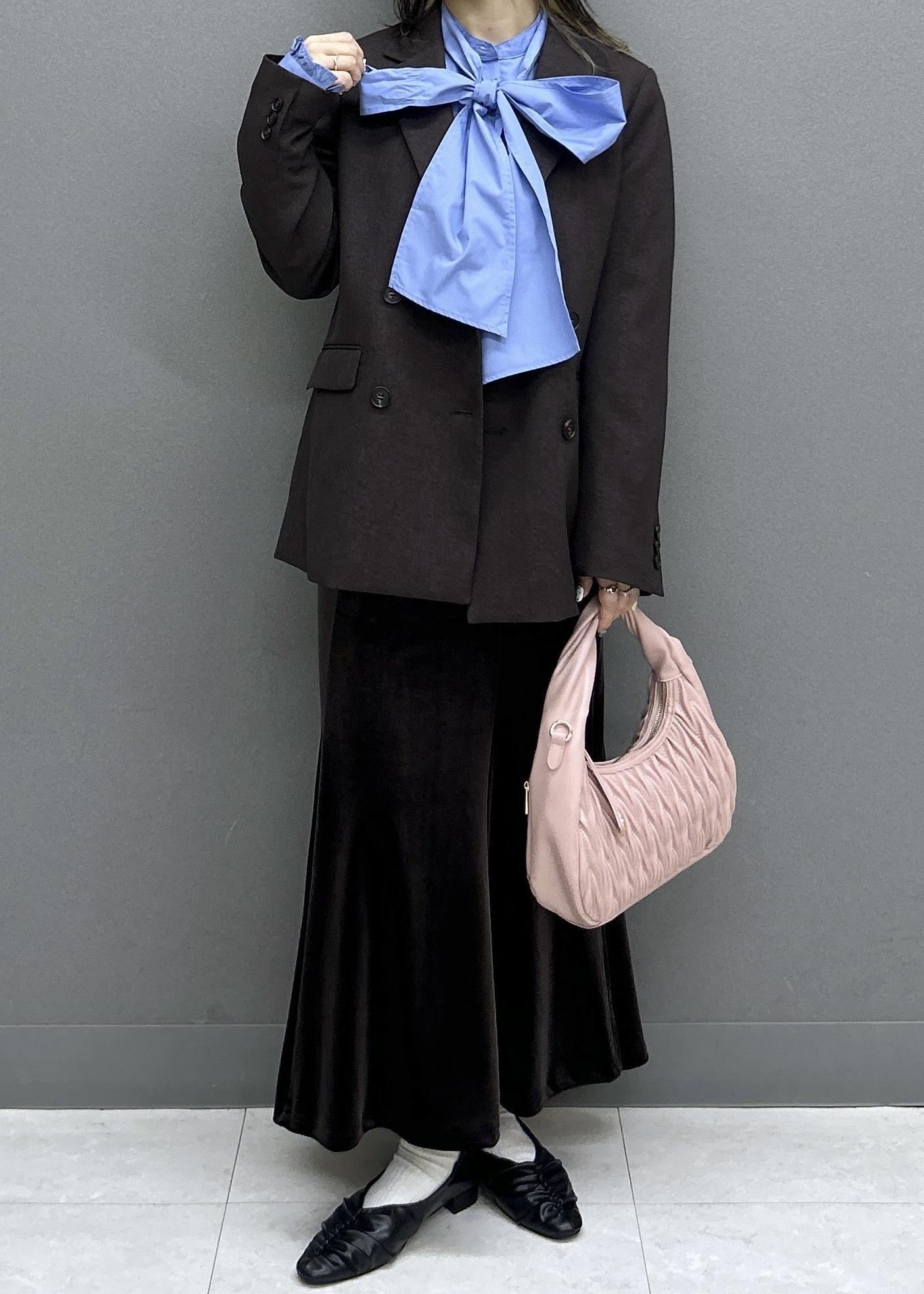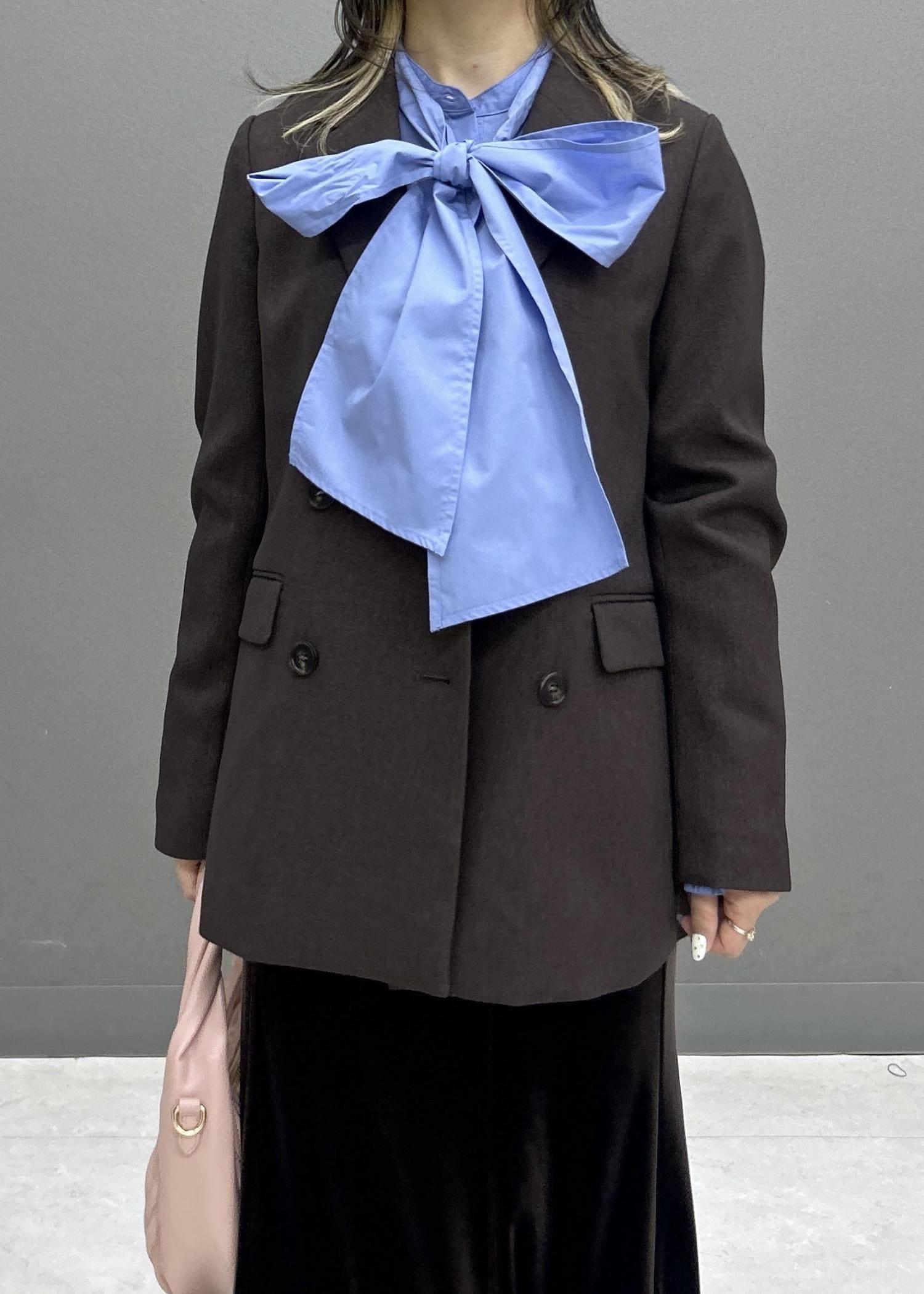サックスブルーのボウタイブラウスを主役にした、フェミニンジャケットスタイルです!