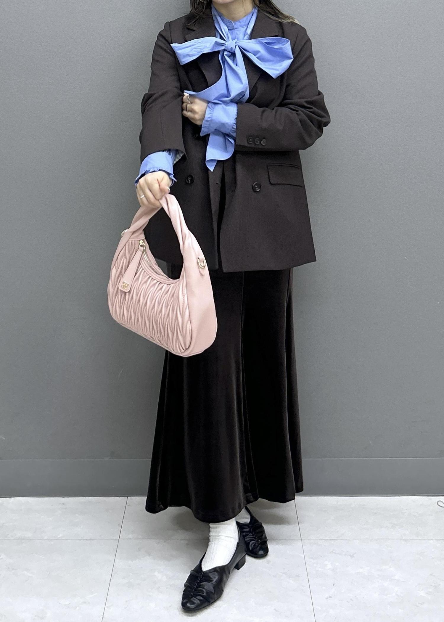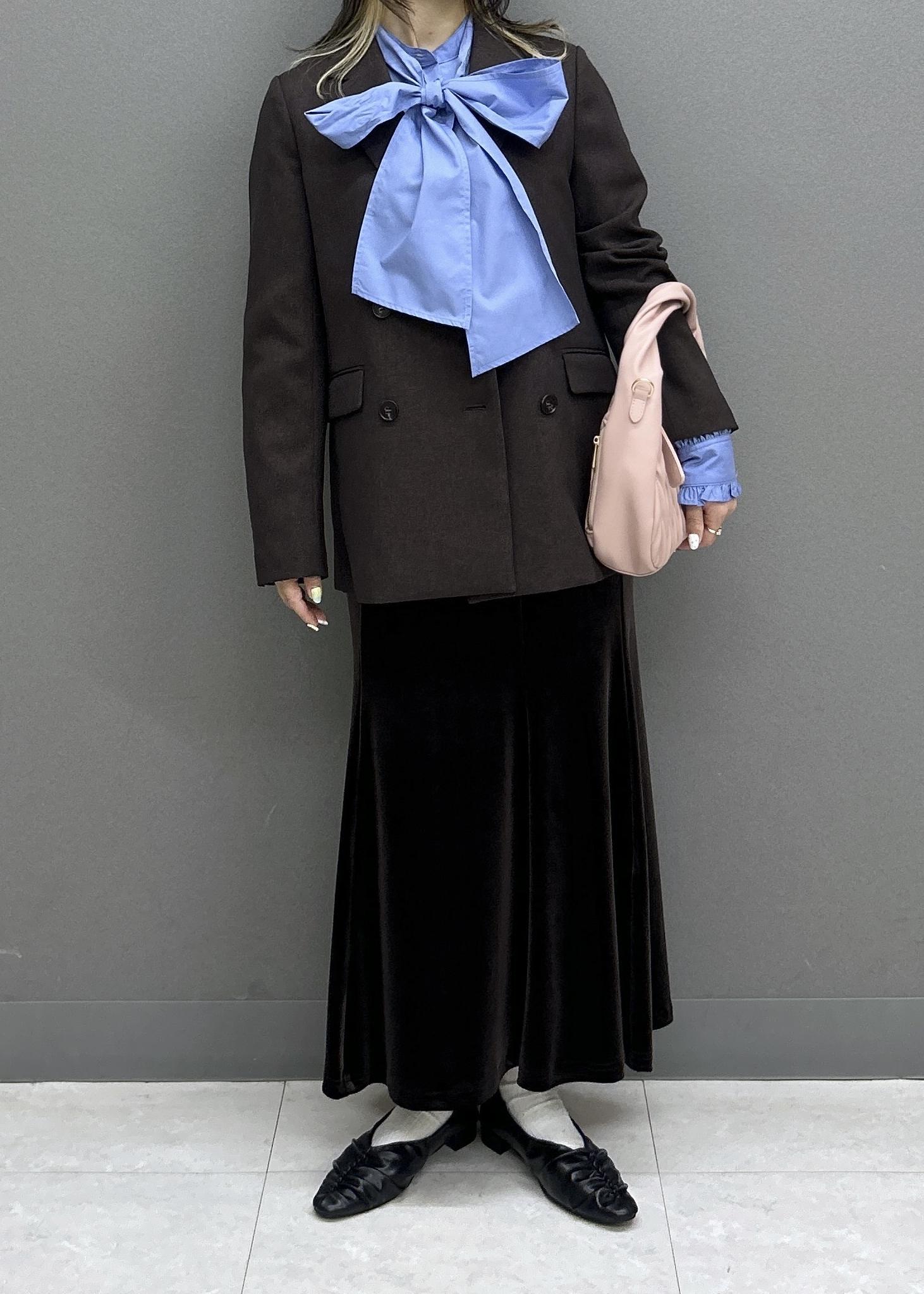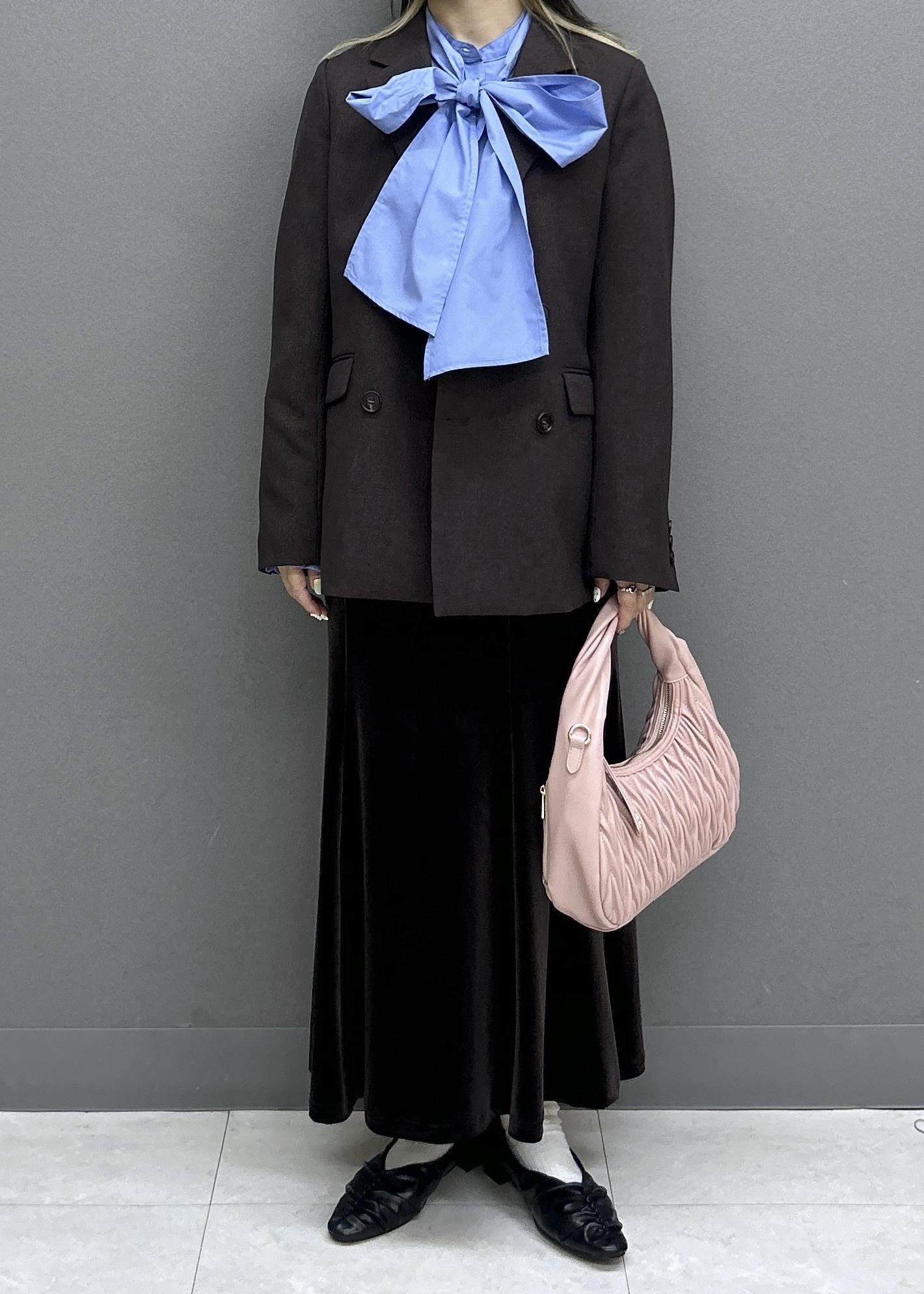 サックスブルーのボウタイブラウスを主役にした、フェミニンジャケットスタイルです!