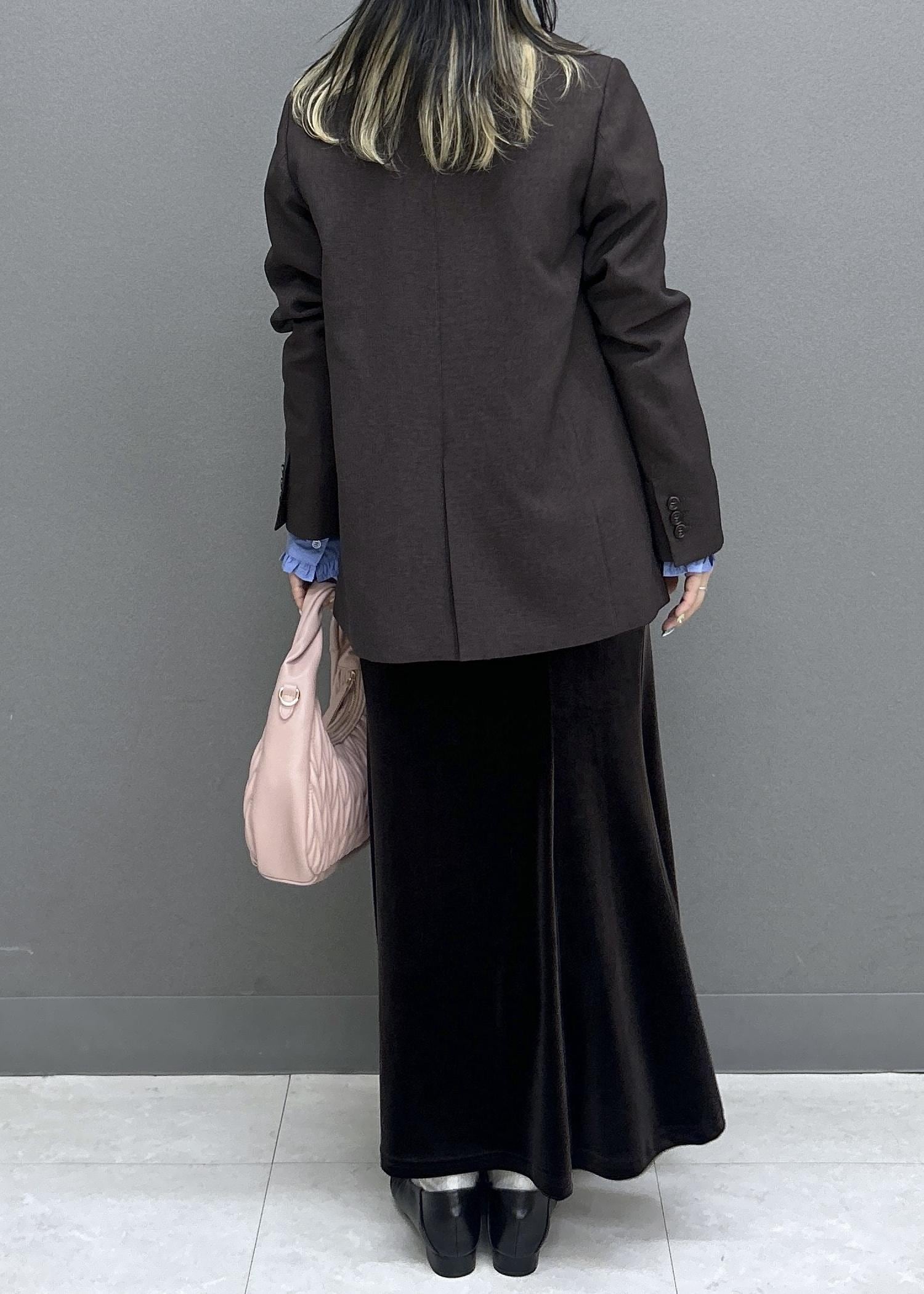 セットアップ対応のジャケットは、あえての異素材スカートあわせでこなれ感を◎