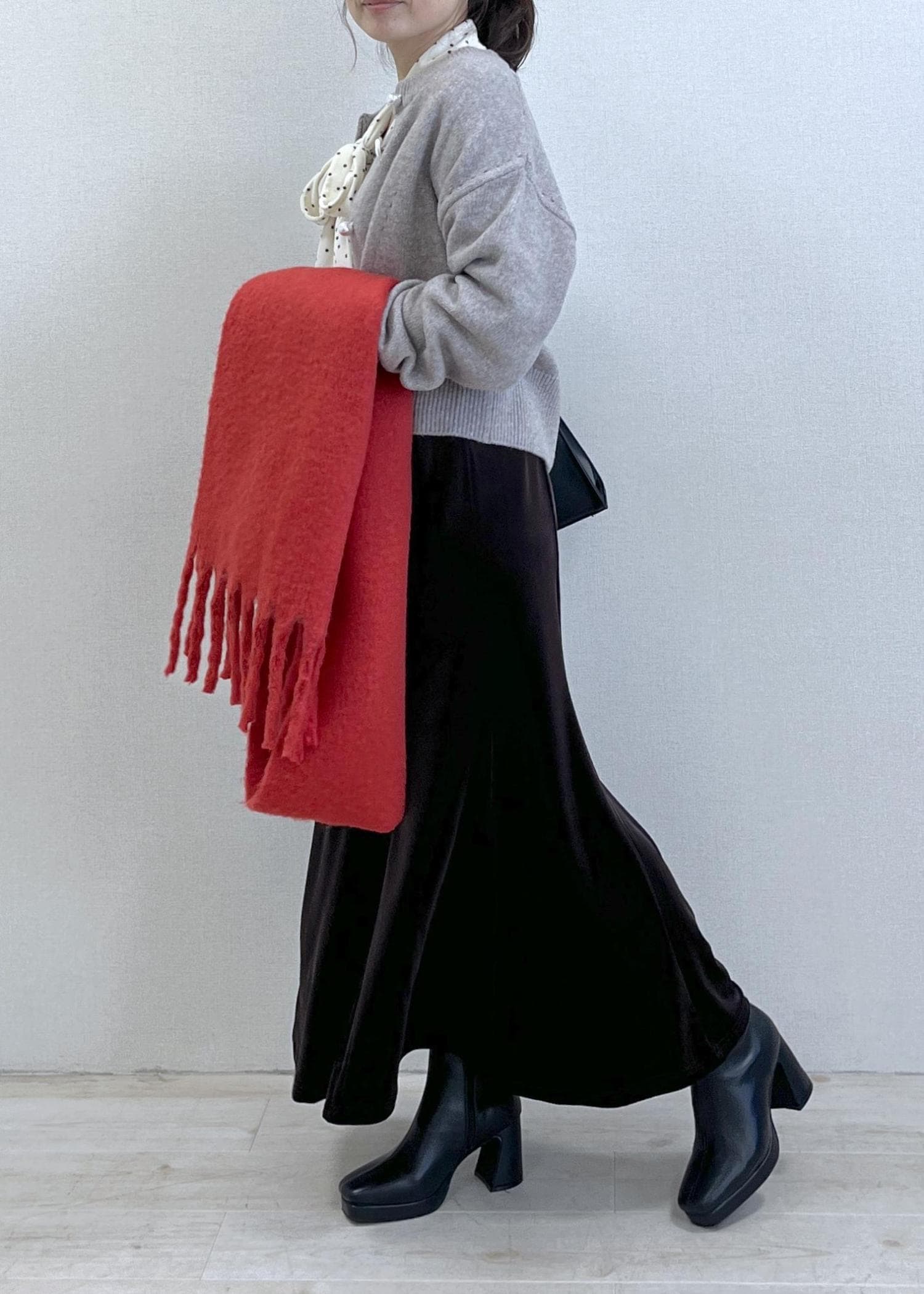 差し色のレッドストールを入れると、冬の雰囲気にぐっと華やぎが出ておすすめです◎