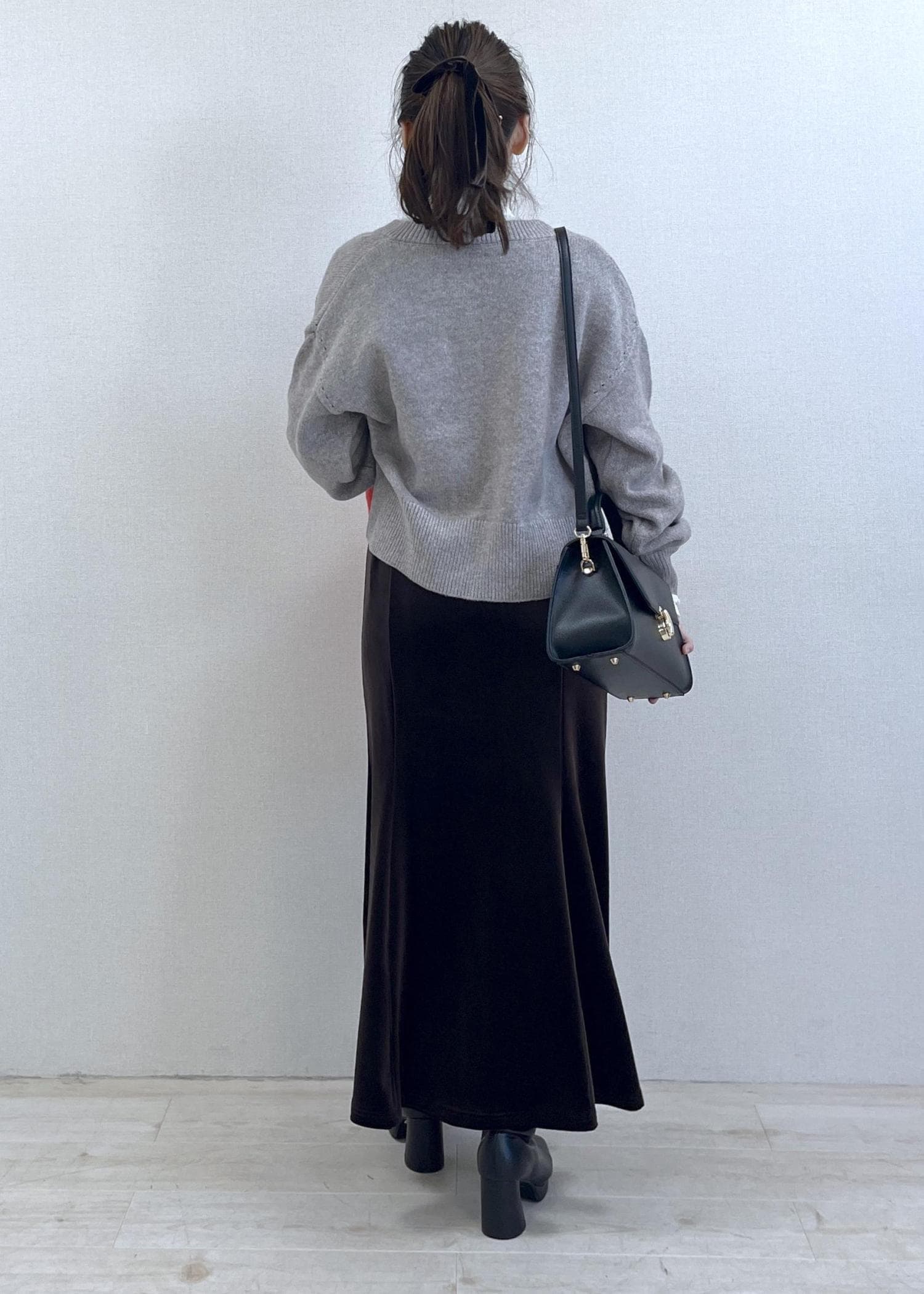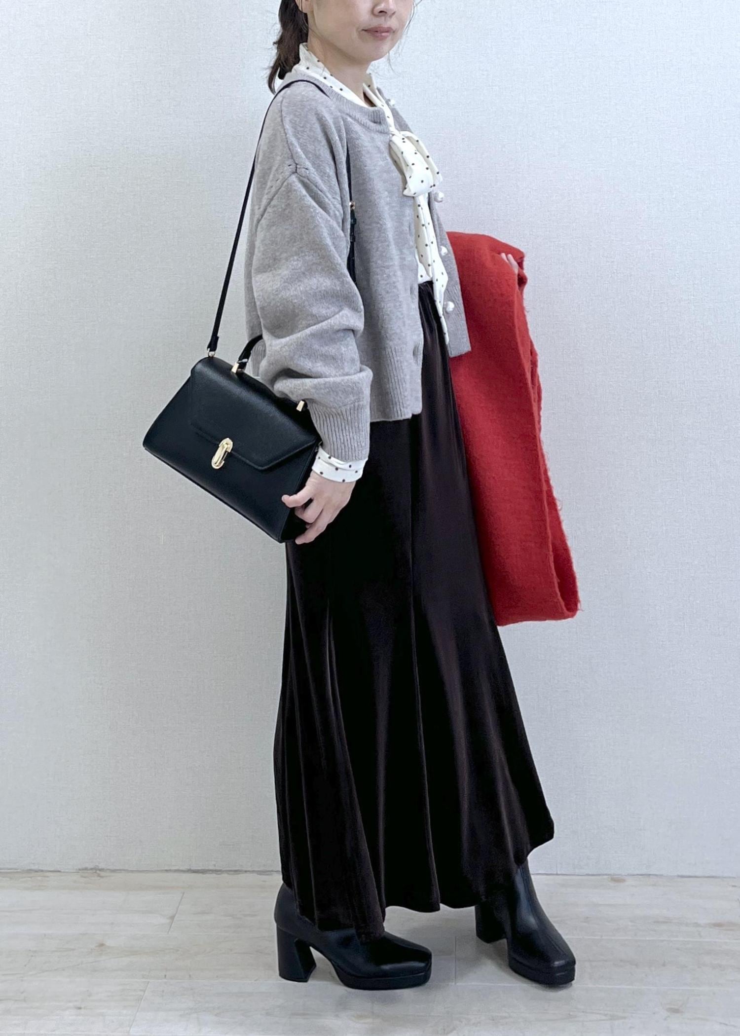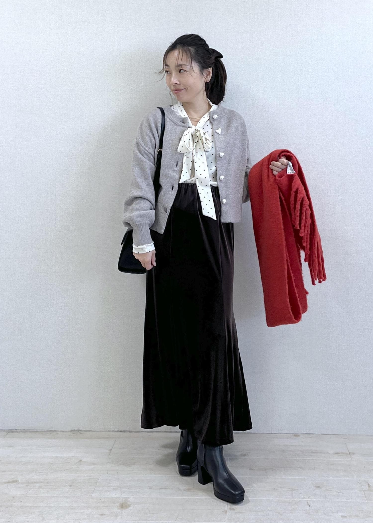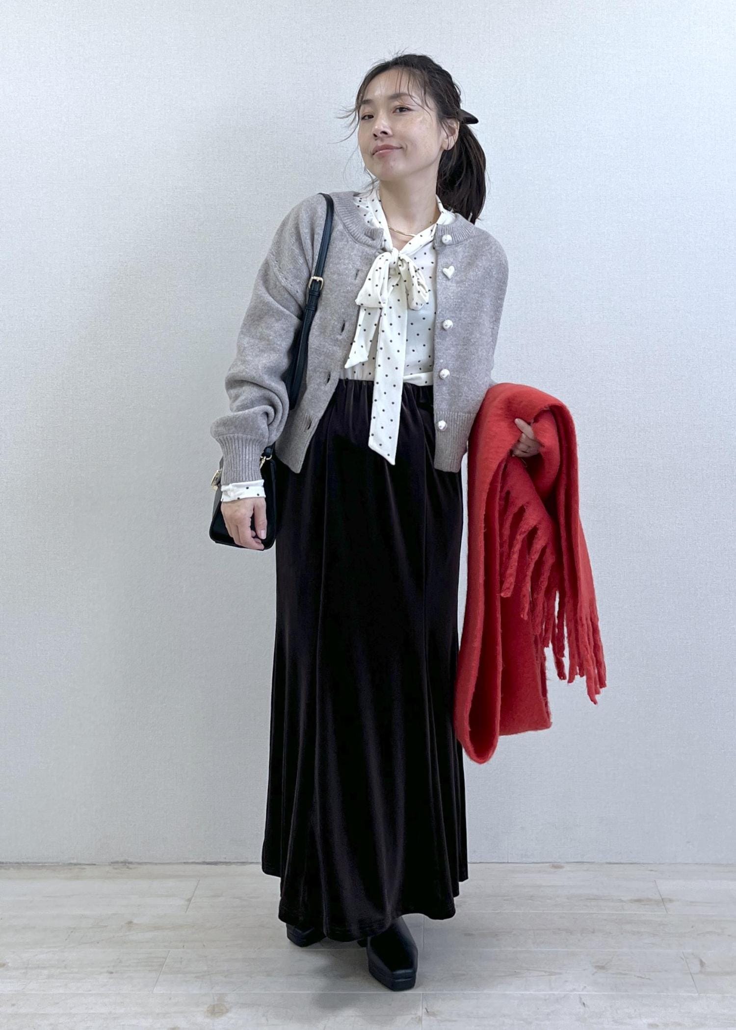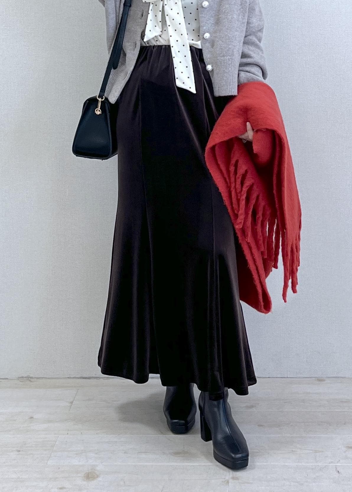 甘めのアイテム同士だけど、落ち着いたブラウンのベロアスカートで全体が一気に上品な印象にまとまります。