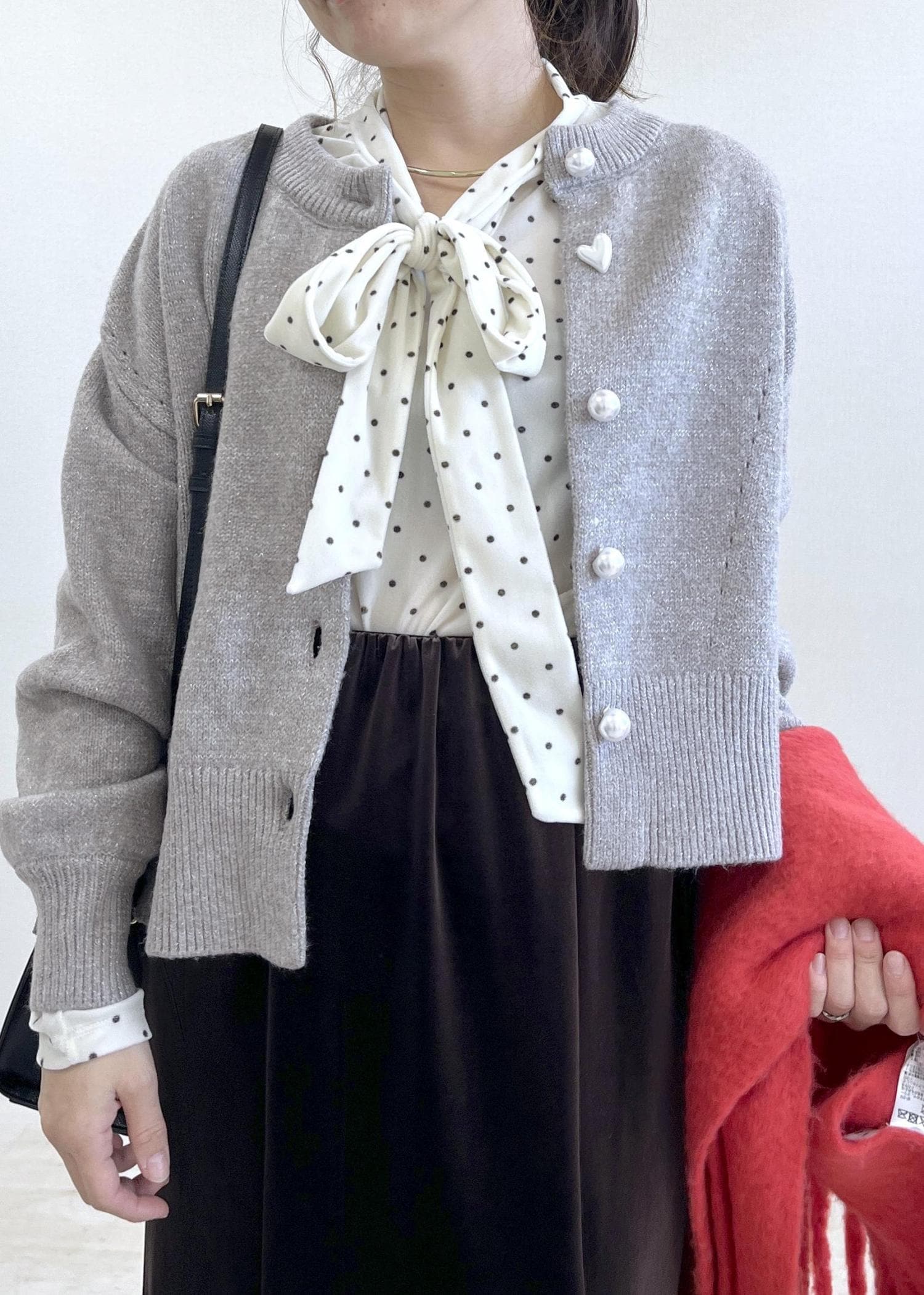 ドットのボウタイカットソーに、ハートボタンのカーデを合わせた大人のガーリーコーデ。