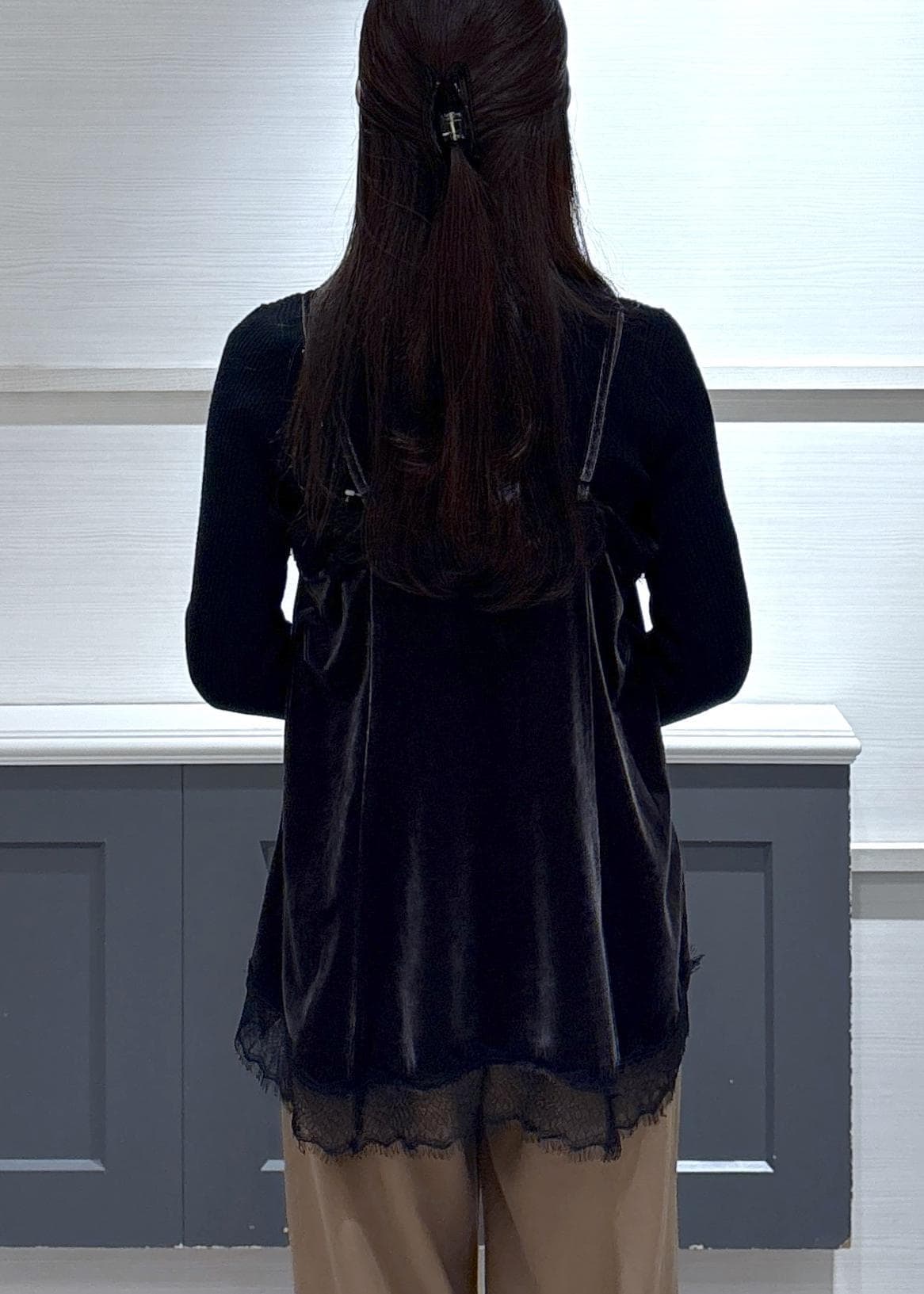 VISベロアレースキャミチュニックチャコール / F¥5,489レビュー156cmでヒップがほとんど隠れる丈感でした。