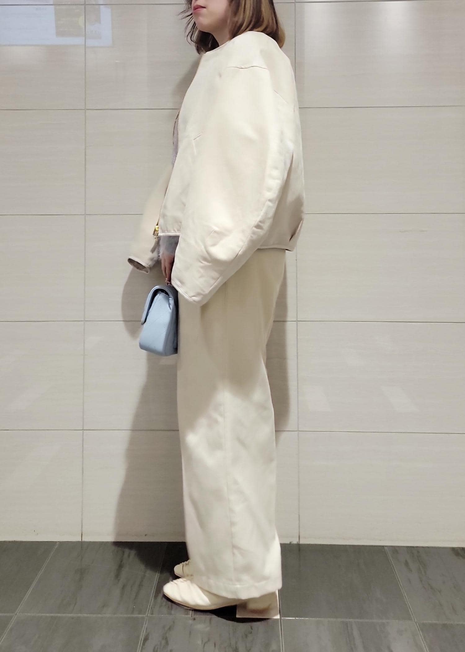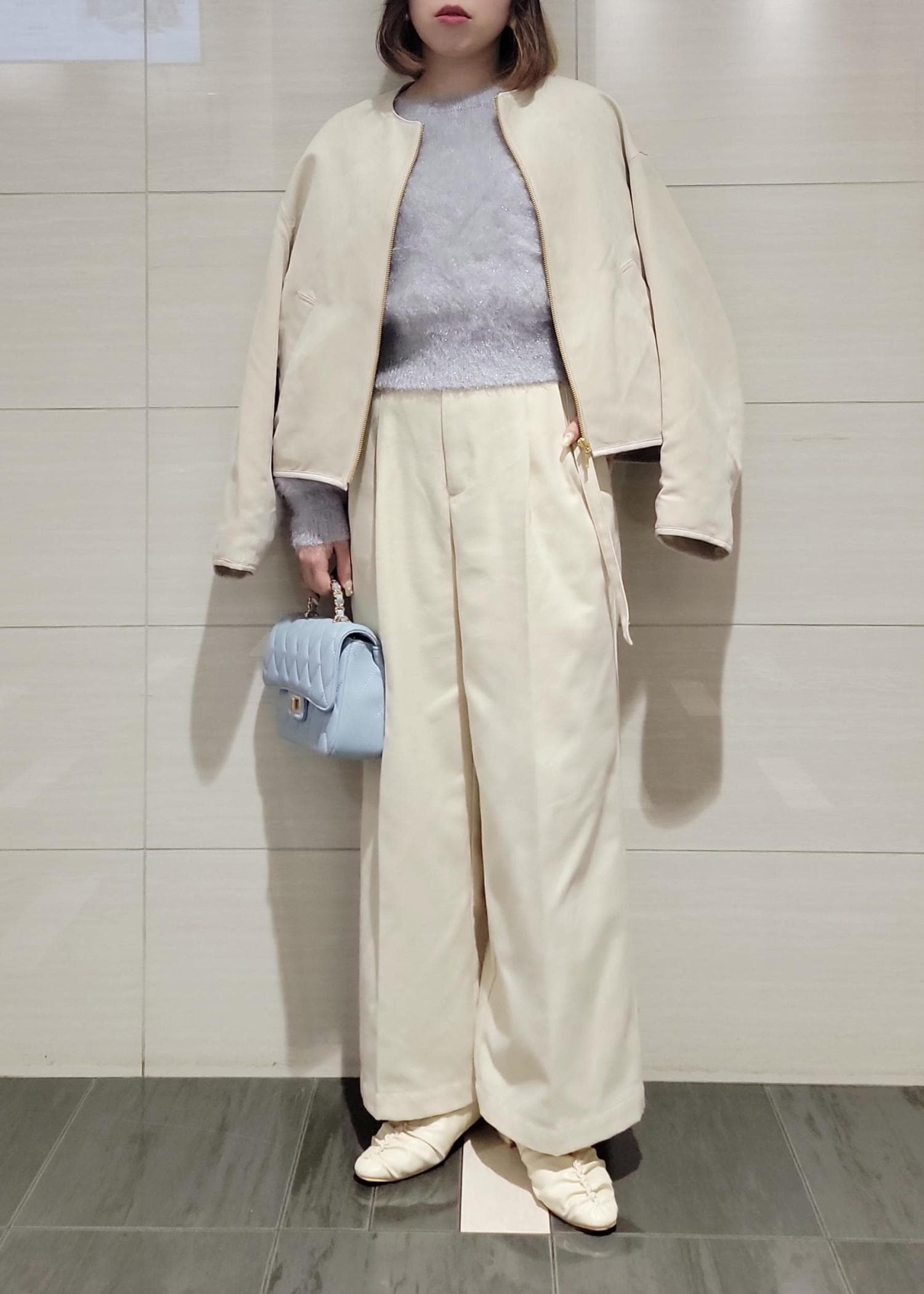 ホワイトベースのコーディネートにブルーをポイントに取り入れ、シンデレラカラーコーデにしました♪