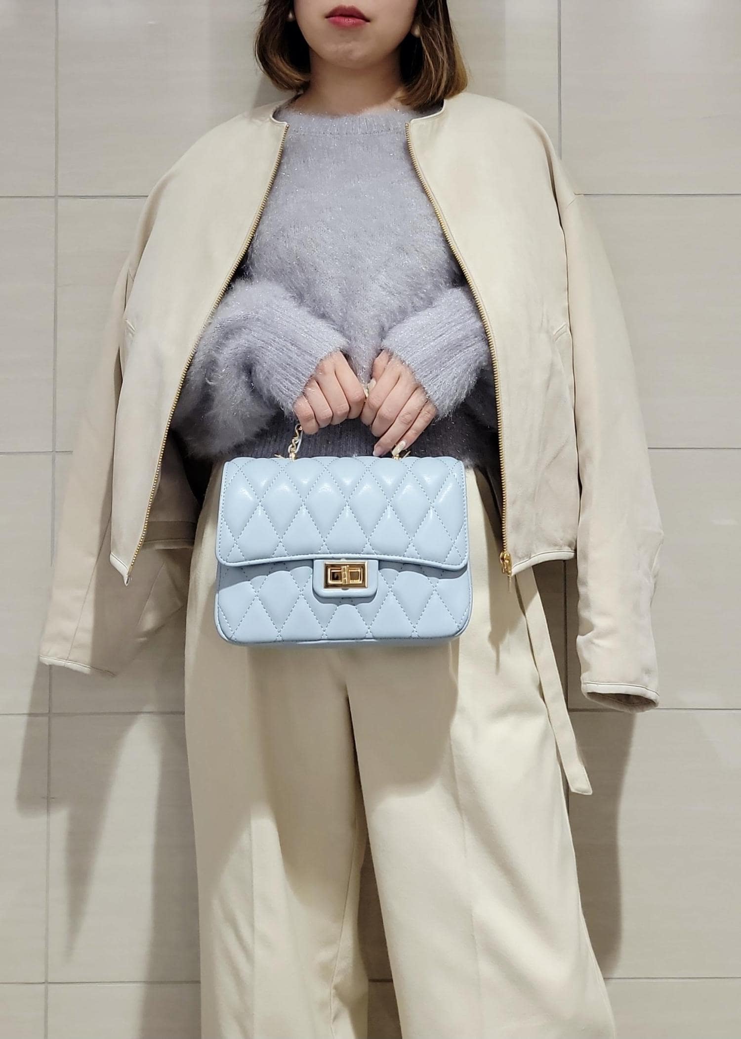長財布が収まるサイズ感で、キルティングデザイン+ひねり金具で高見え◎なバッグです♪ -