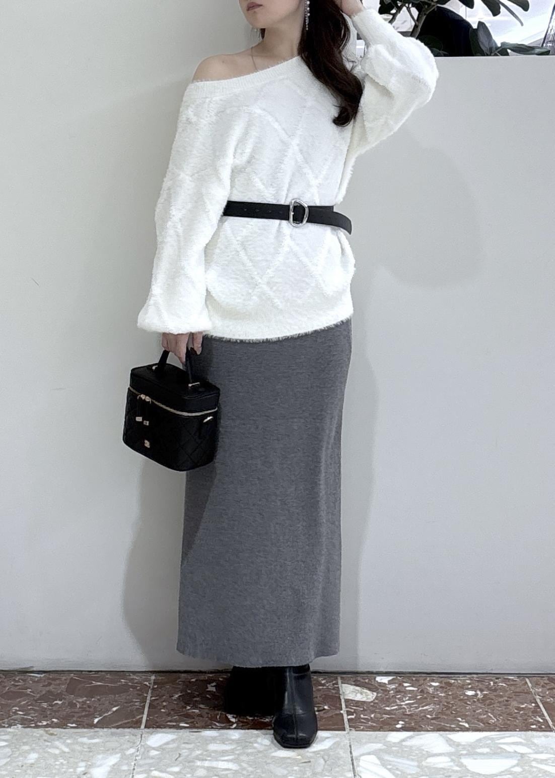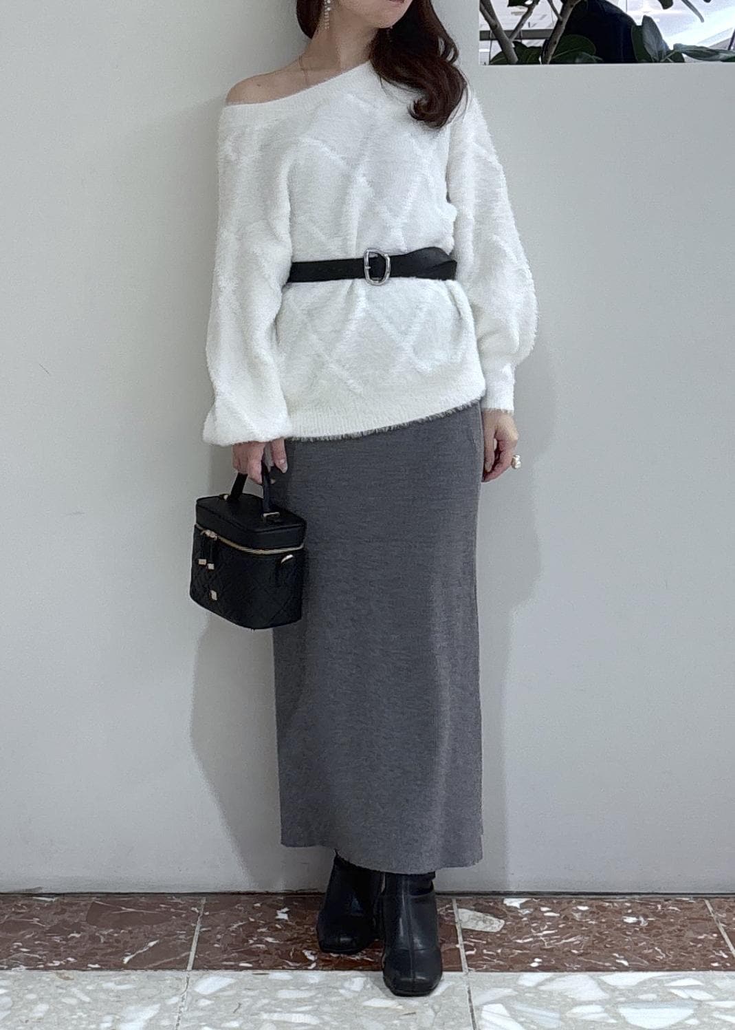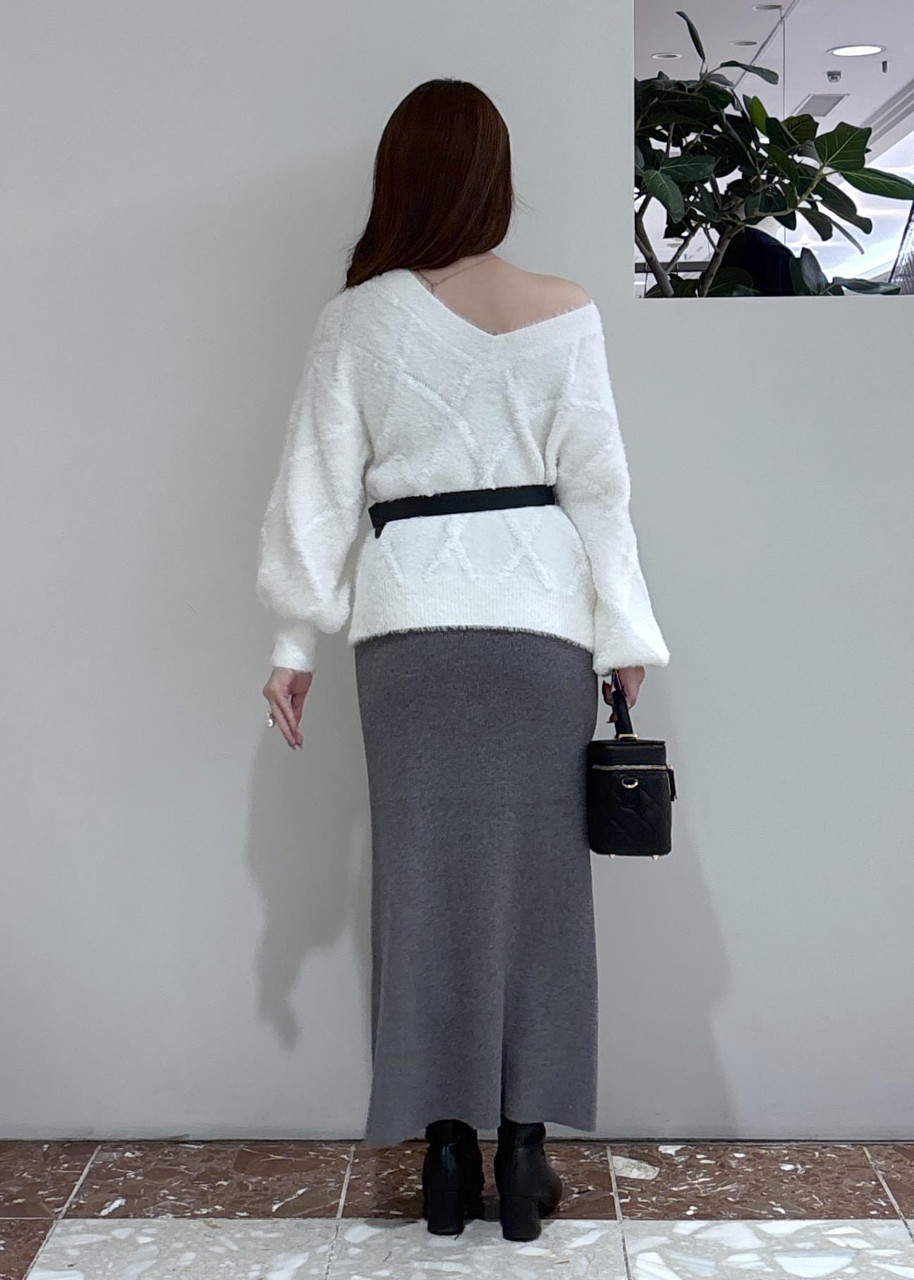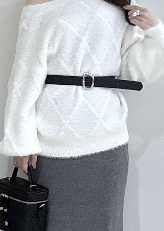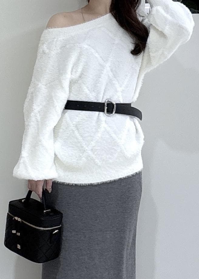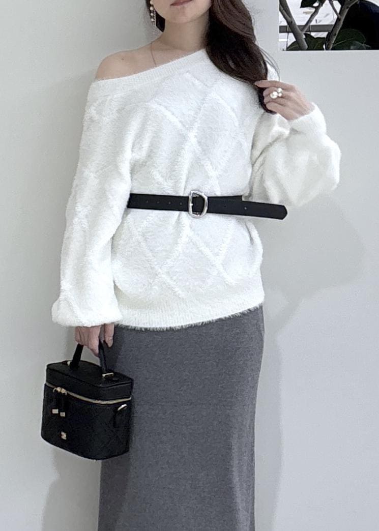 VISアーガイルフェザーニット/2WAY・イージーケアオフホワイト / F¥6,589レビュー前後2waで印象を変えて着用できる1枚。もちっとしたニットはチクチク感はなくゆるっと着心地も良かったです◎
