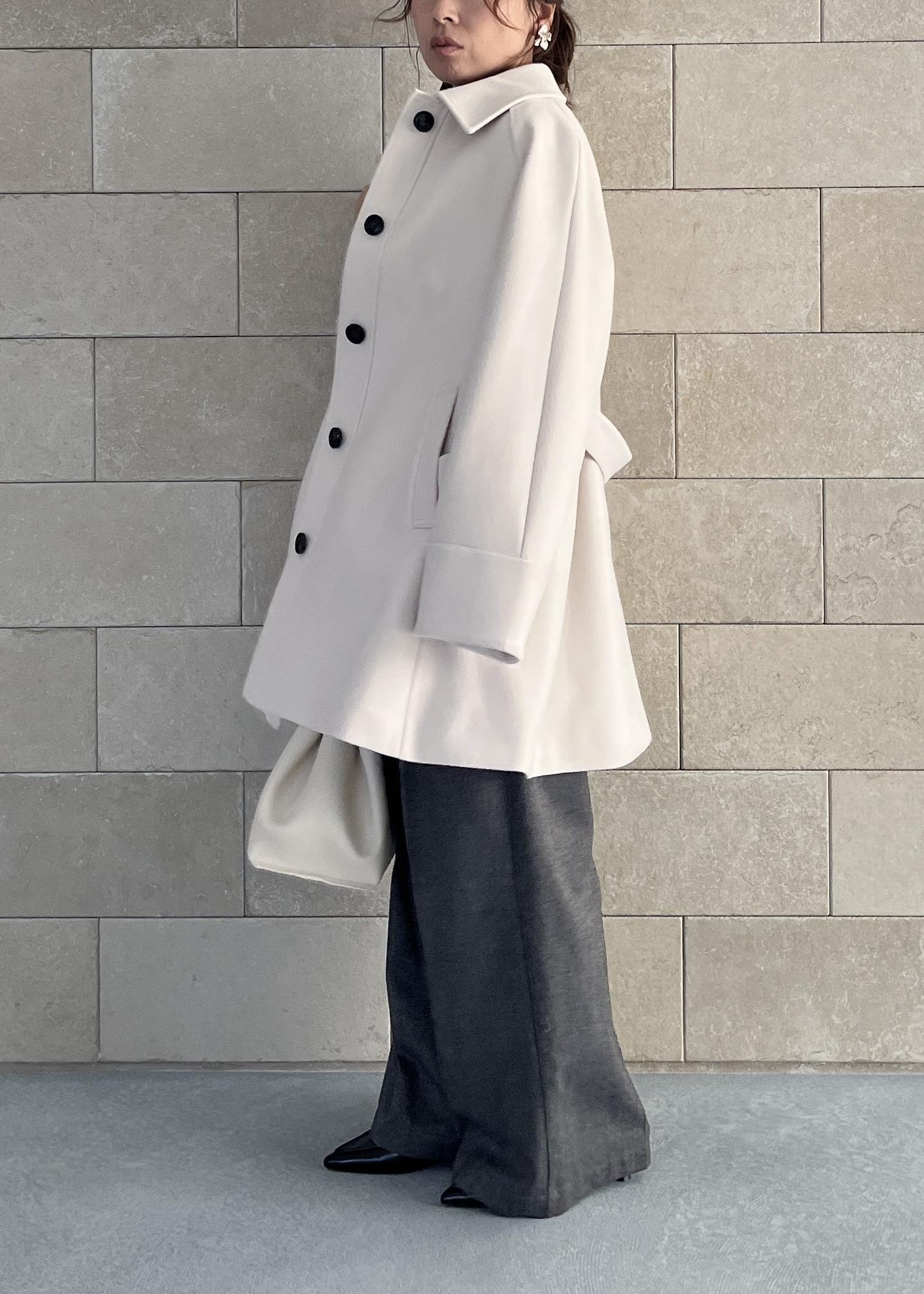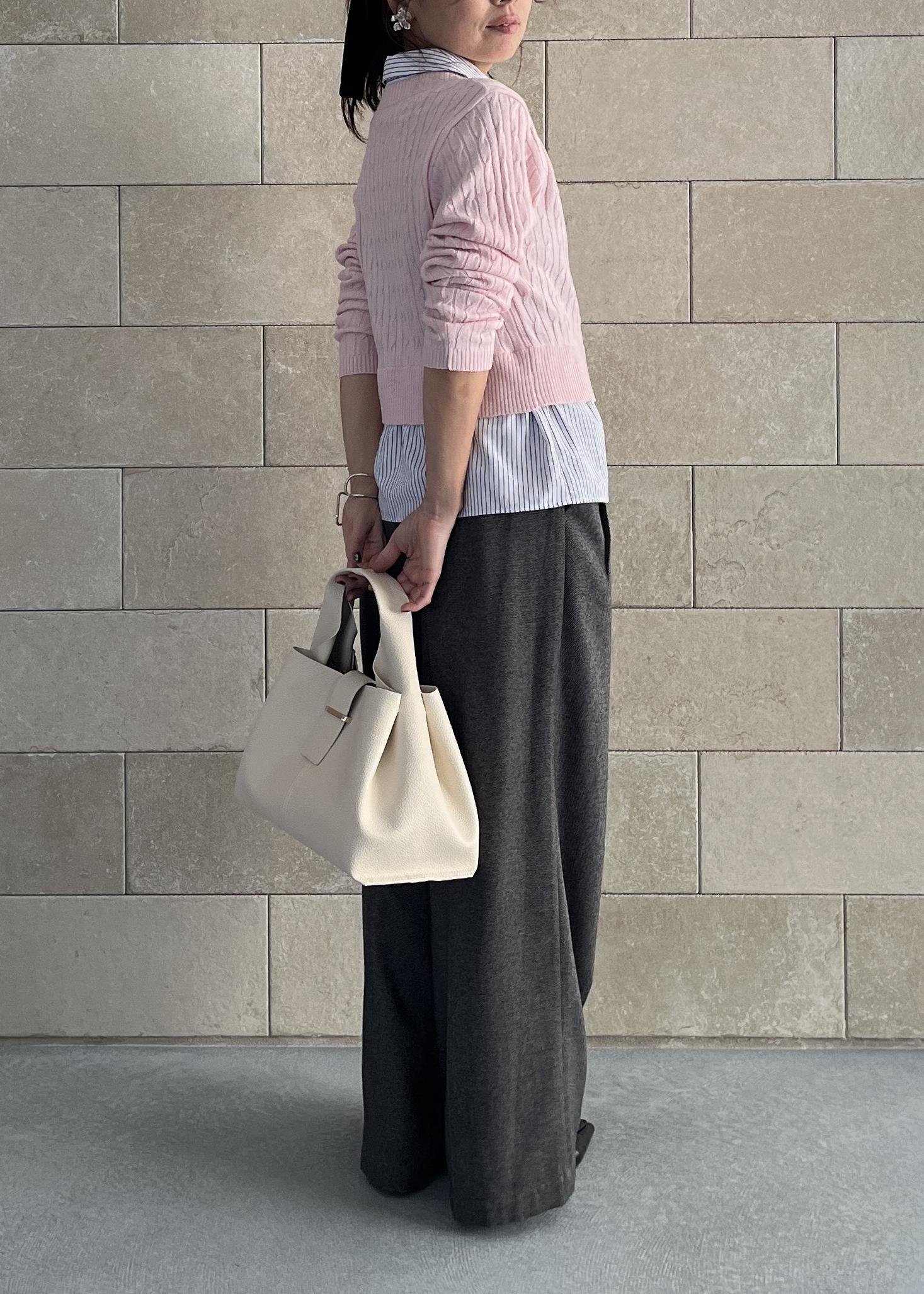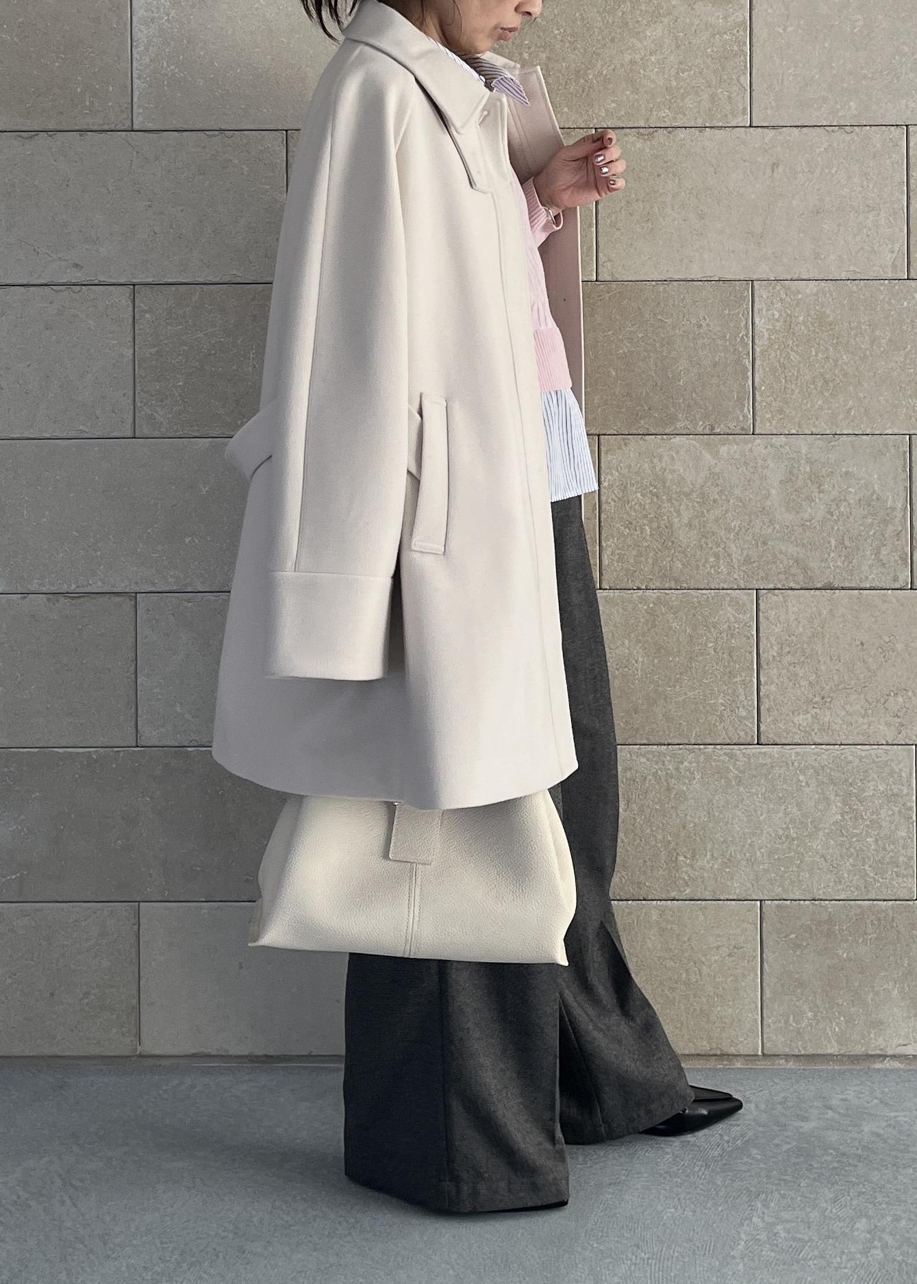 白のミドル丈アウターとバッグを合わせて、全体は軽やかな印象にまとめました。
