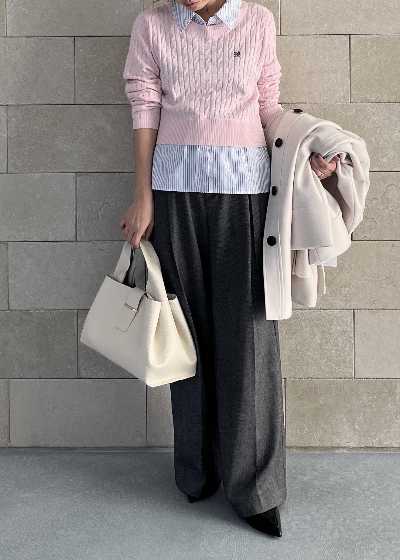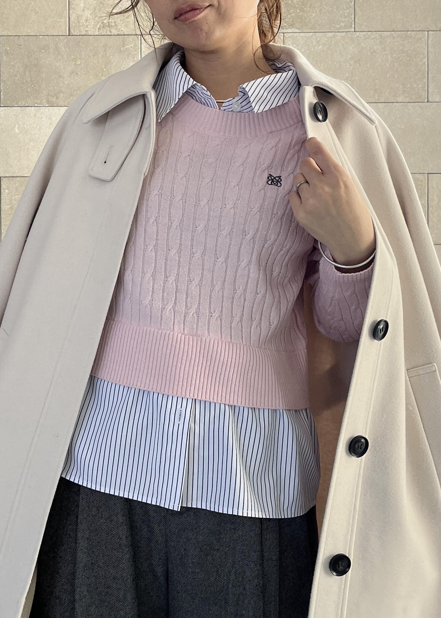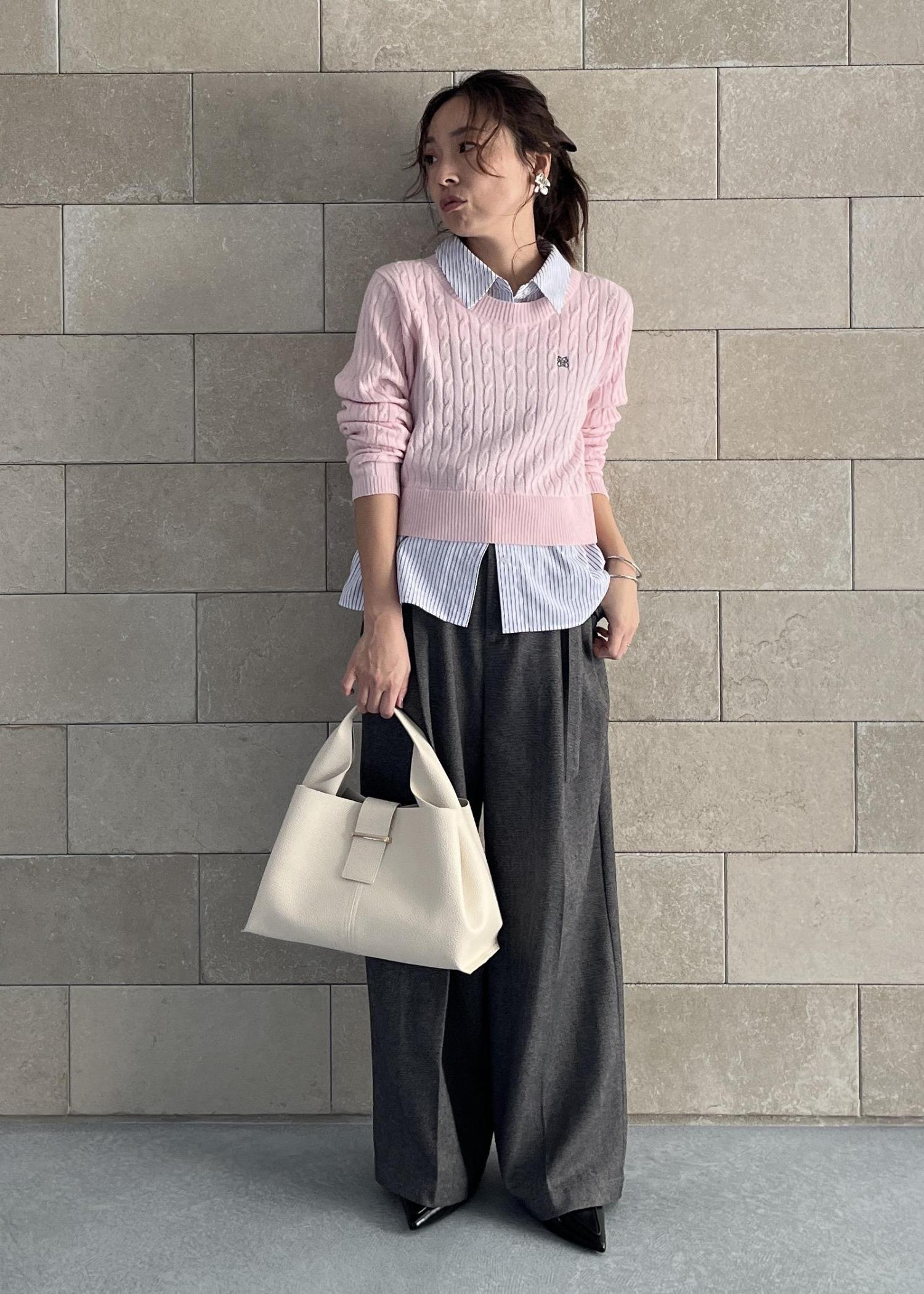 ストライプシャツがドッキングしたニットで、着るだけでレイヤード風に決まる優秀アイテム 。ピンクでも甘くなりすぎず、顔まわりが明るく見えるのが嬉しいポイントです。