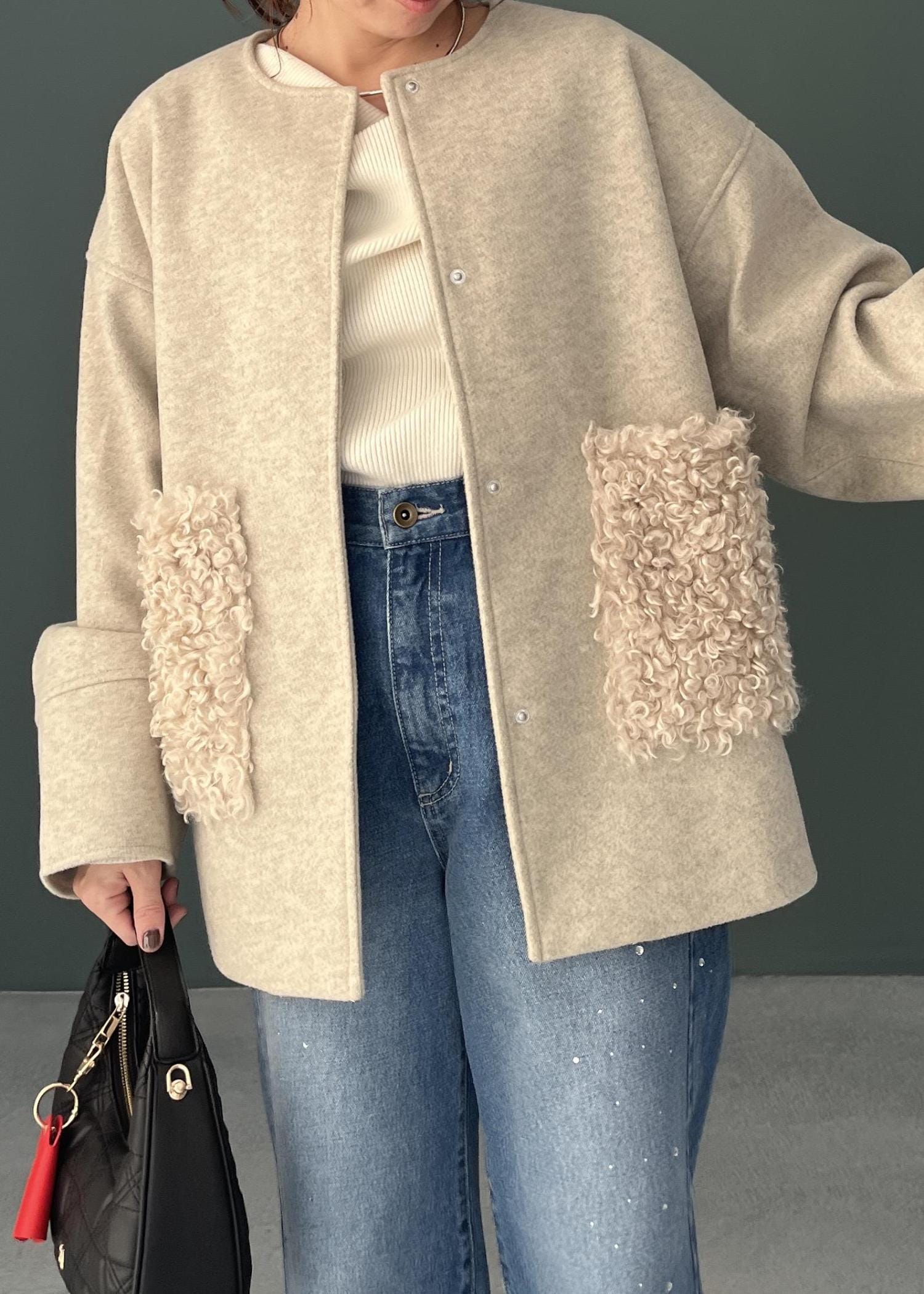 NEW!VIS【WEB限定】ボアポケットノーカラーコートキナリ / F¥15,180レビュー152cmで Fサイズ着用し、着丈はお尻が隠れる長め丈。オーバーサイズなので、インナーに厚手のニットもOK!ポケット部分のボアがいいアクセントに!