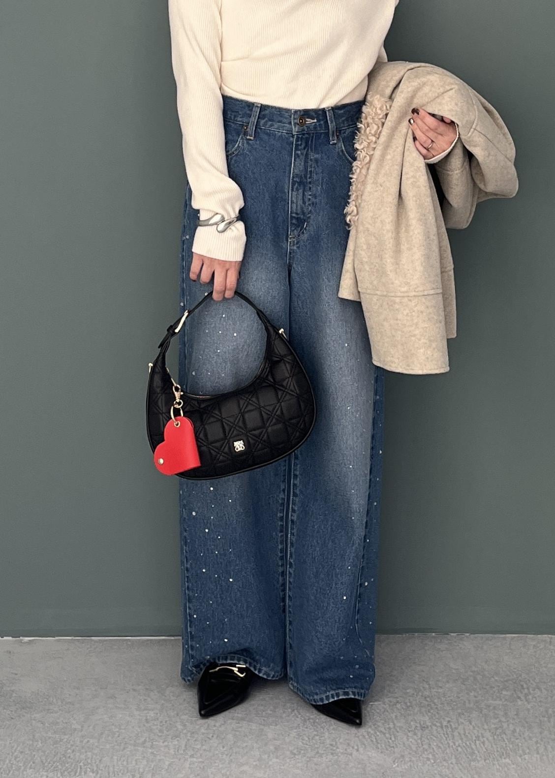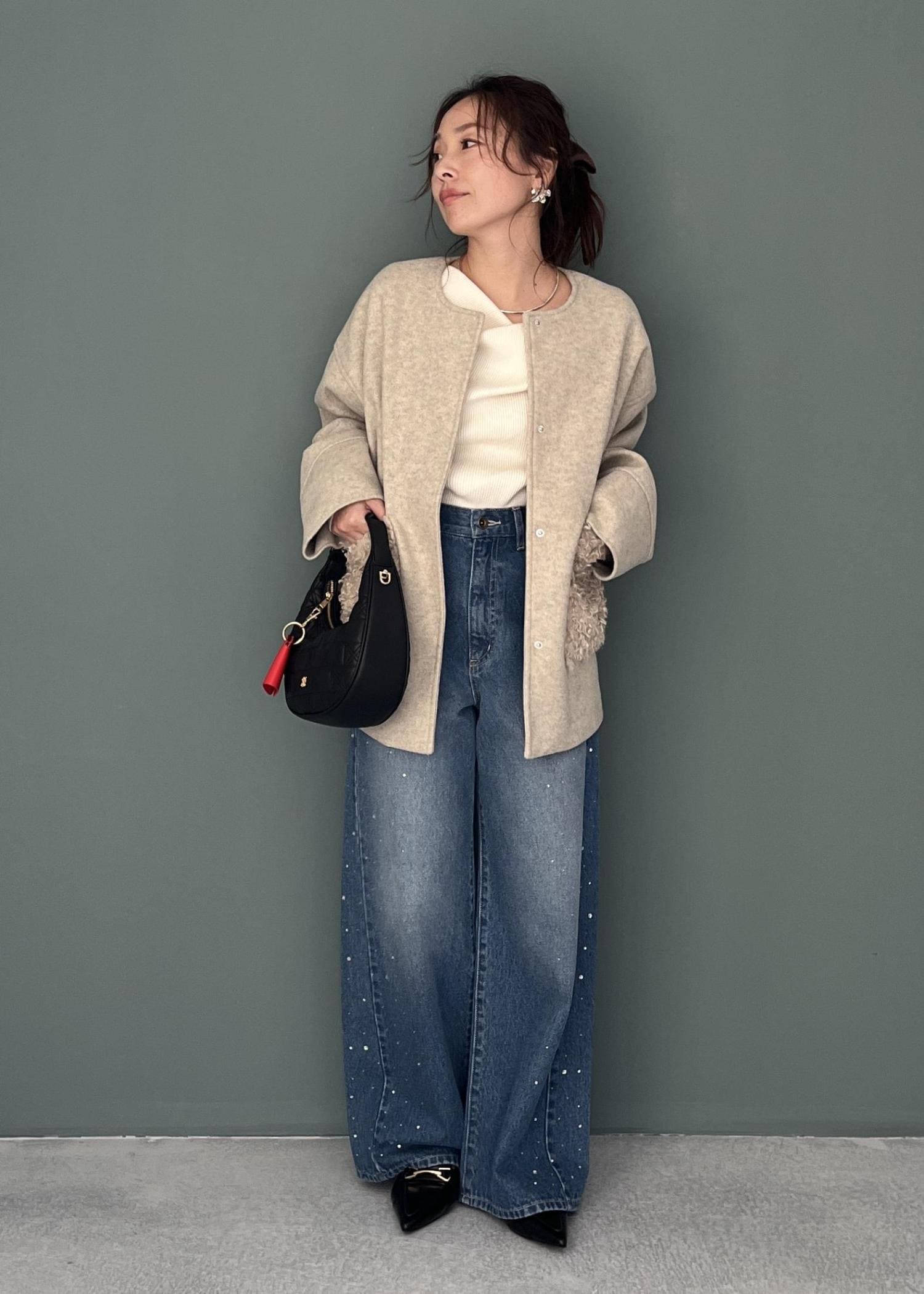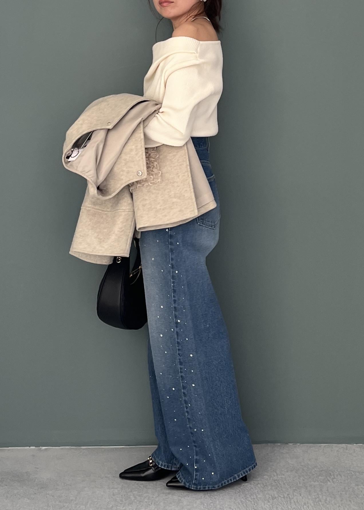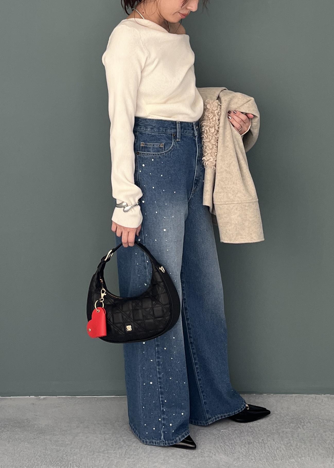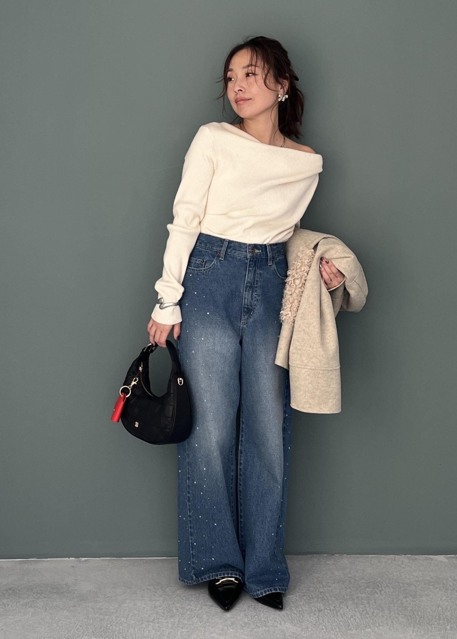 白のドレープニットに、ラインストーン付きデニムを合わせてさりげない華やかさを。デニムでもカジュアルになりすぎず、きちんと感のある印象に仕上げました。