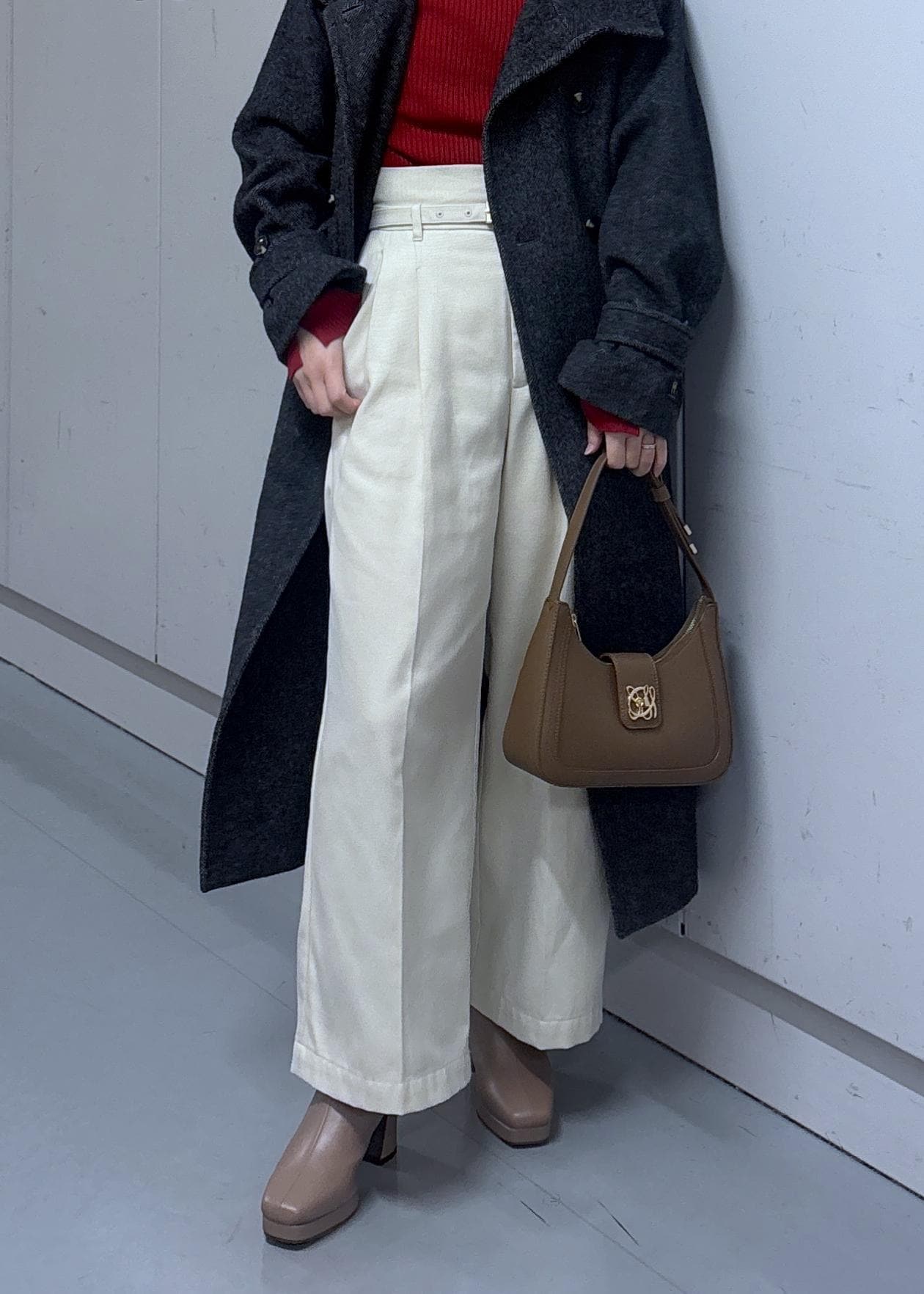 VIS起毛ウールライク版ベルトディテールタックワイドパンツキナリ / SS¥6,589レビュー156cm/SS着用。靴を履いてちょうどよい丈でウエストはジャストです。少しハリのある素材にセンタープレスが入っているのでキチンと見えができます‼︎ハイウエストなのでインスタイルでバランスアップも◎起毛素材であたたかくはけますよ♪