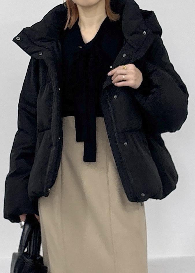 ボウタイリボンのニットとマーメイドスカートで合わせたきれいめスタイル♪寒くなって来たのでダウンジャケット暖かくまとめました◎冬にオススメの大人カジュアルコーデ。
