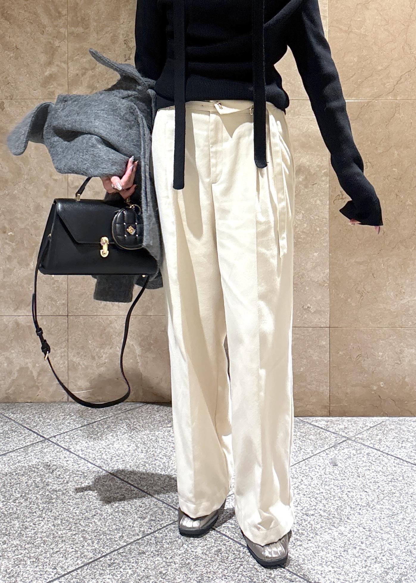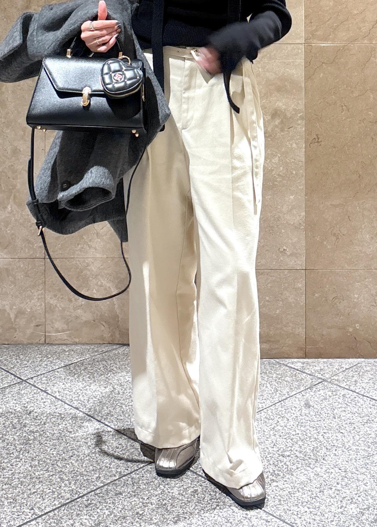 VIS起毛ウールライク版ベルトディテールタックワイドパンツキナリ / M¥6,589レビューベルトをおへその位置でしっかりハイウエストで履くと足首が出る丈ですが、へそ下で履いてもシルエットが崩れなかったので、敢えて腰で落として着丈長めに着用しています。