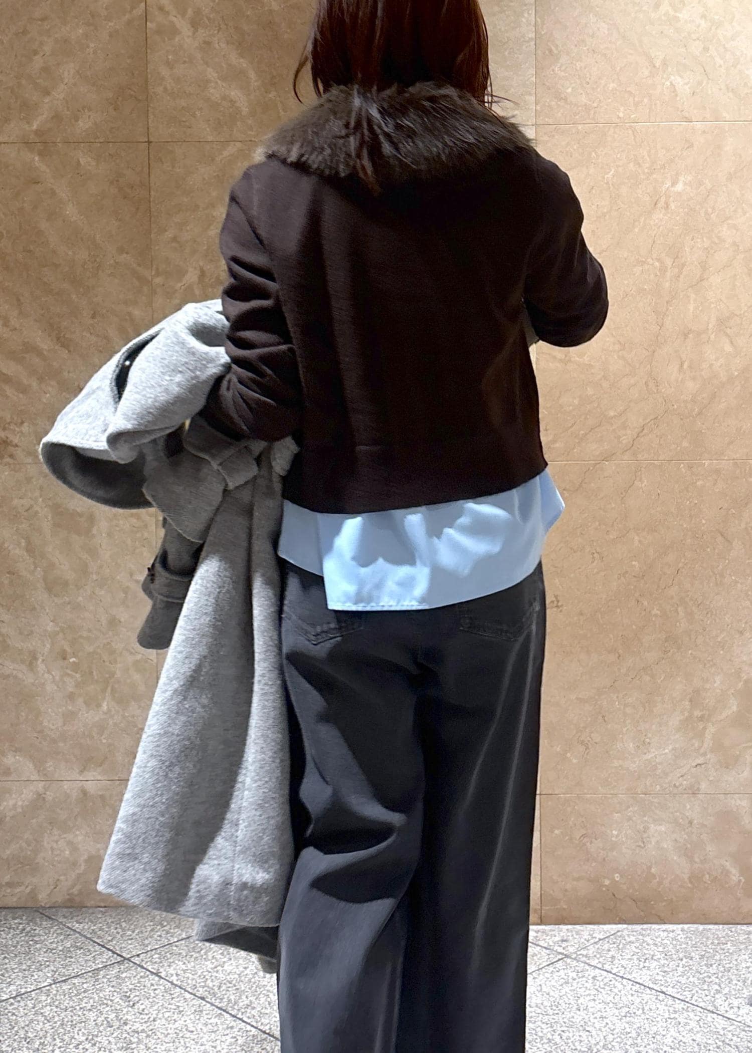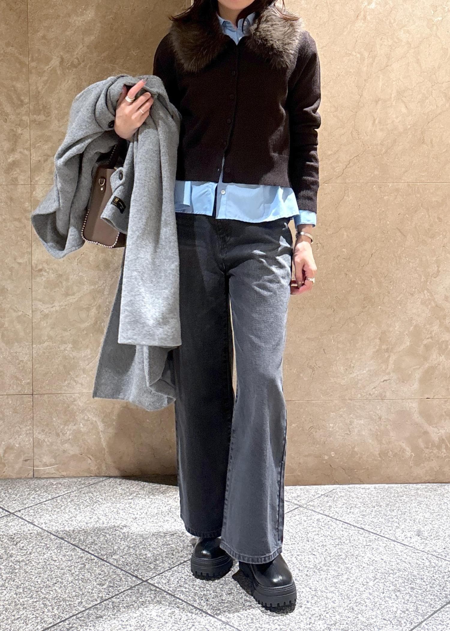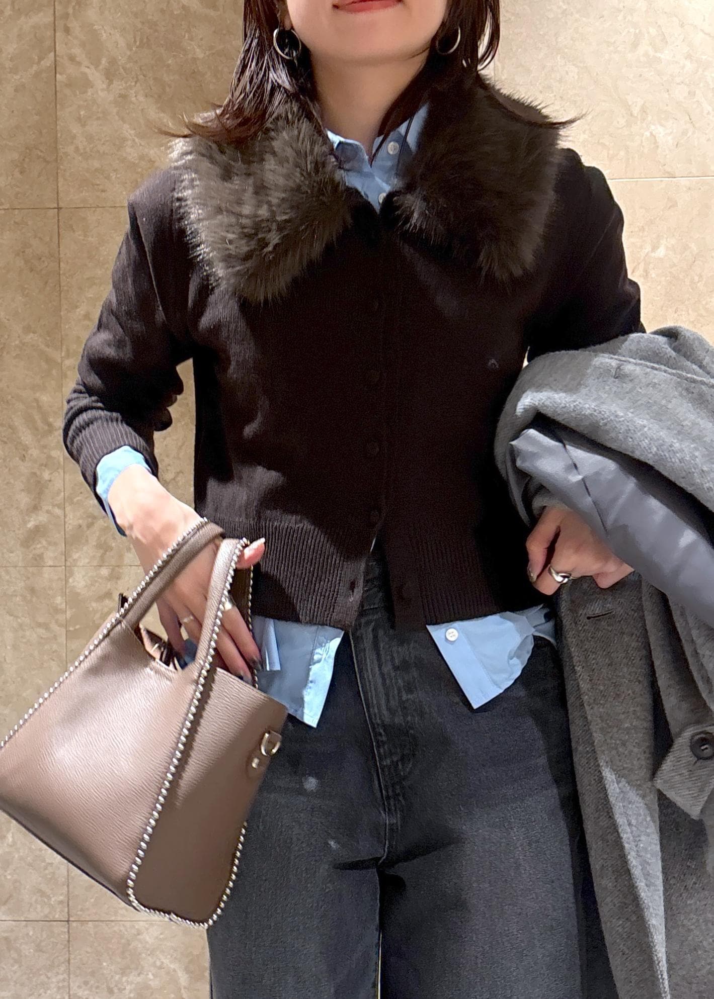 VIS衿ファー取り外しカーディガンダークブラウン / F¥6,589レビュー程よくスッキリ見えるサイズ感で、ニットの厚みも厚すぎずちょうど良いです。