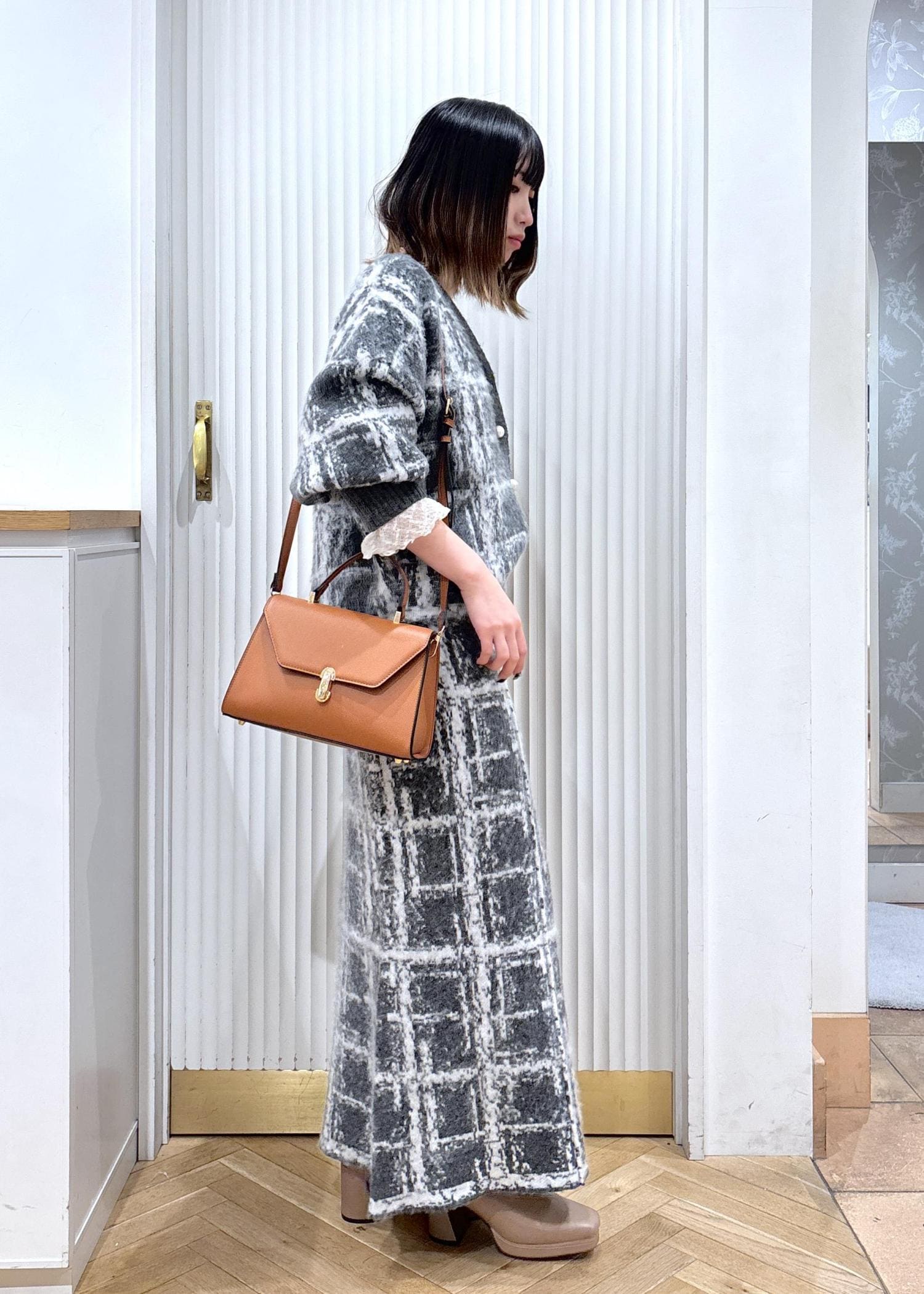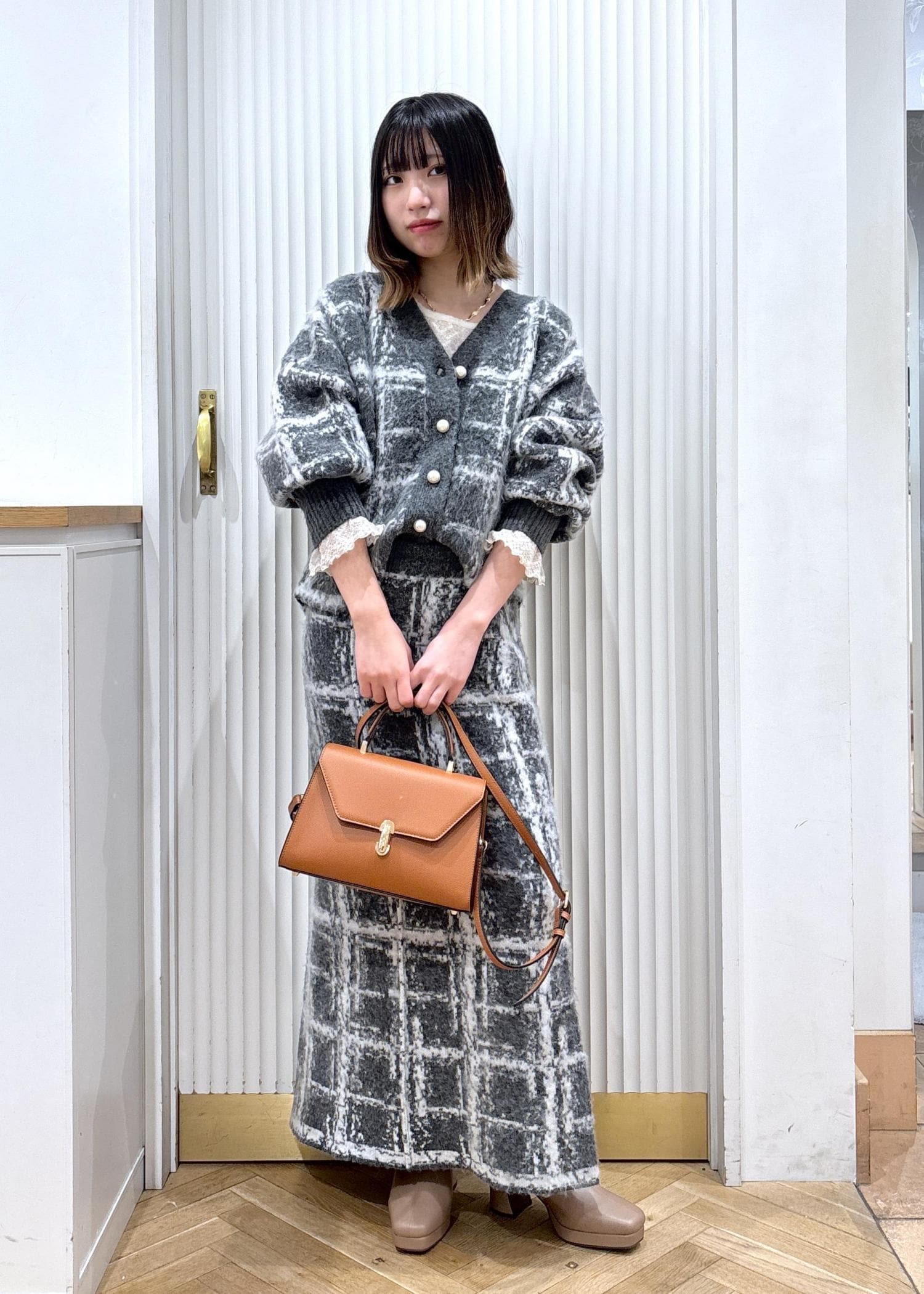 チェックのセットアップコーデ