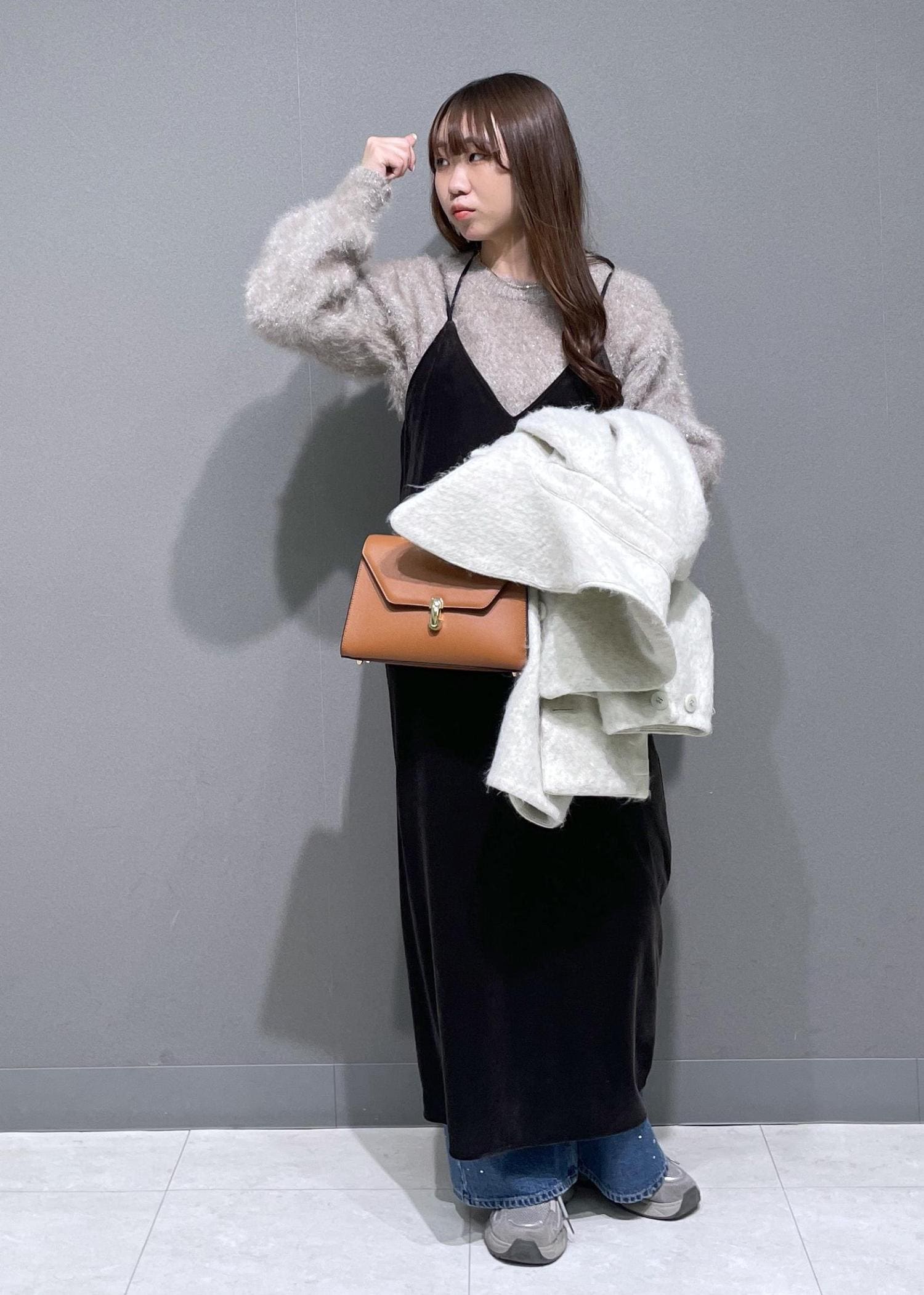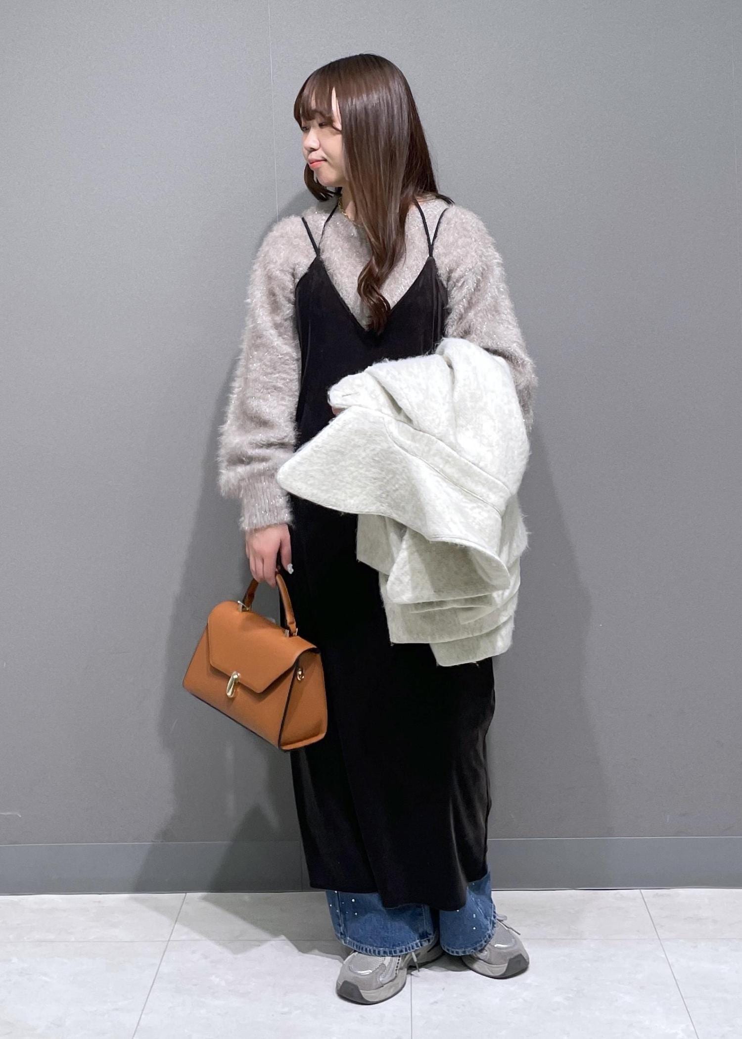 キラッとしたメタルシャギーが織り込まれており、華やかな雰囲気で着ていただけます。裾がリブになっているため、少し持ち上げてのウエストマークも可能です。 -