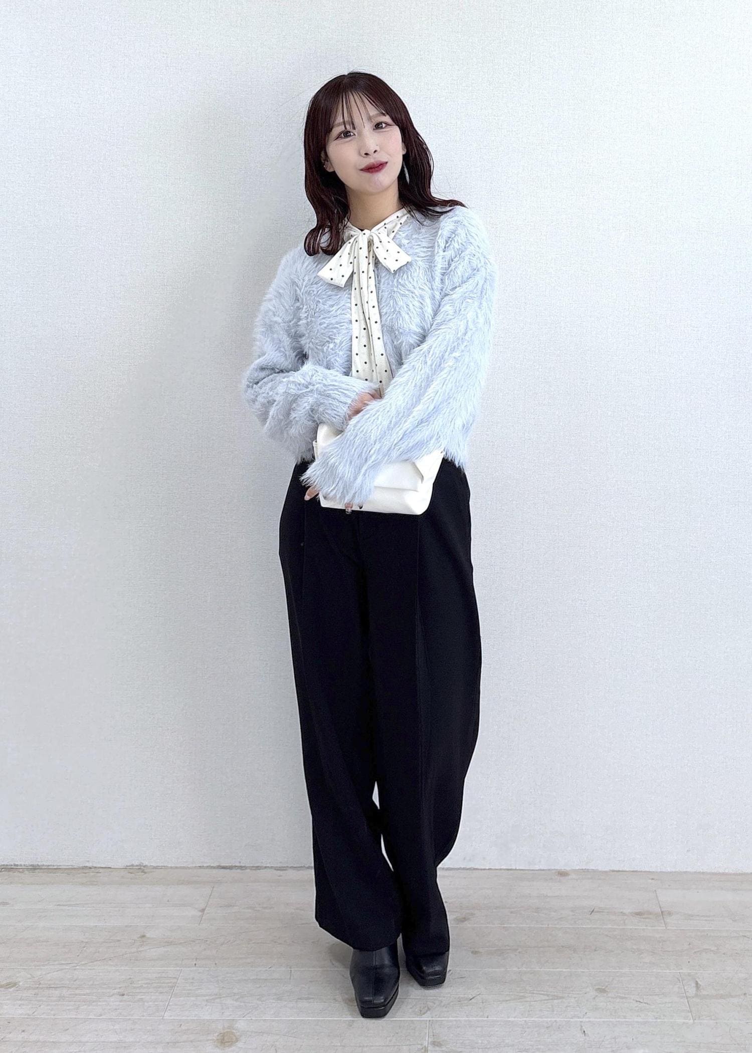 柔らかなサックスブルーで、羽織るだけでコーデが一気に華やかになります。