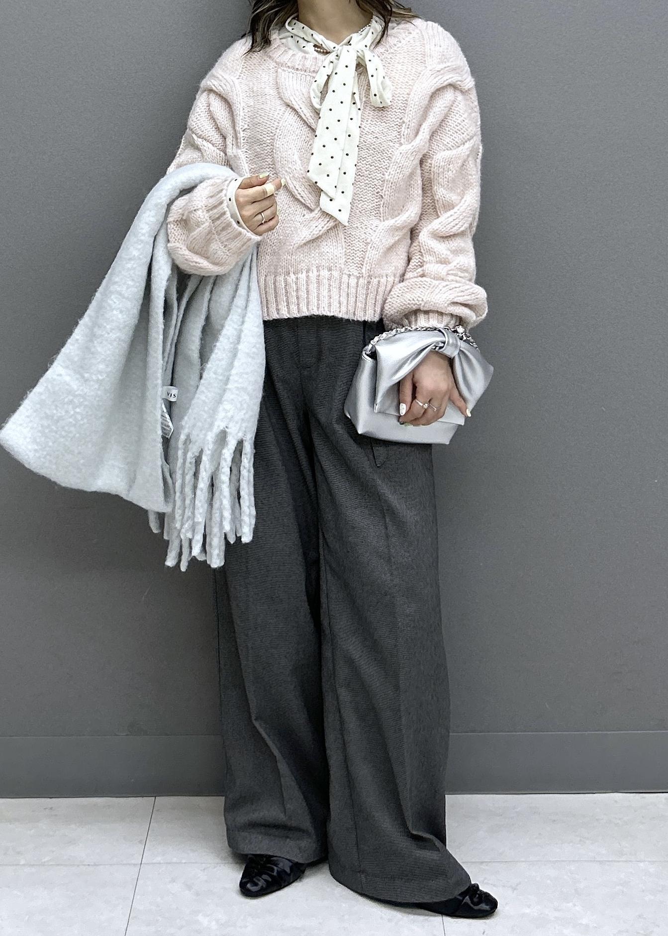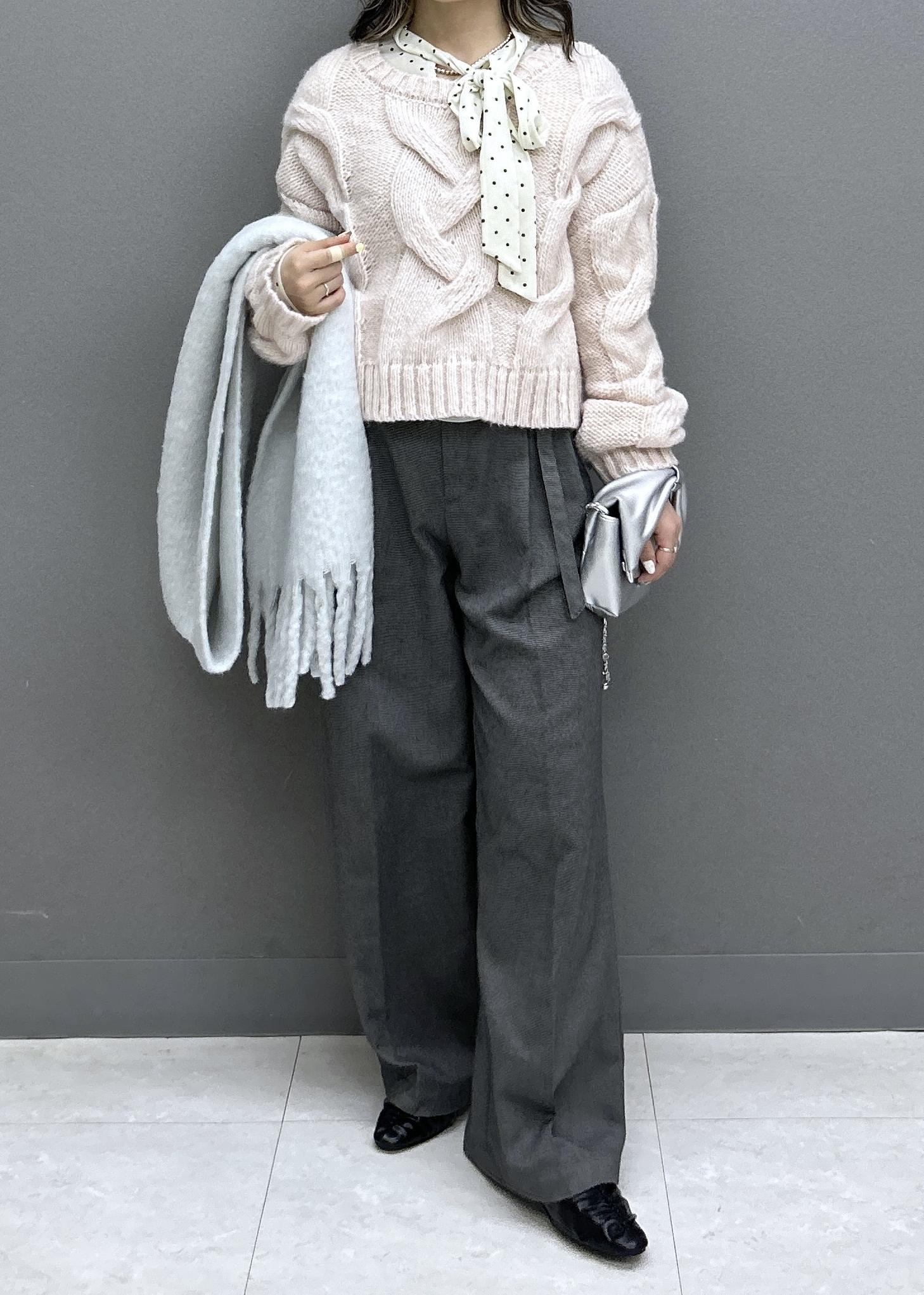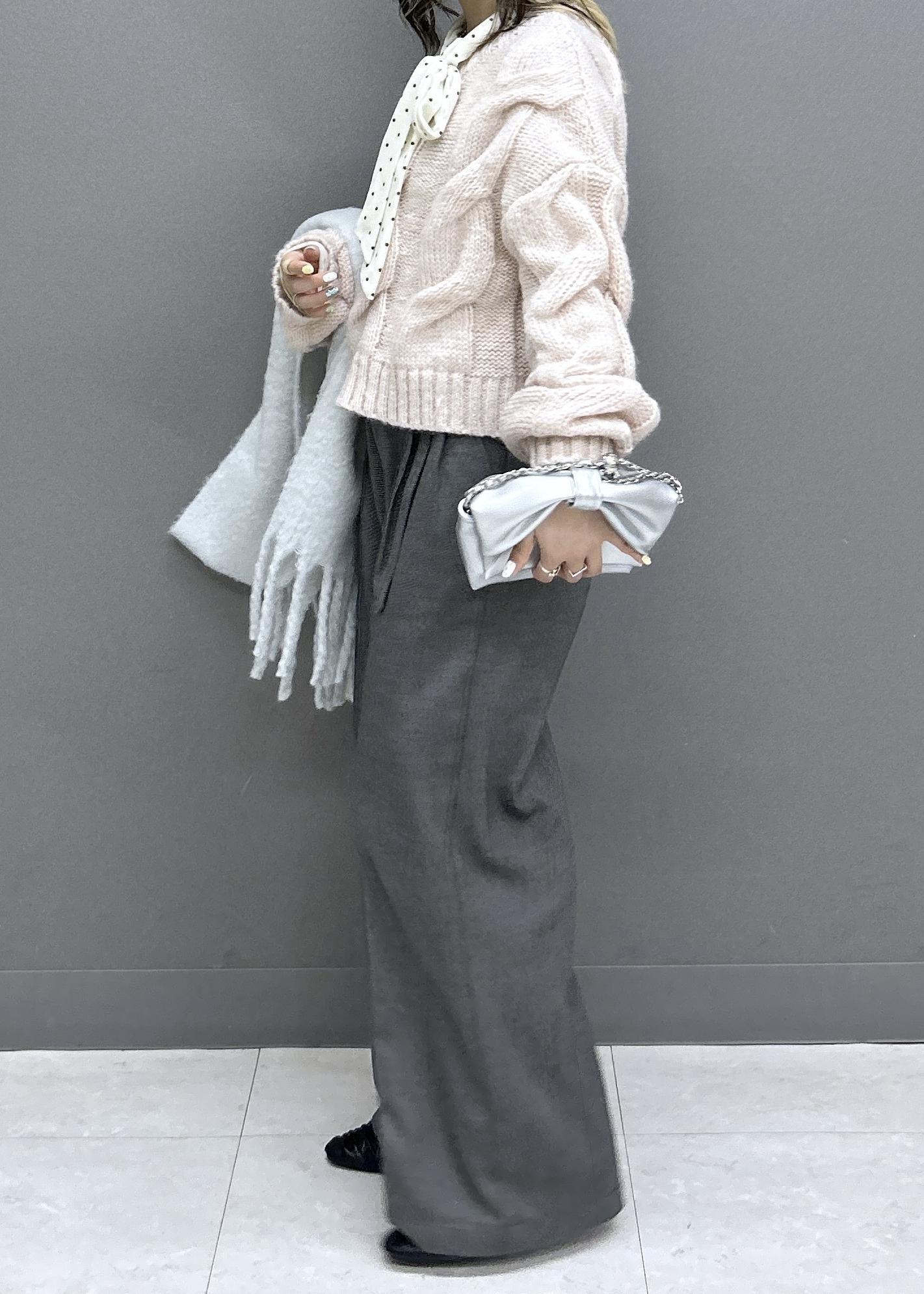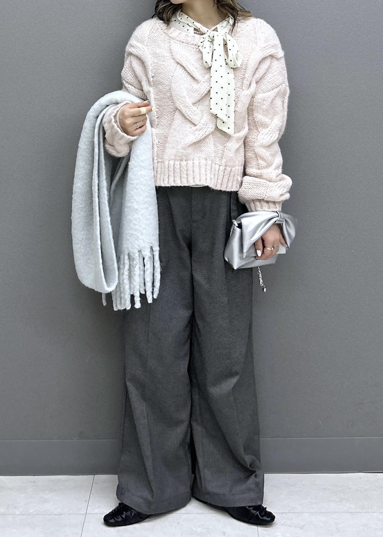 ゆるっとニットにワイドパンツでカジュアルなスタイリングですが、ピンク×グレーとドット柄のベロアボウタイトップスをあわせることで可愛らしさも忘れずに◎