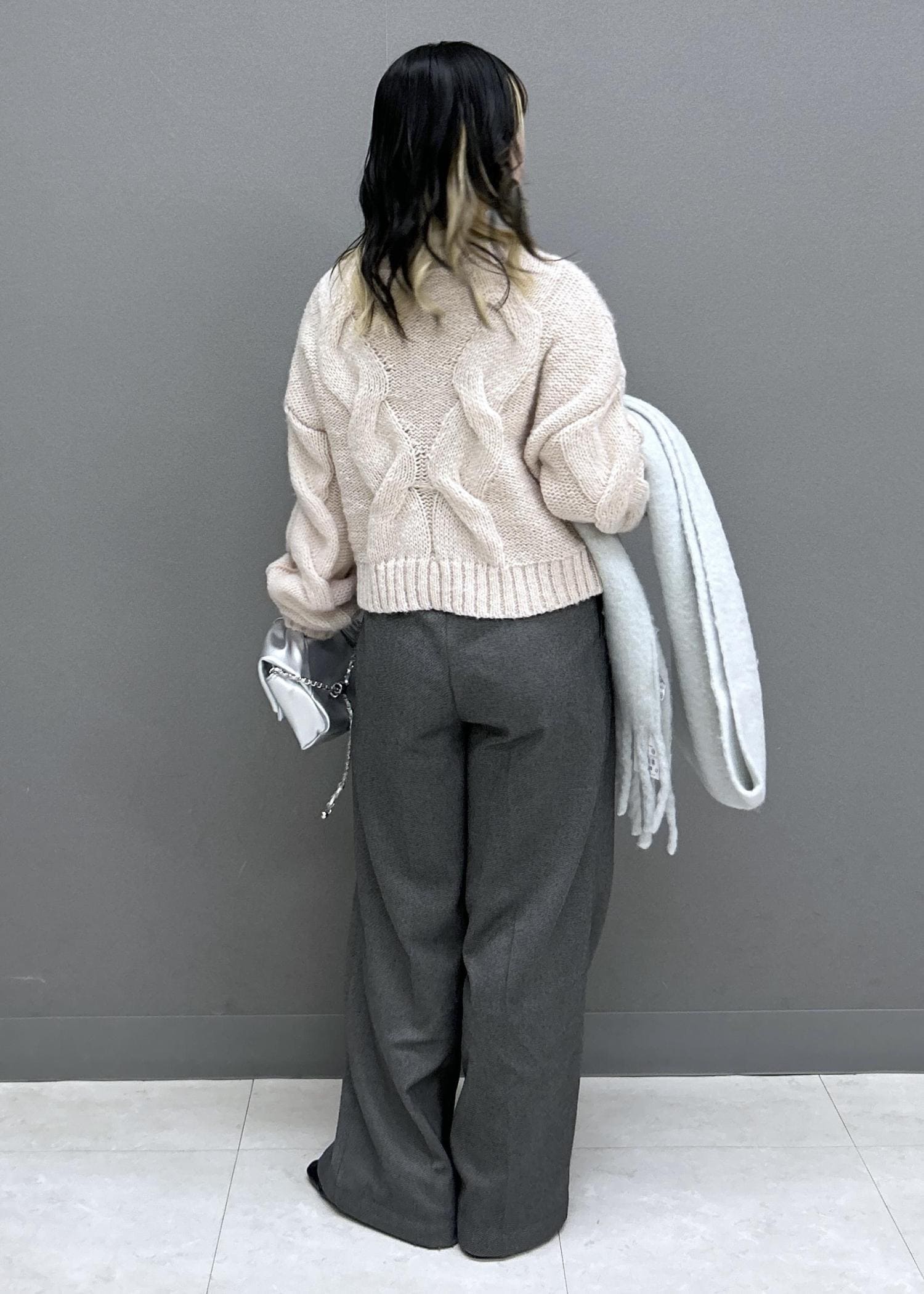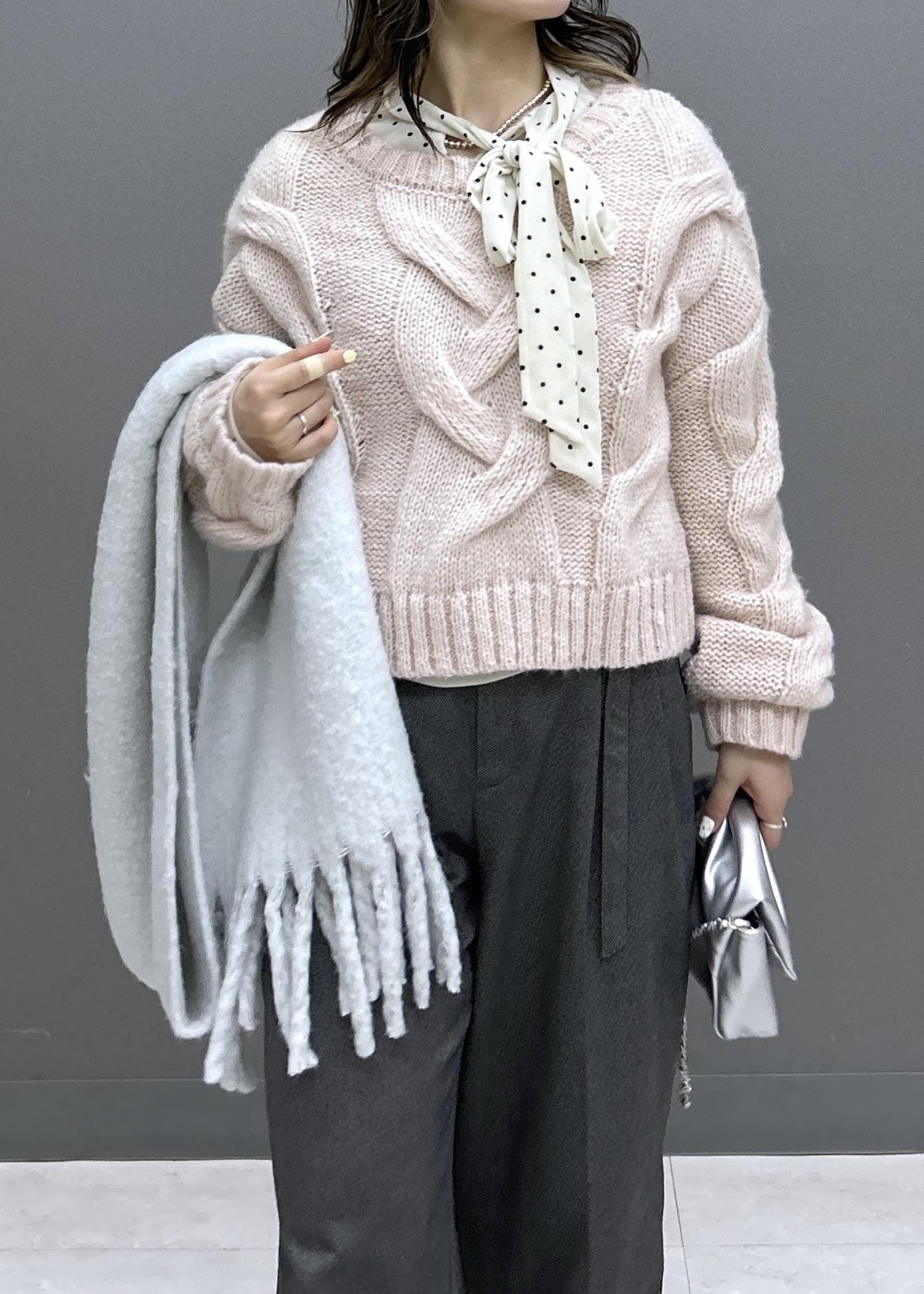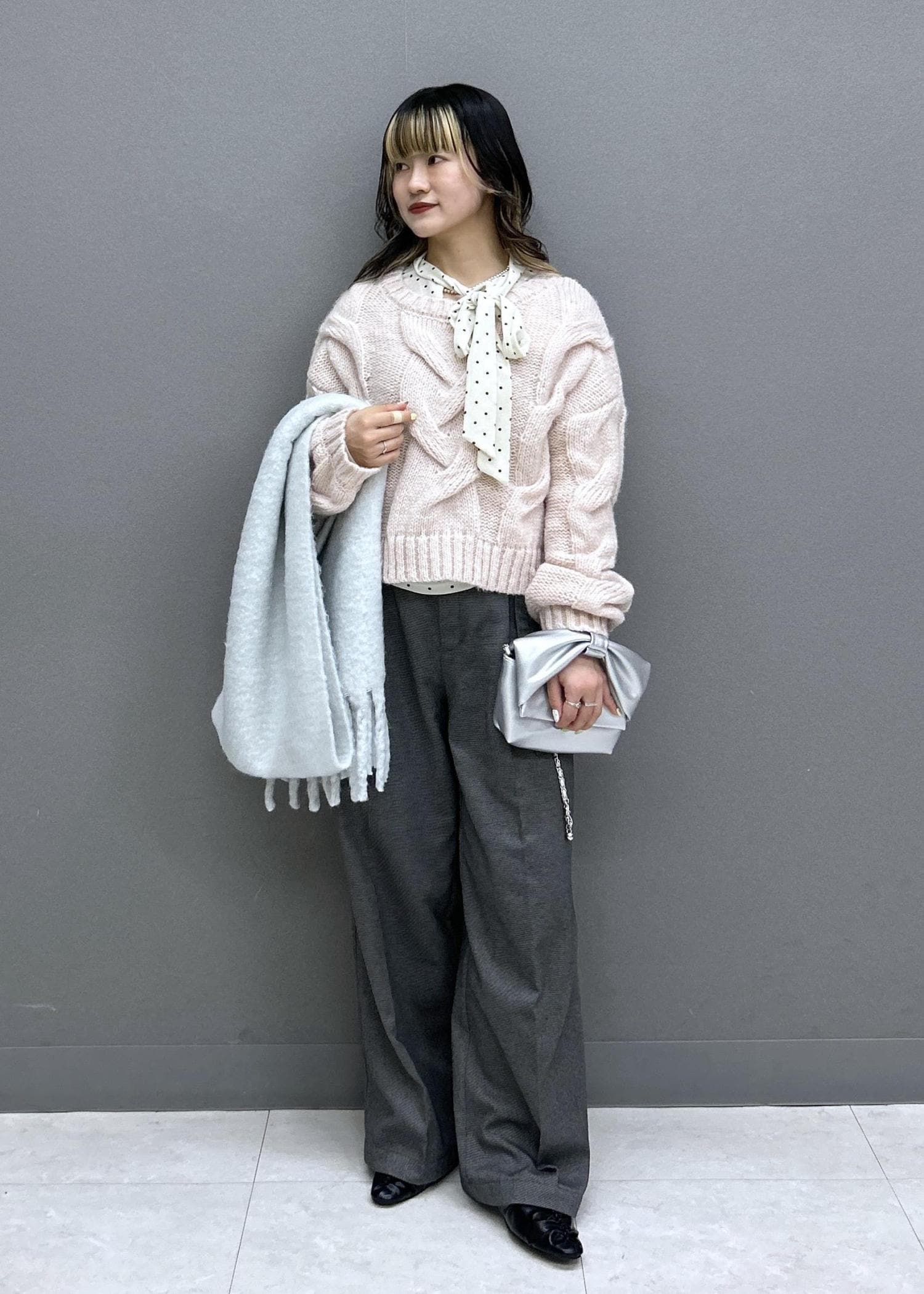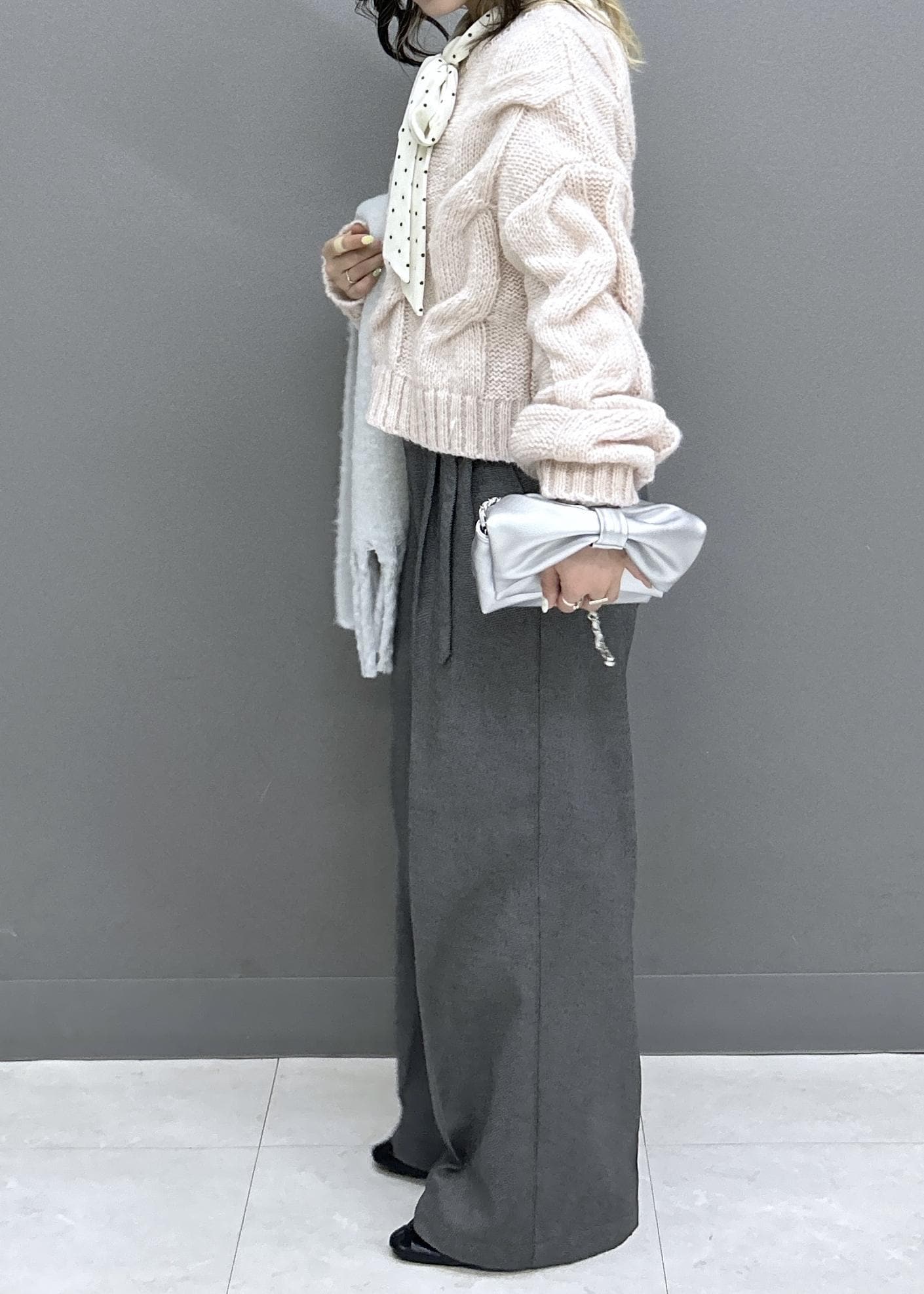 ゆるっとニットにワイドパンツでカジュアルなスタイリングですが、ピンク×グレーとドット柄のベロアボウタイトップスをあわせることで可愛らしさも忘れずに◎