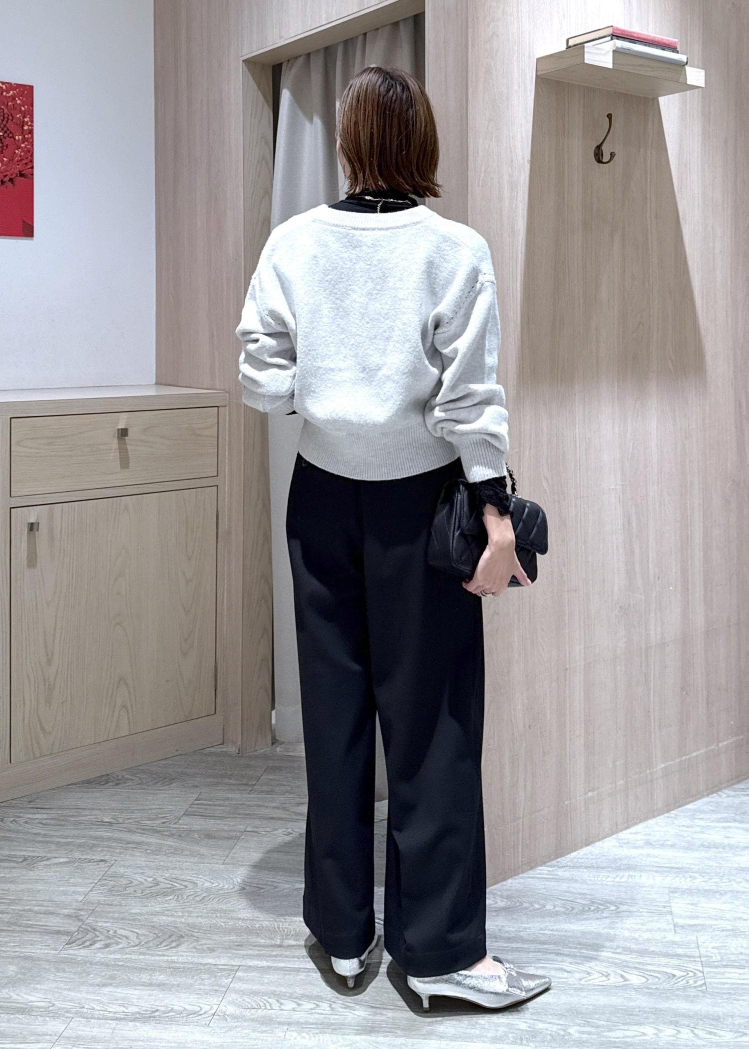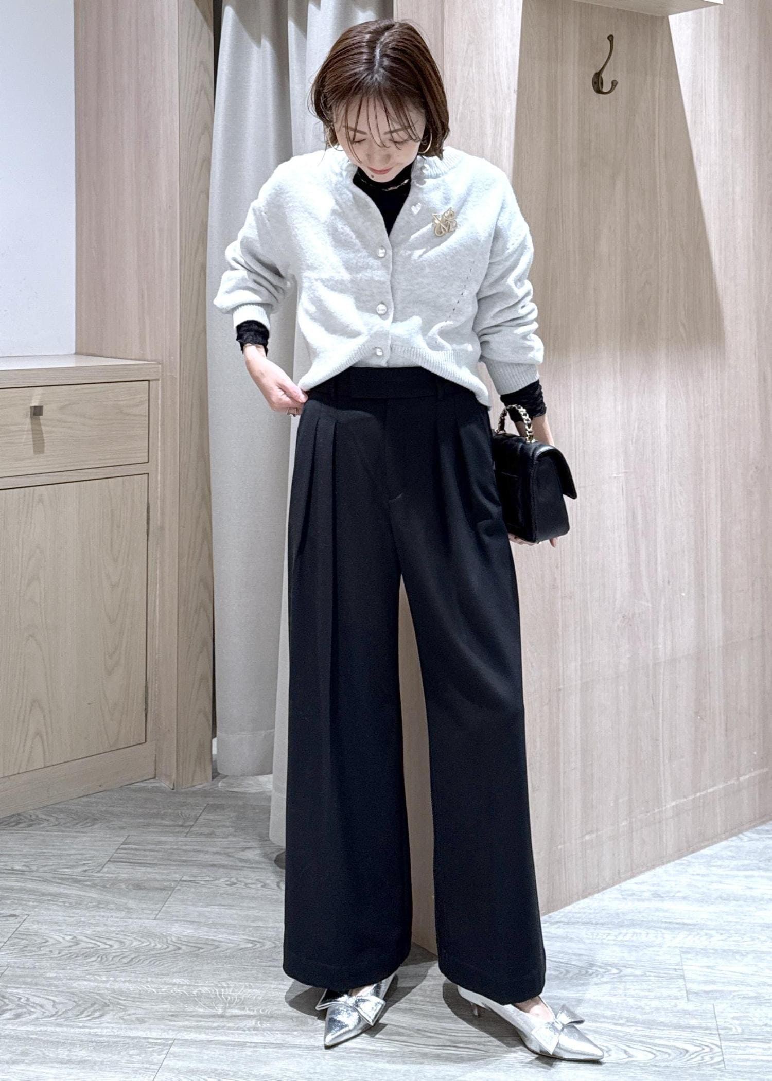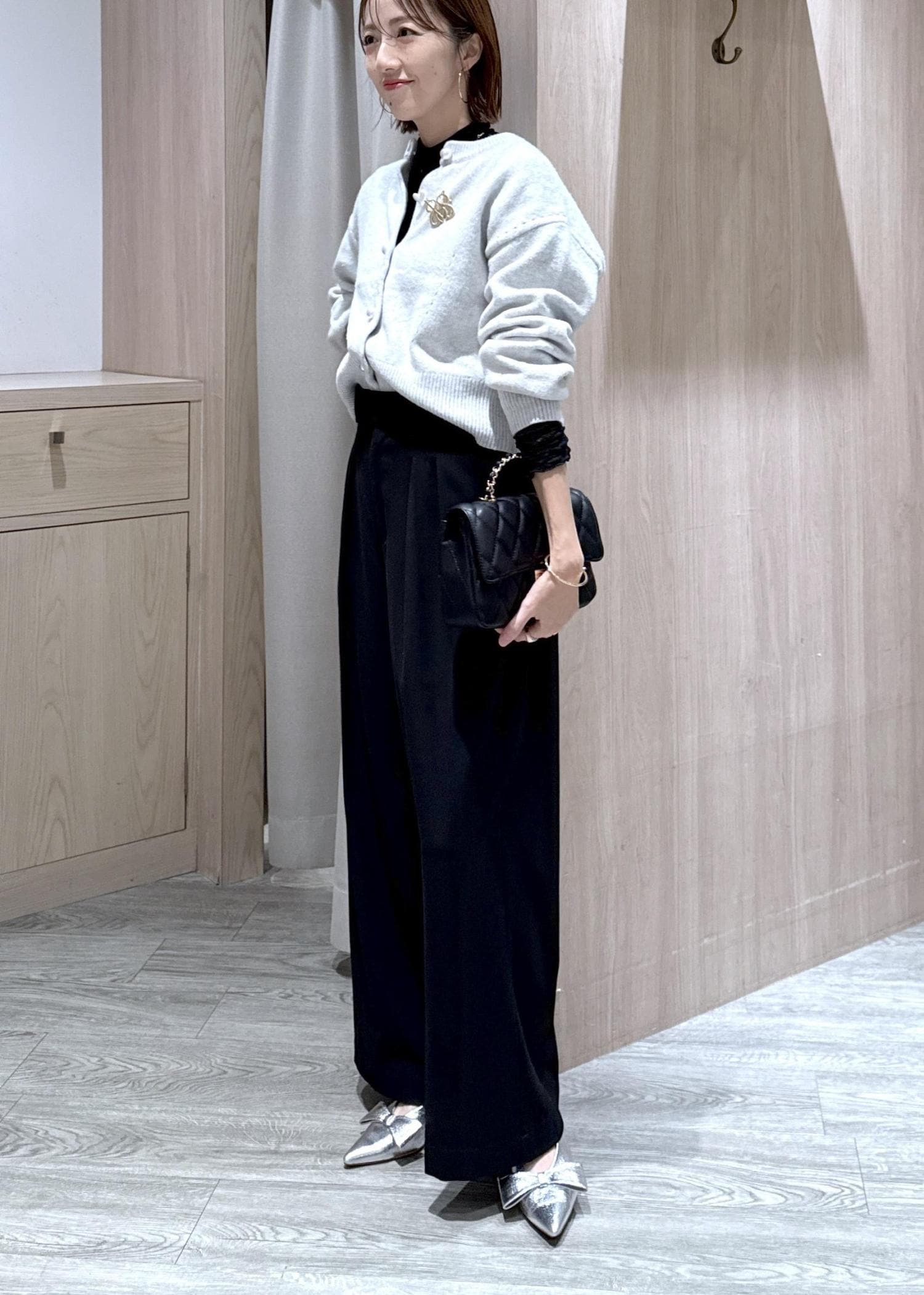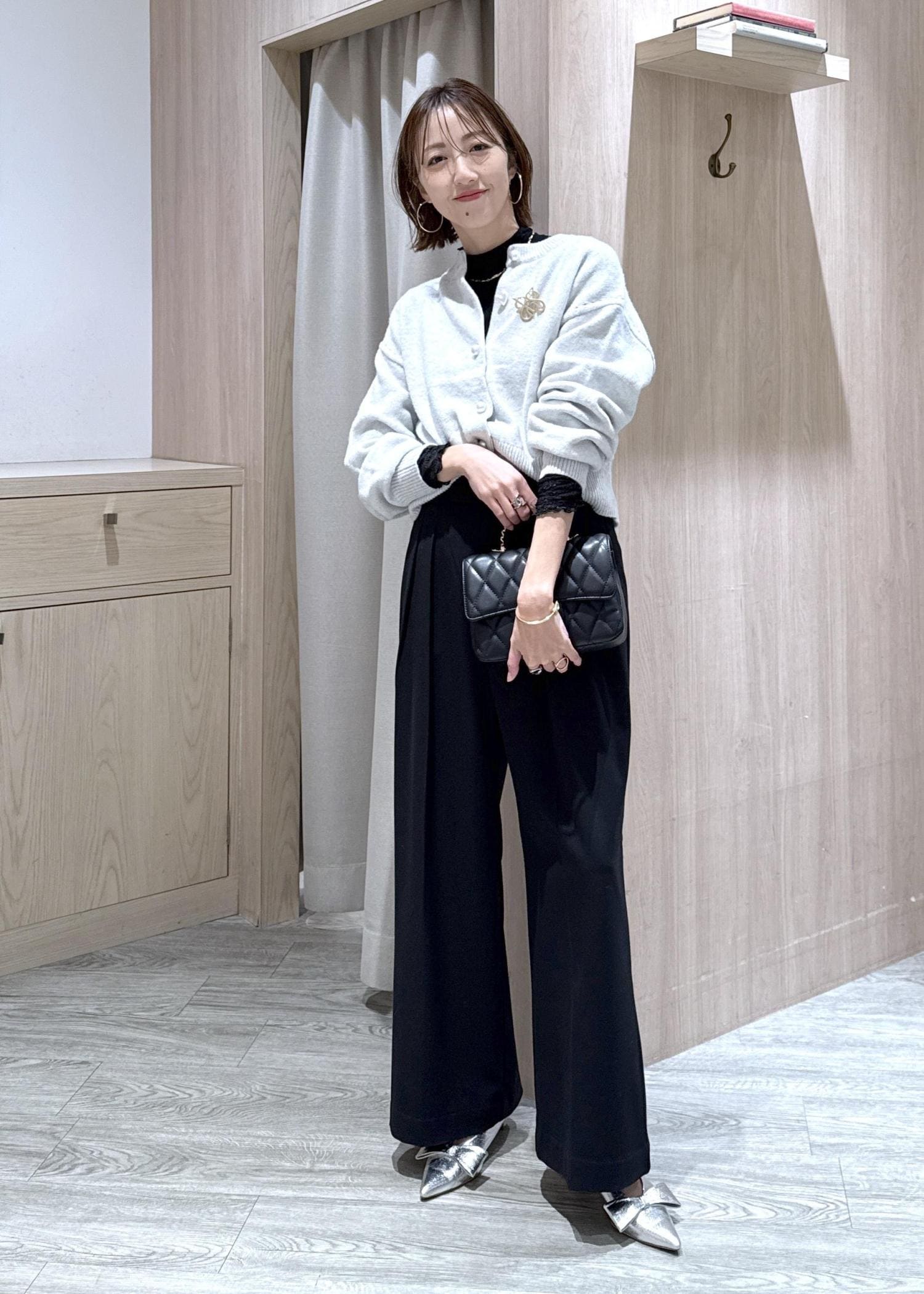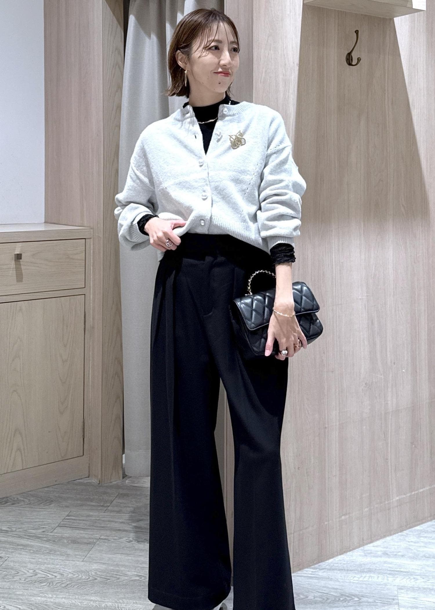 カーディガン×ワイドパンツのコーディネートにキルティングバッグを合わせていつもよりワンランク上のキレイめコーデにしました!!