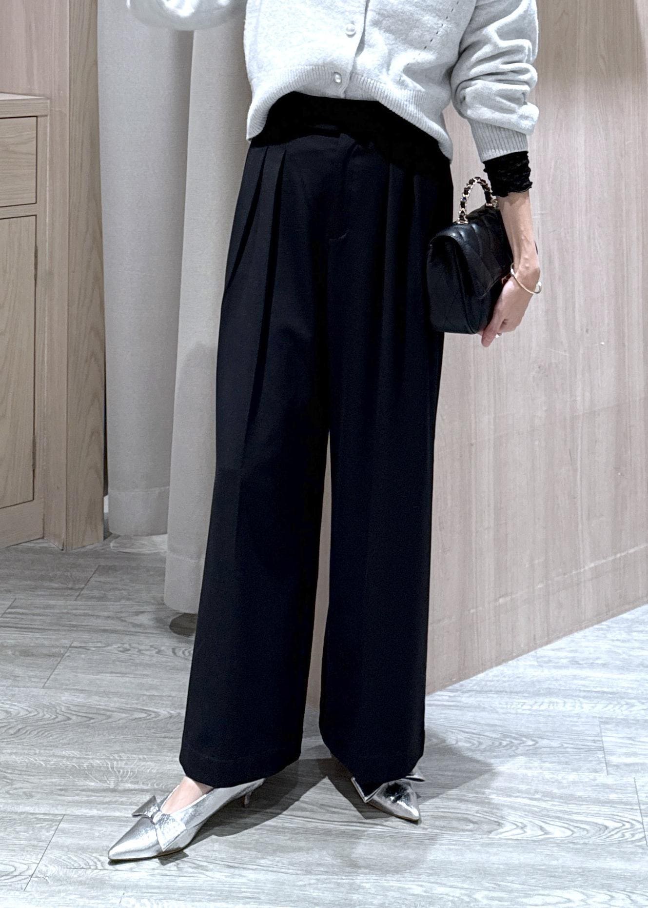 2タックで裾に向かって緩やかに広がるワイドパンツで足を長く見せてくれます!ストレッチが入っているので立ったり座ったりが楽でシワにもなりにくいです!
