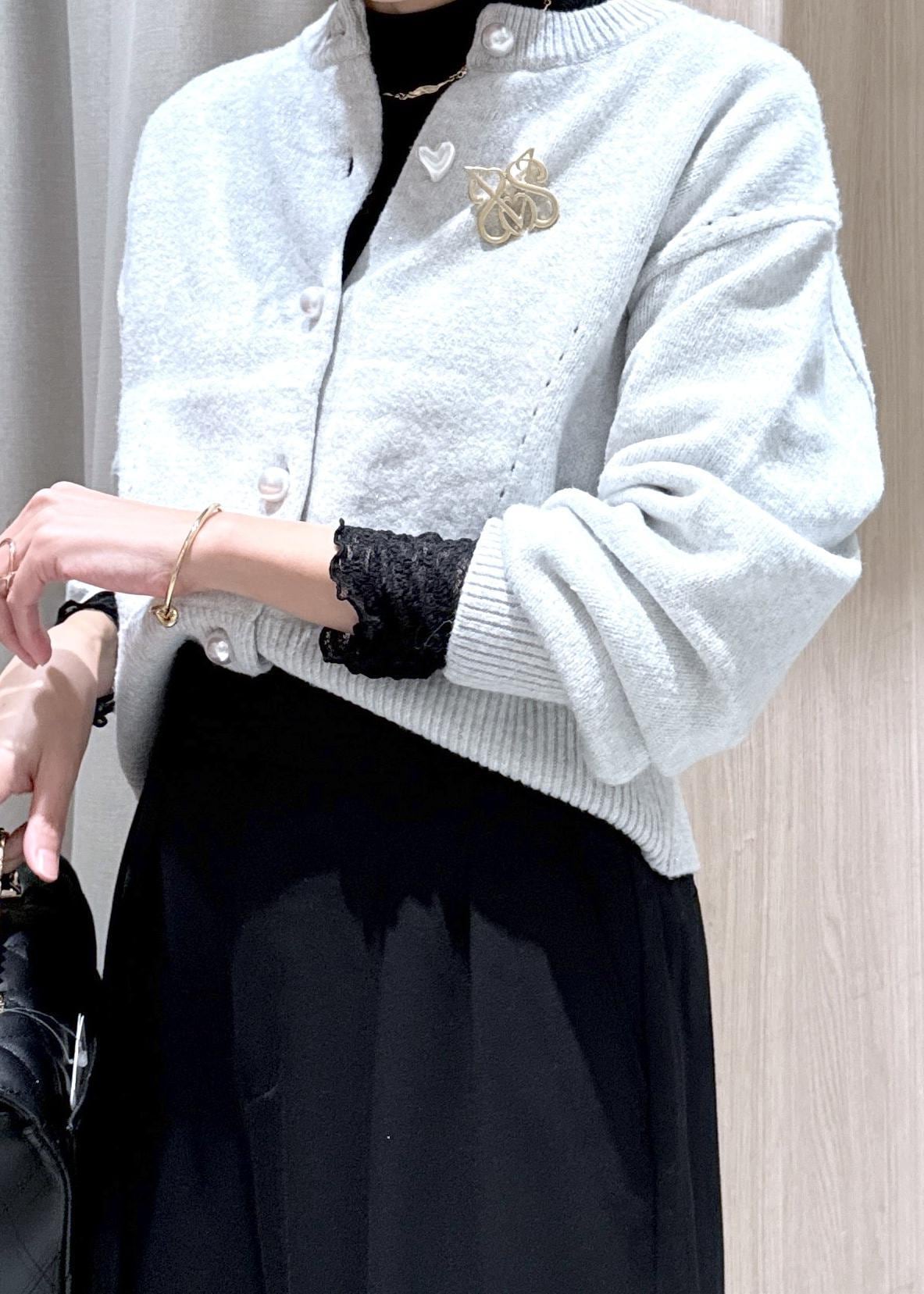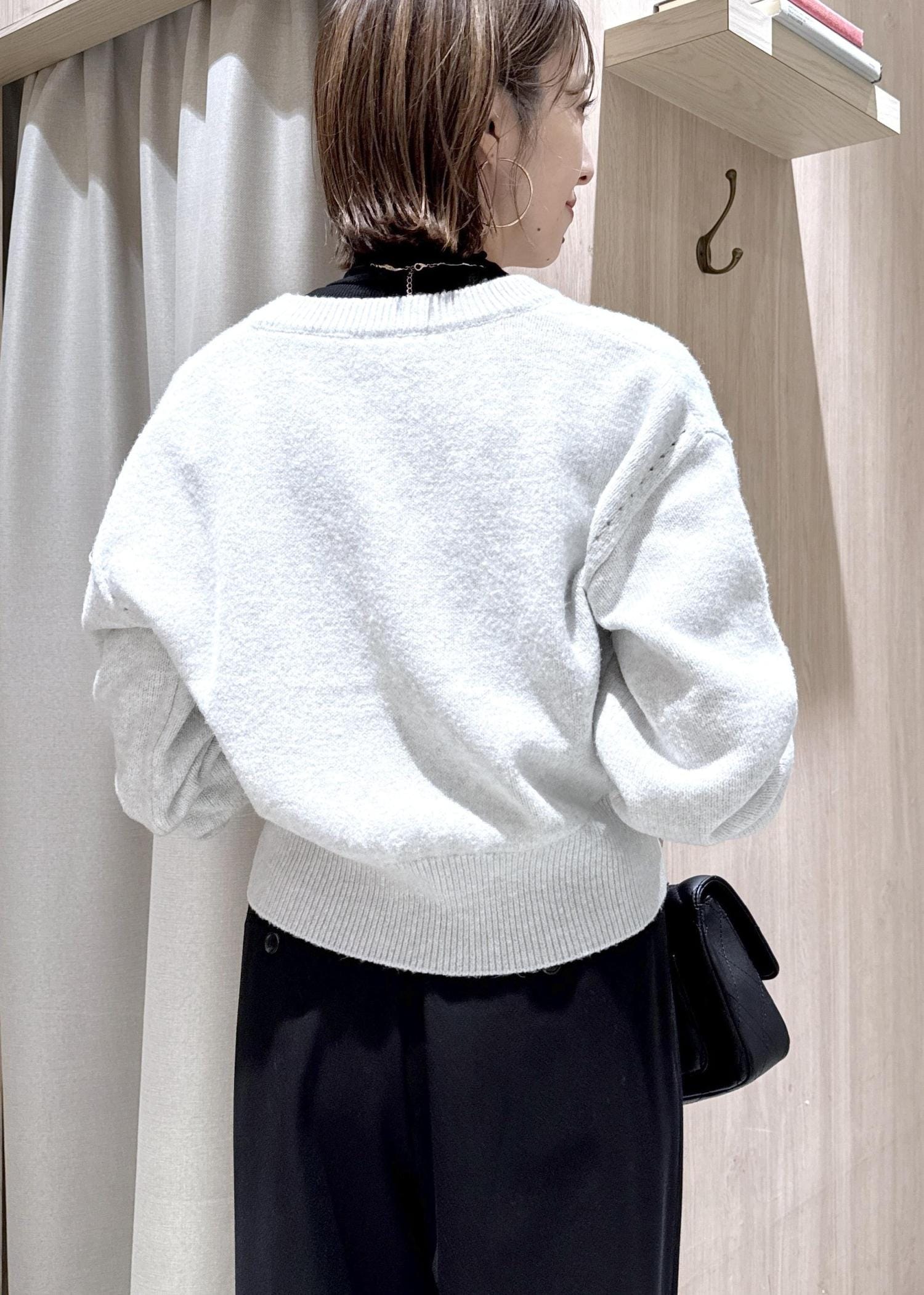 大きめのパールボタンが印象的なのでボタンを留めてプルオーバーのように着るのもオススメ! -