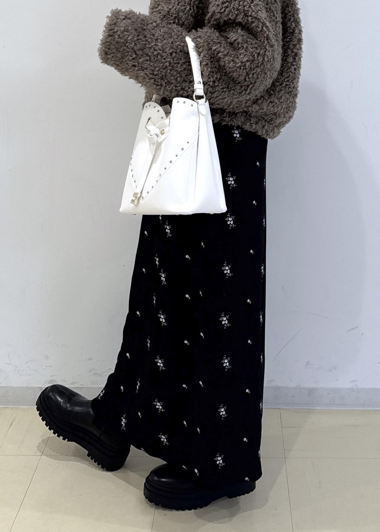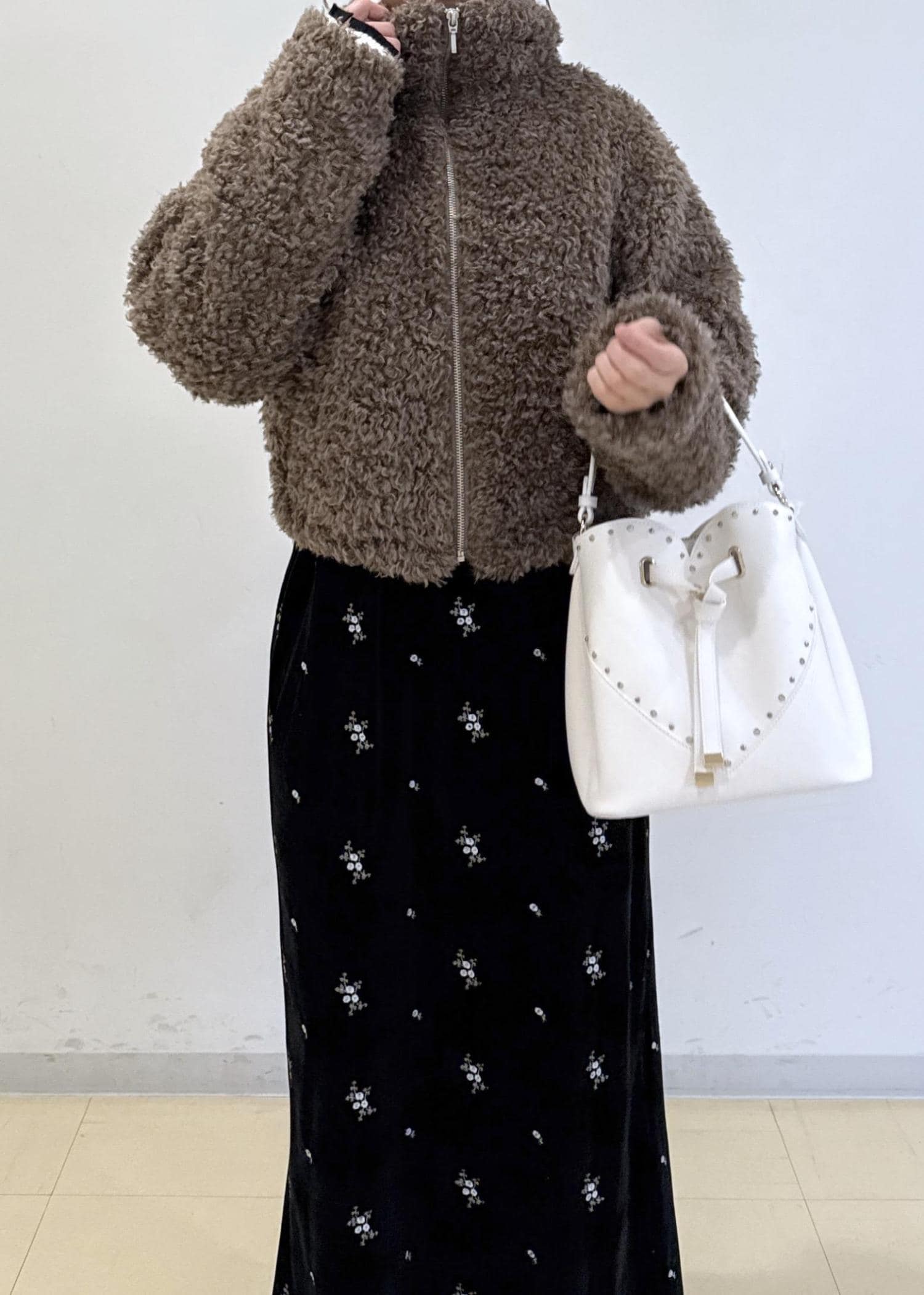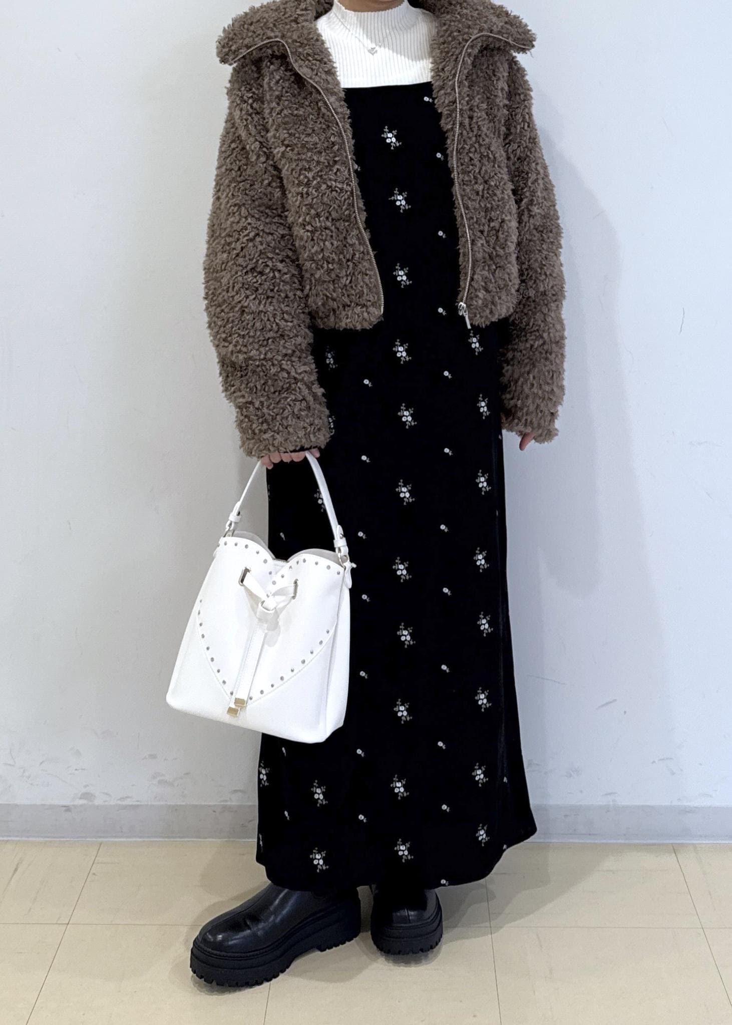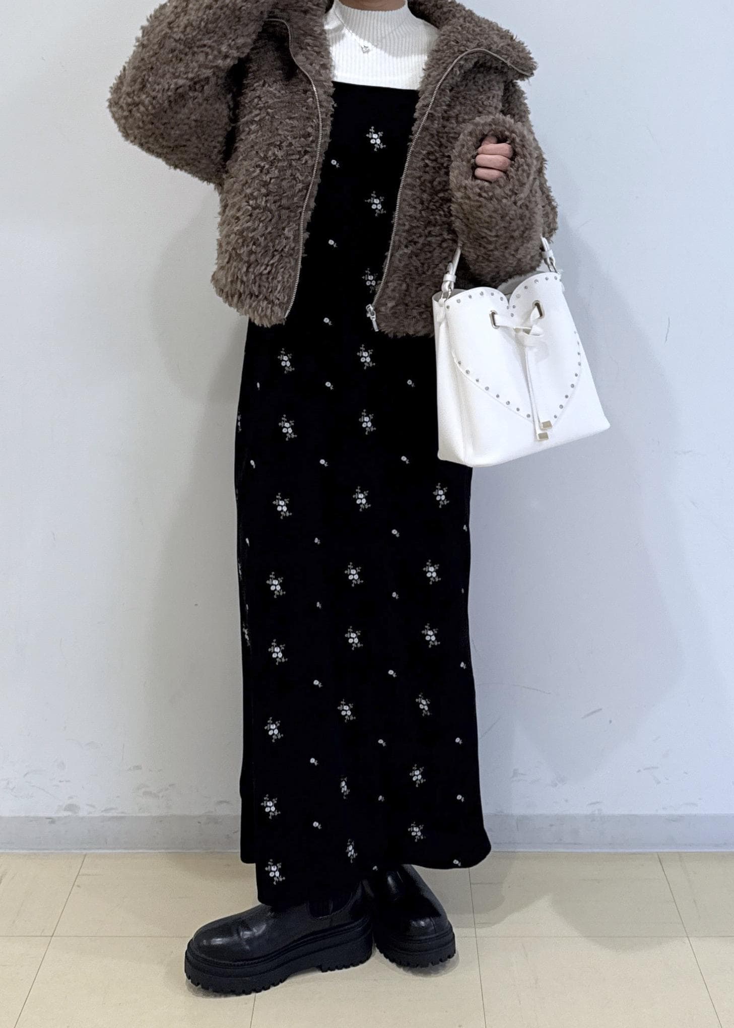 ロング丈のワンピースなので、アウターはショート丈にし、バランス良いコーディネートになるよう意識しました。