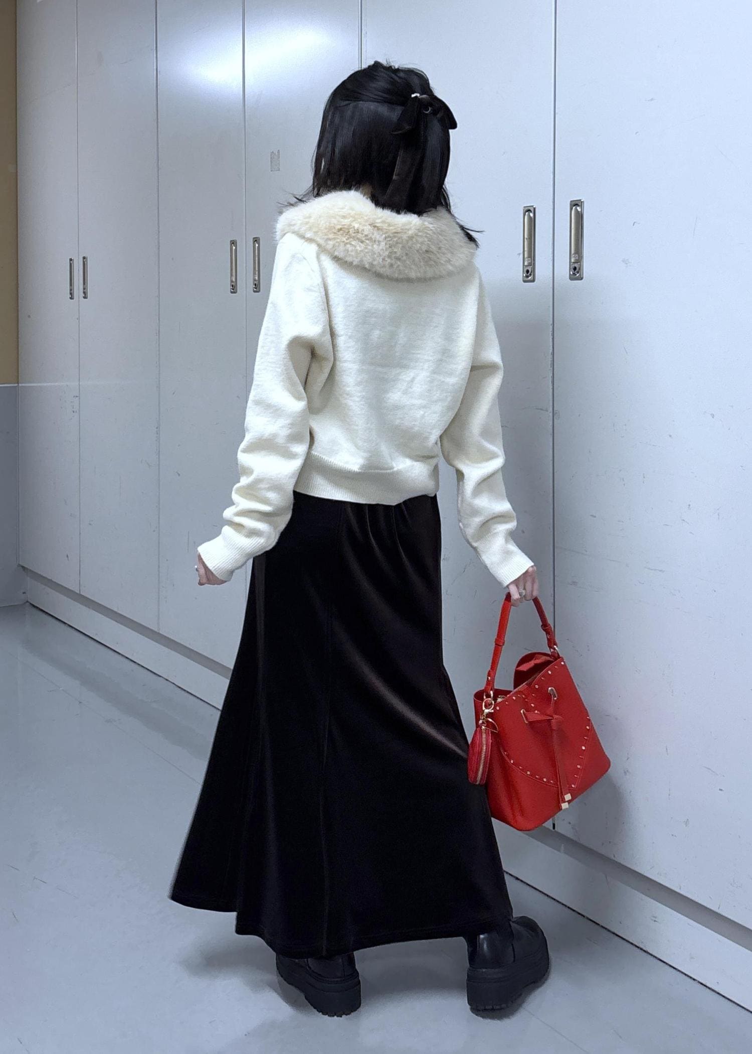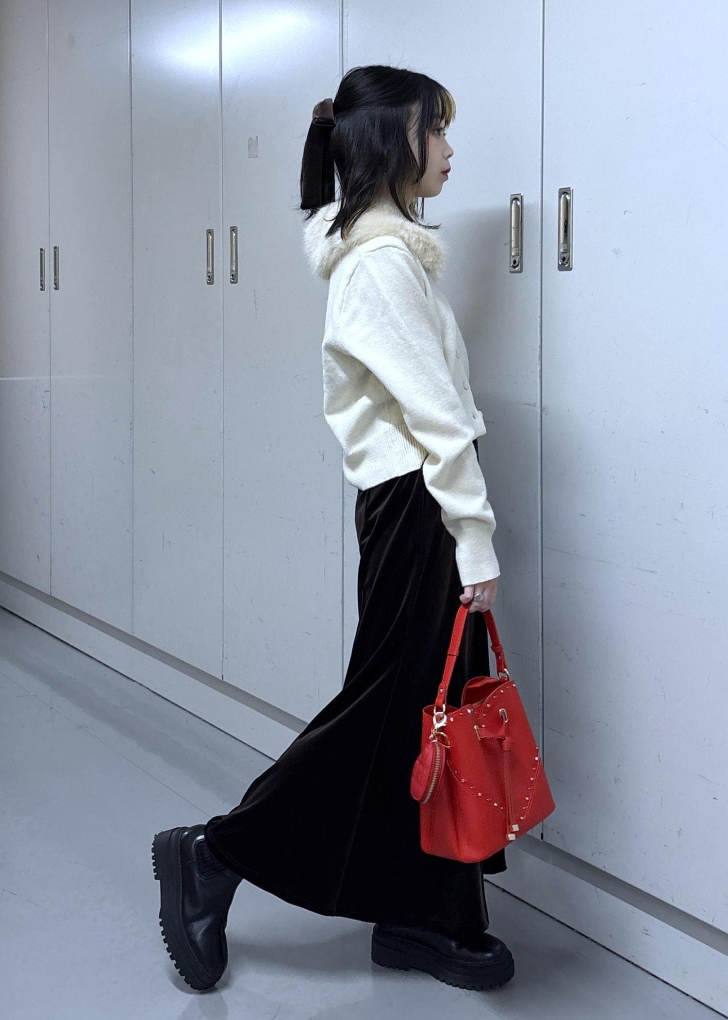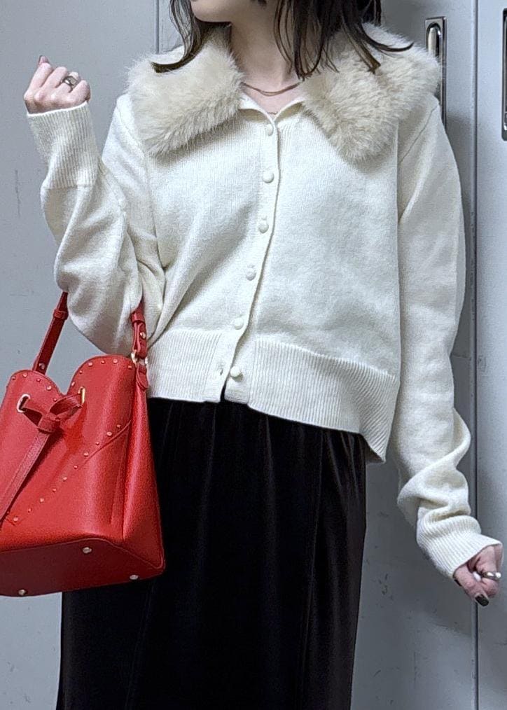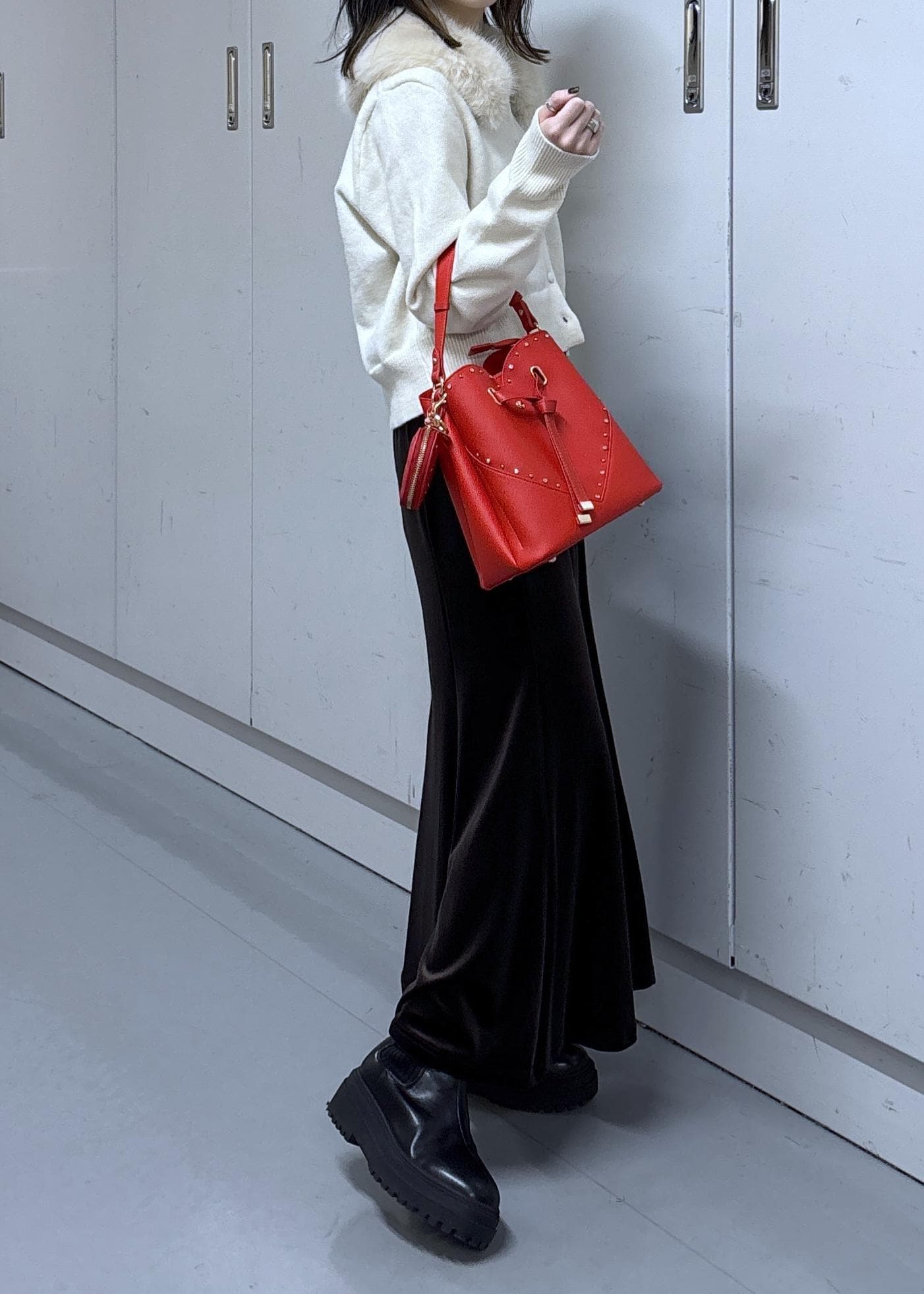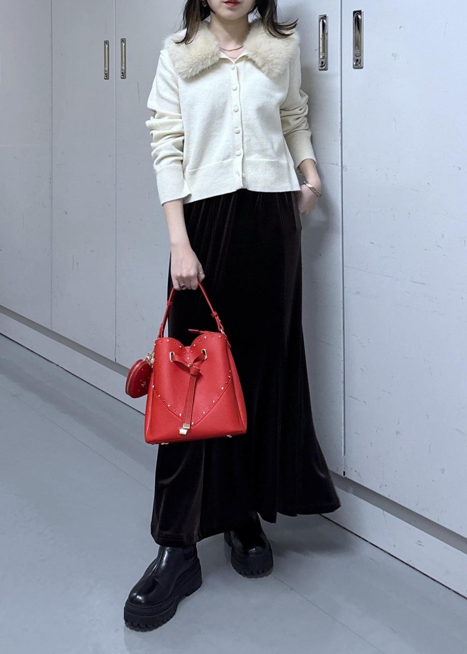 ファーの衿とバッグの赤が目を引く華やかなコーディネート♩