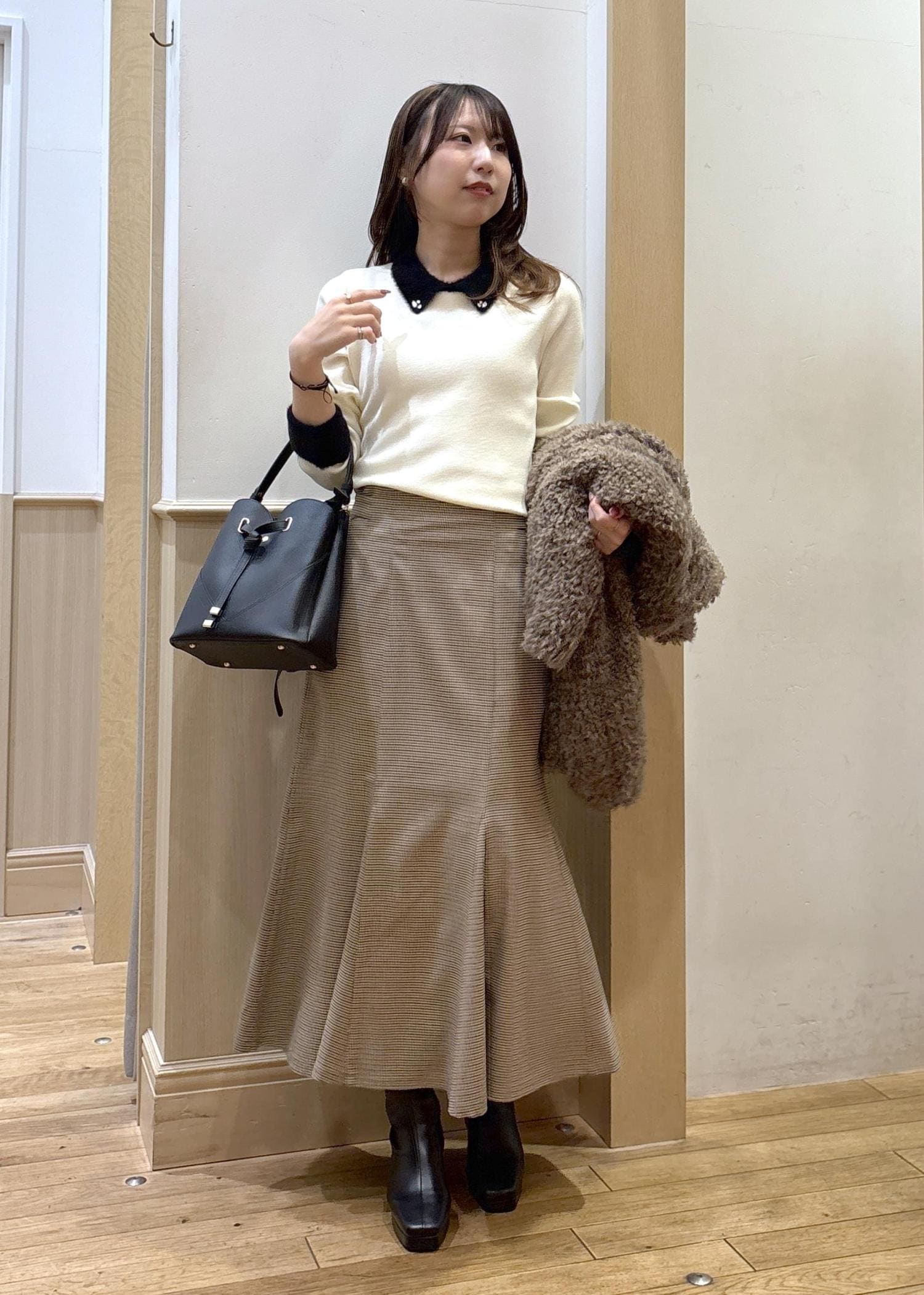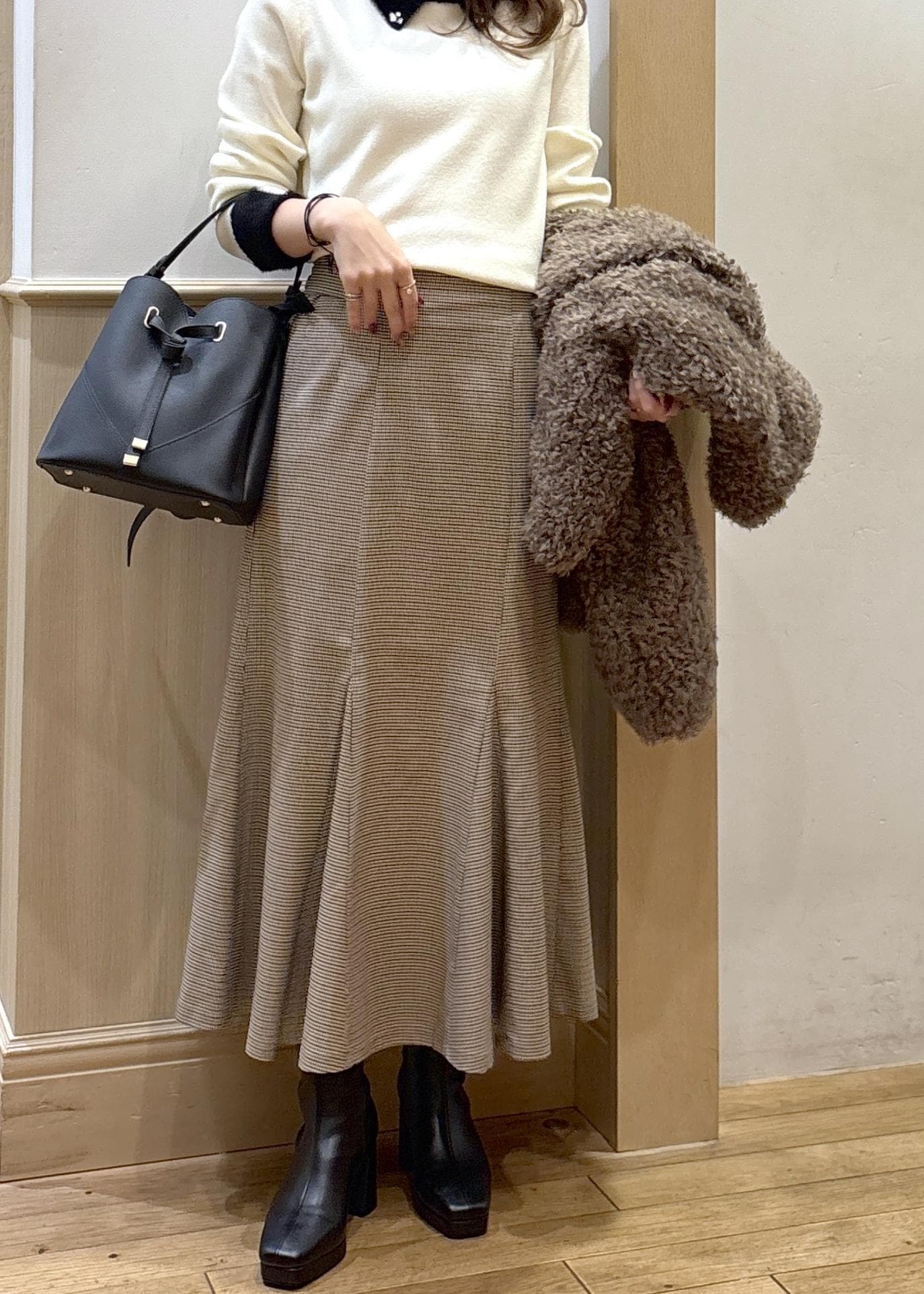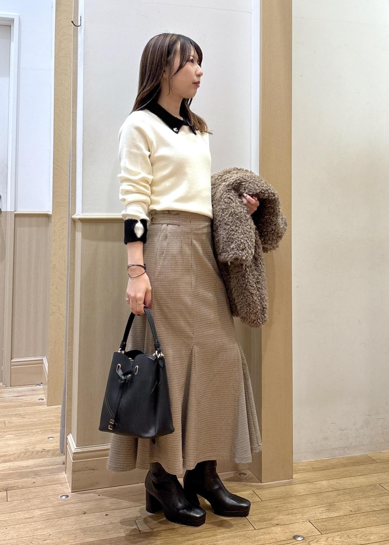 トップスのデザイン性が強いと、ボトムの合わせに悩みますが、カラーが白黒だったので、形はベーシックですがチェック柄のスカートを合わせてシンプルになりすぎないようにコーデを組みました。