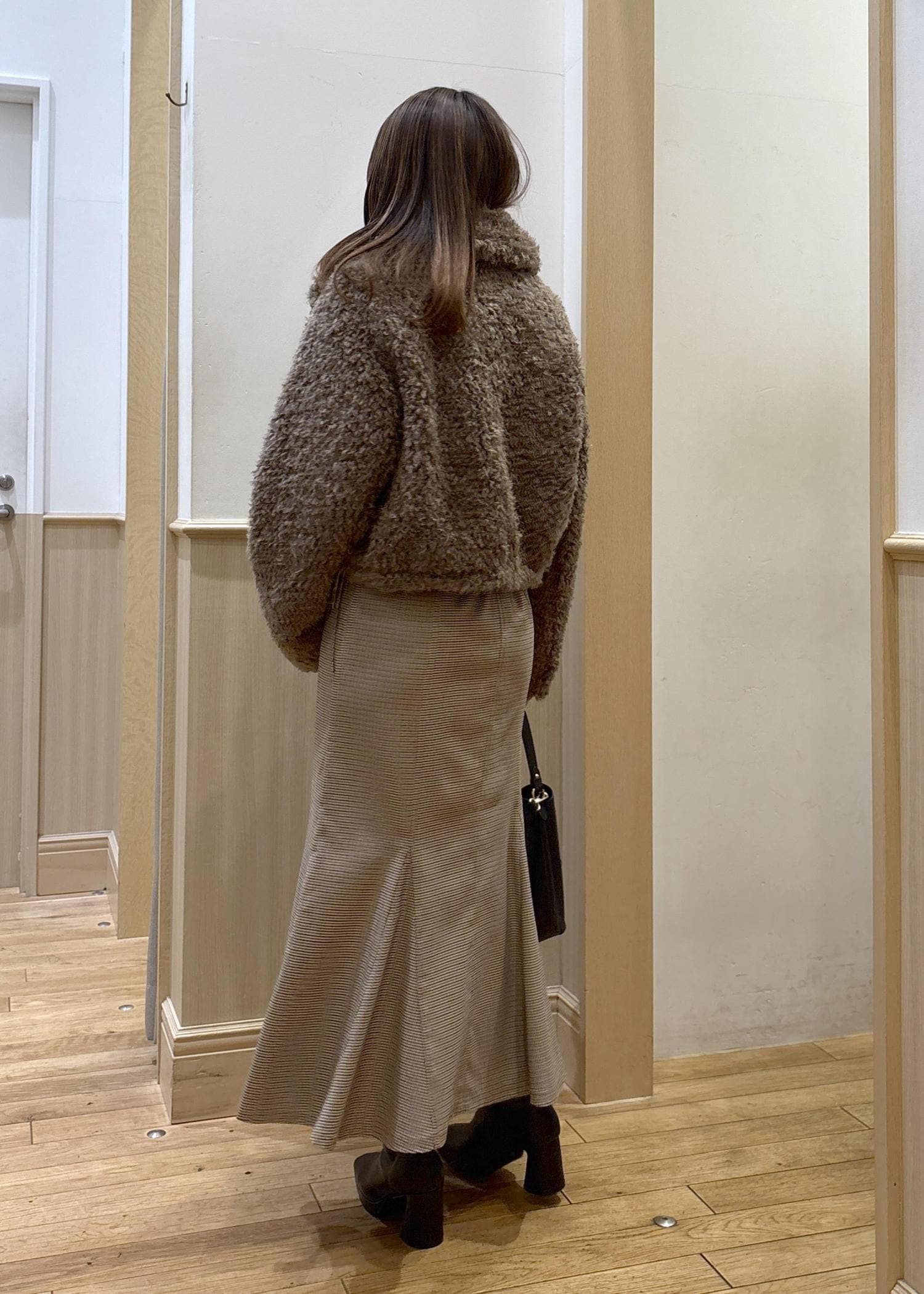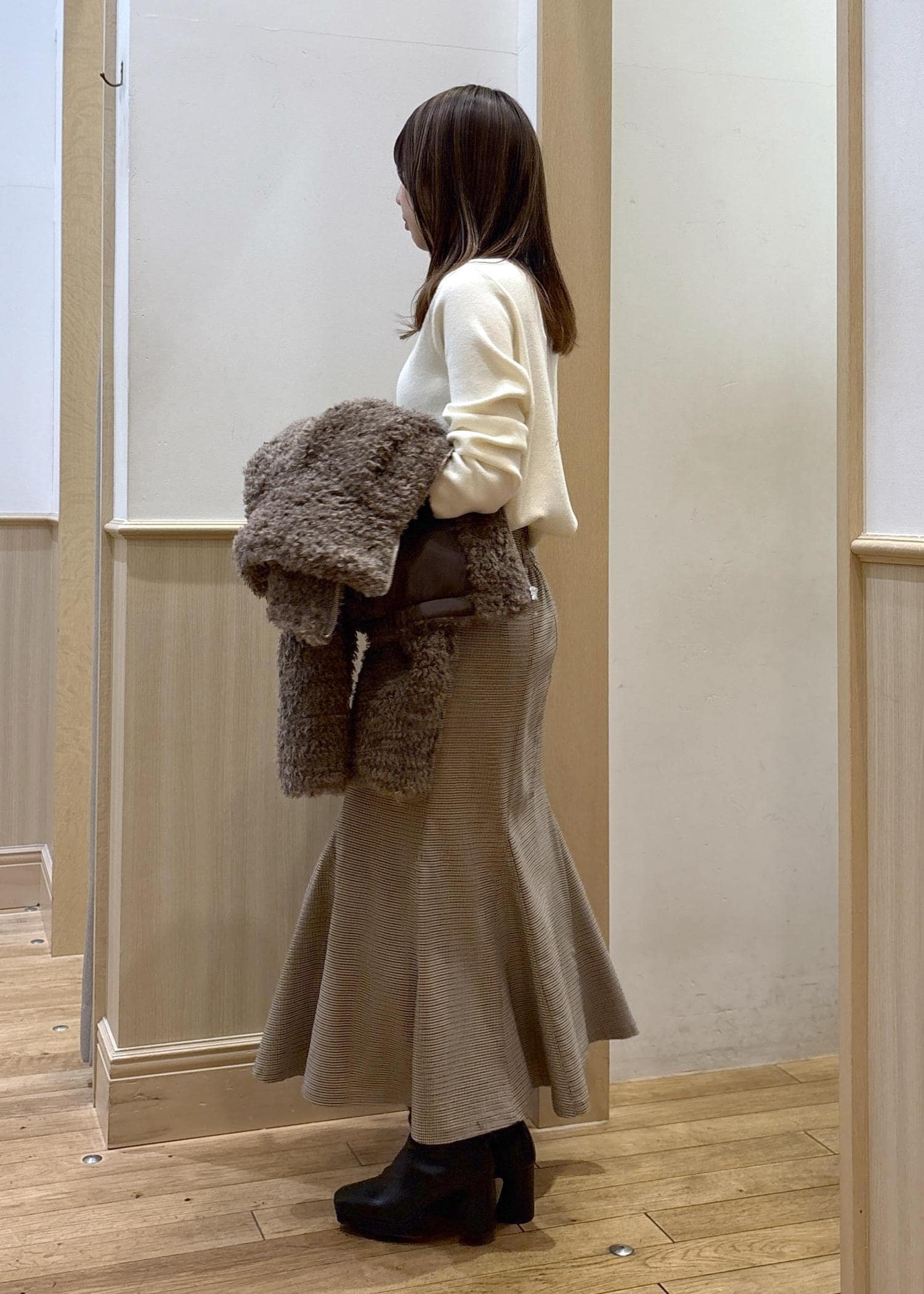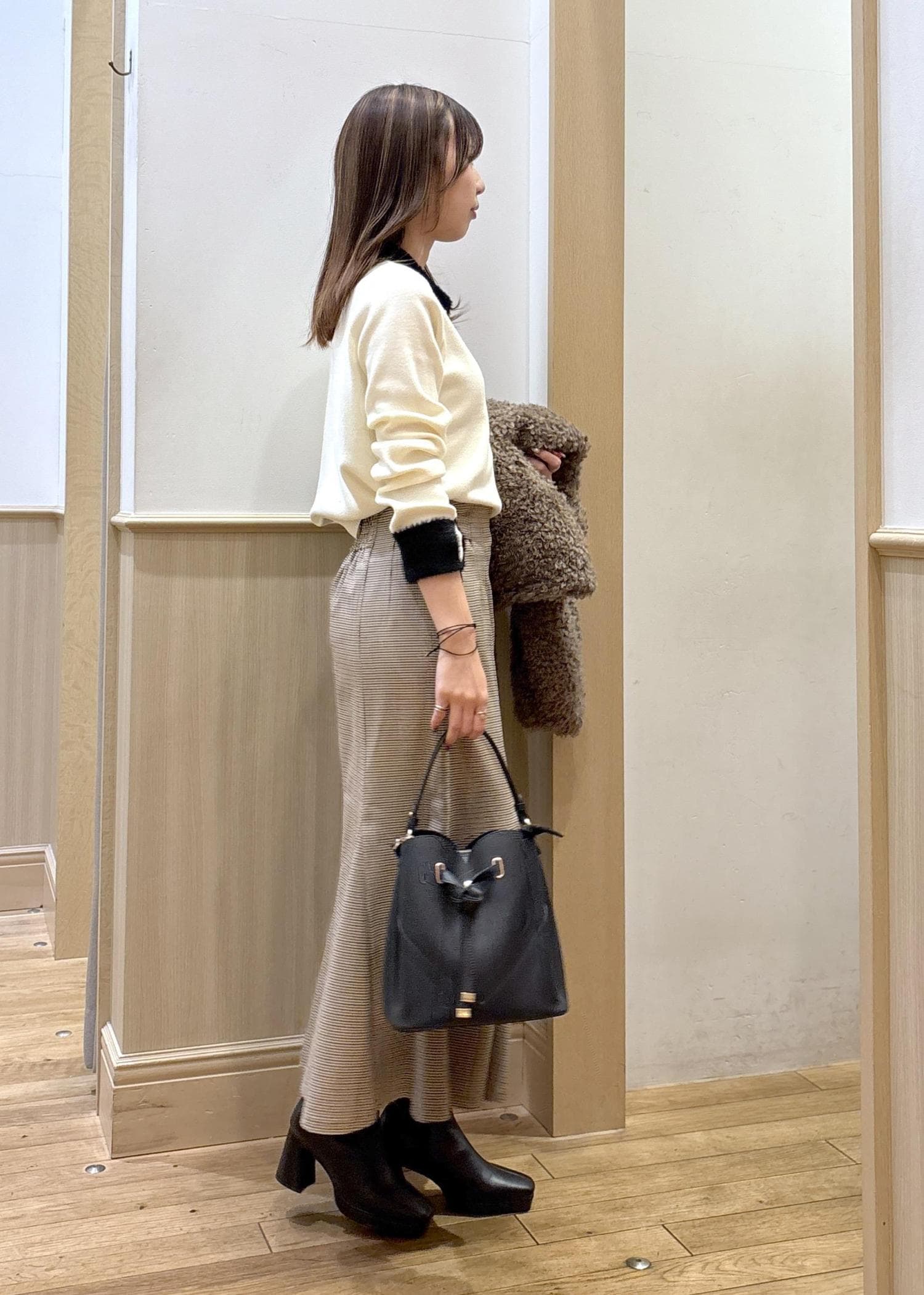 トップスのデザイン性が強いと、ボトムの合わせに悩みますが、カラーが白黒だったので、形はベーシックですがチェック柄のスカートを合わせてシンプルになりすぎないようにコーデを組みました。