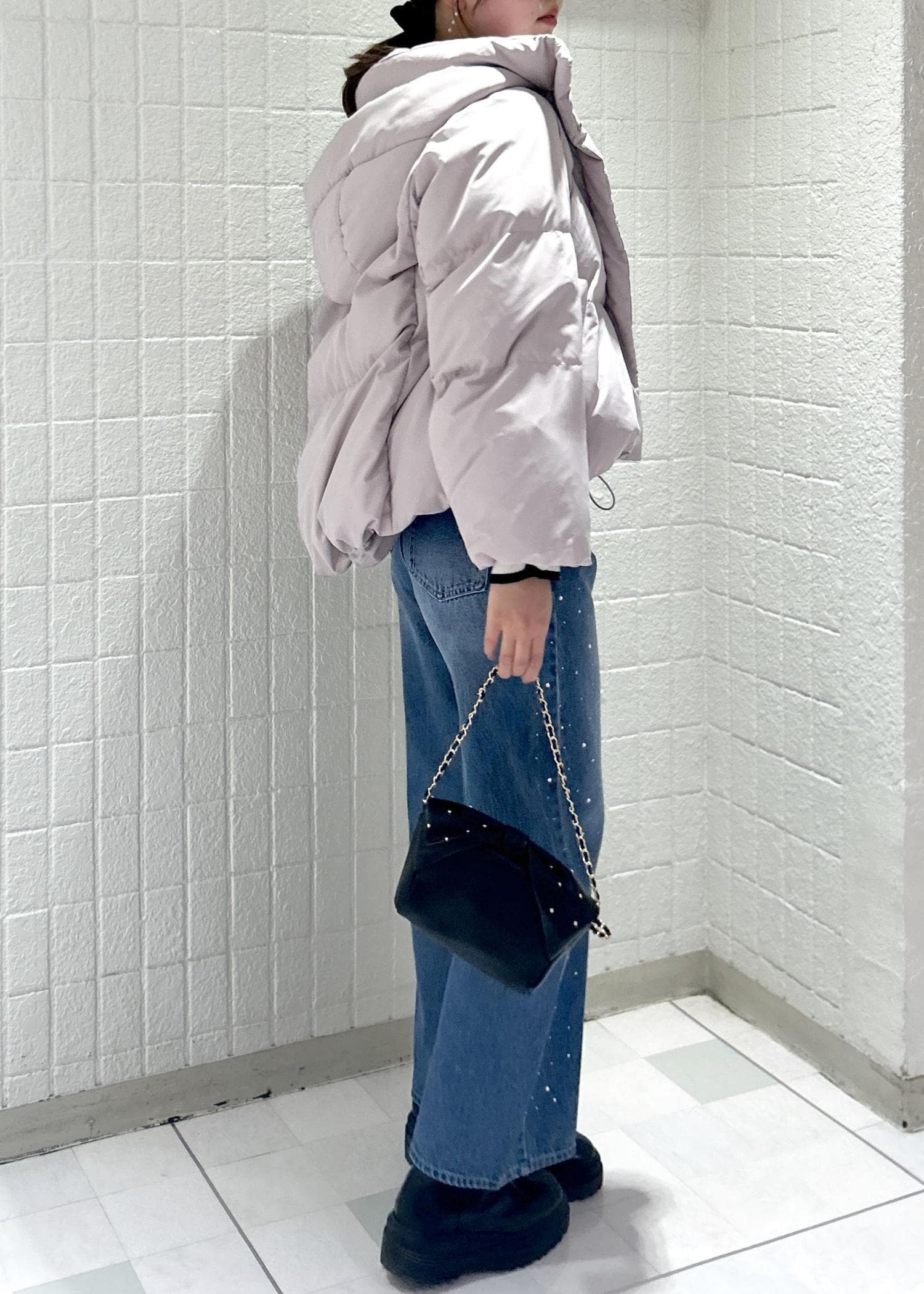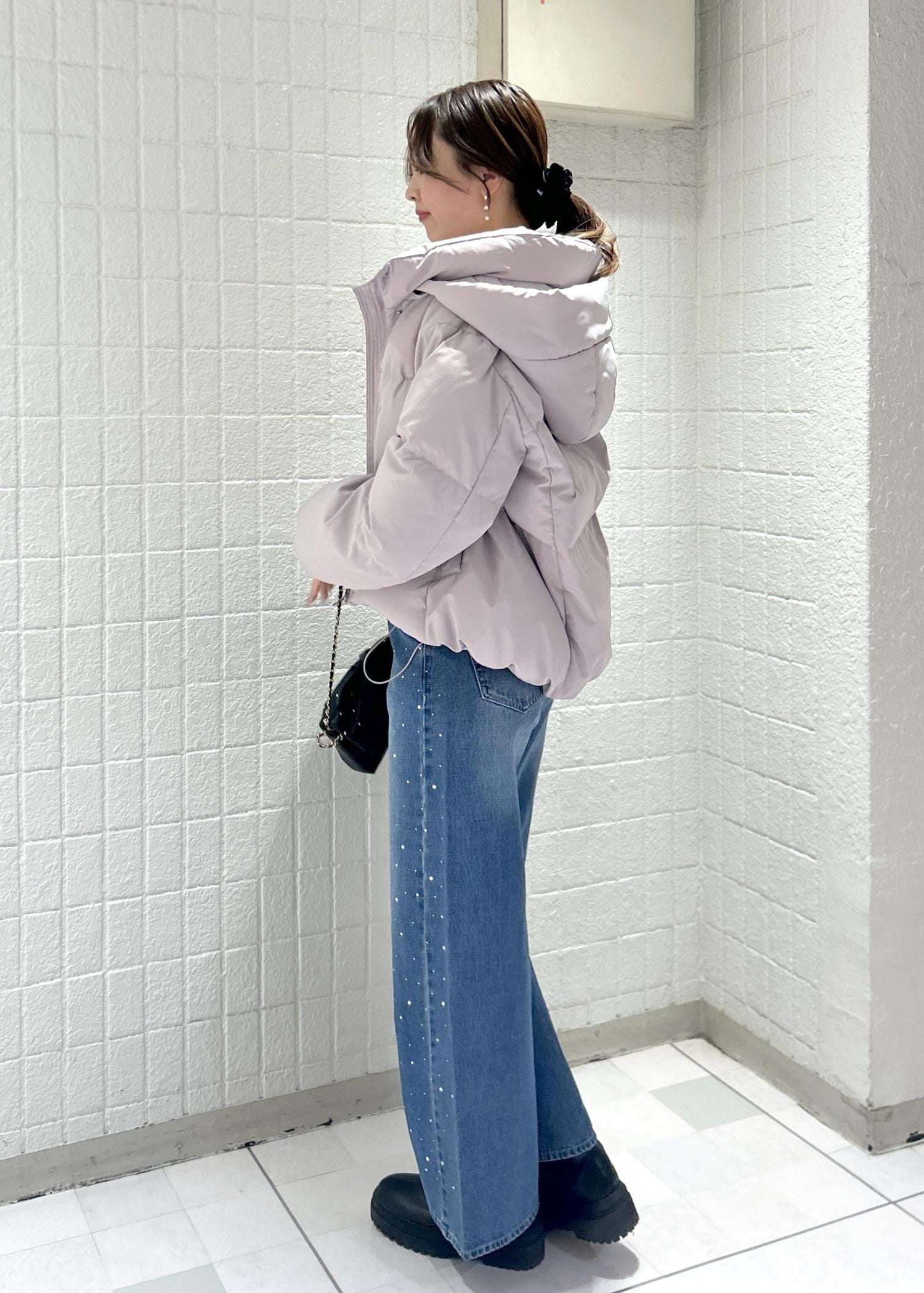 172cmでMサイズ着用していますがくるぶしにギリギリかかる丈感でワイドパンツですが渡幅も広すぎないシルエットです。 -