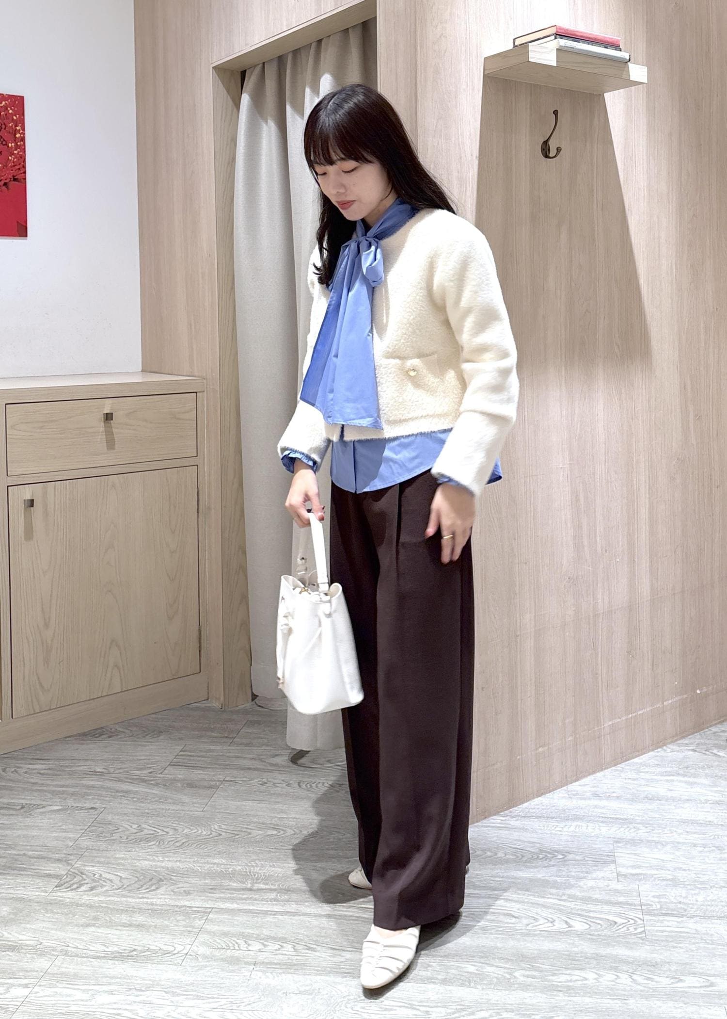 フェミニンなボウタイブラウスはワイドパンツと合わせることで、甘すぎない大人っぽいコーデに◎