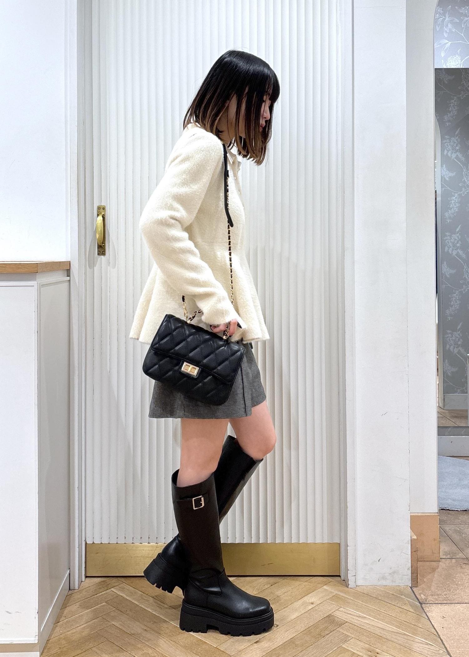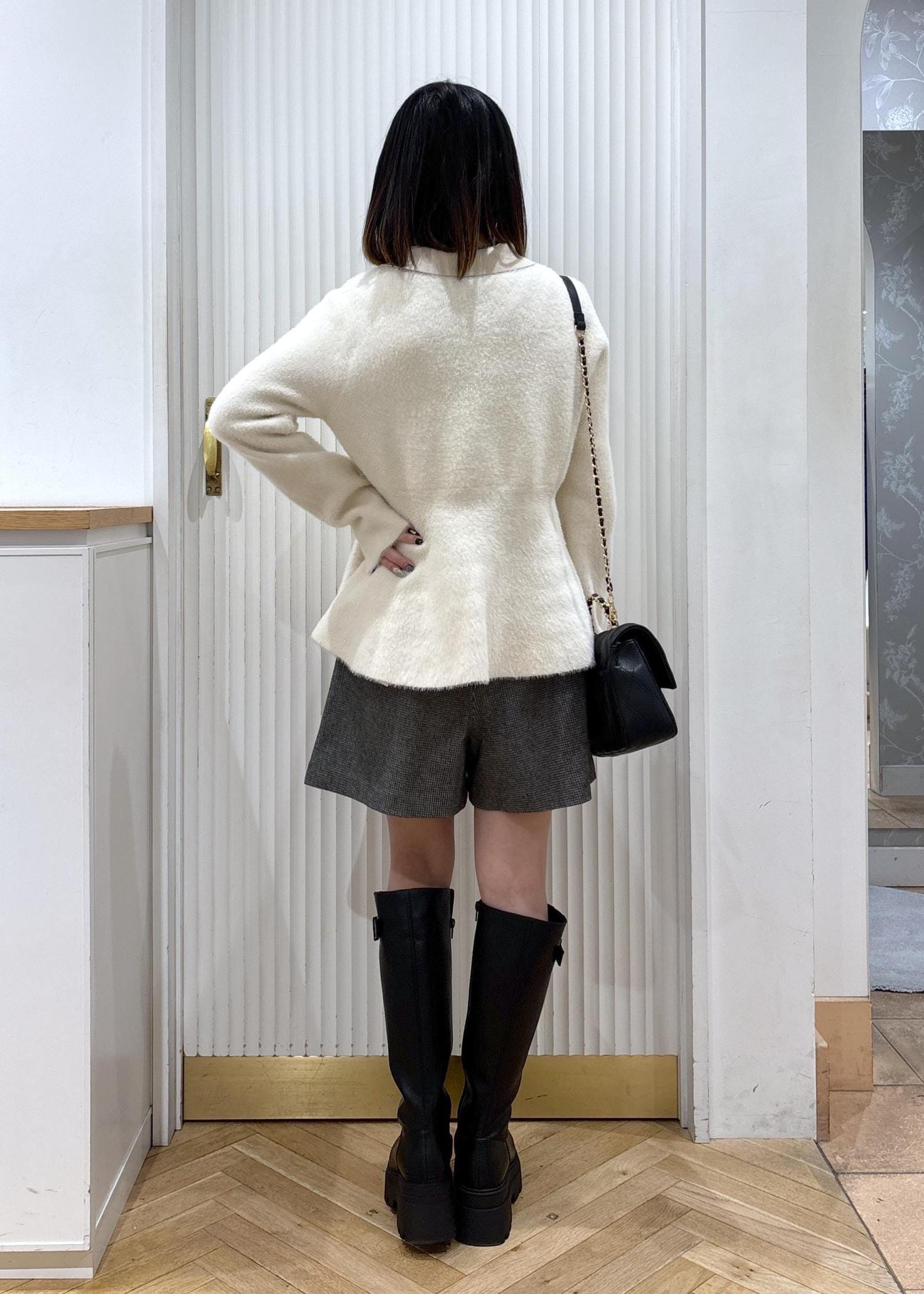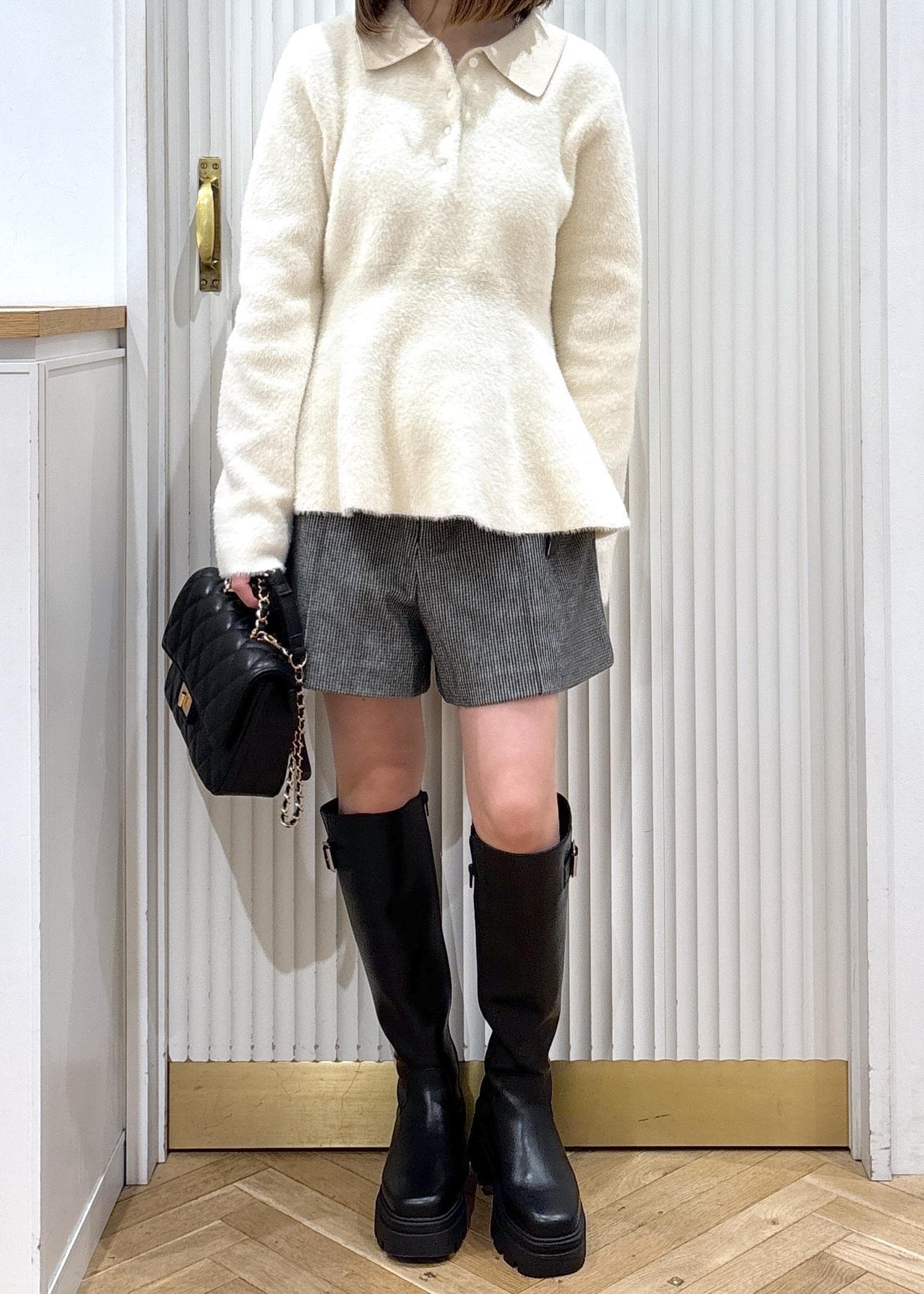 ペプラムのトップスを合わせると脚が短く見えやすかったり着膨れして見えるという方におすすめです!切り替え位置が高いので脚が長く見えやすいです!またショートパンツを合わせることで脚が出る面積が増え、厚底のロングブーツでより一層脚長効果アップします!トップスが白なので他を黒にすることでよりスッキリ見えします☺︎