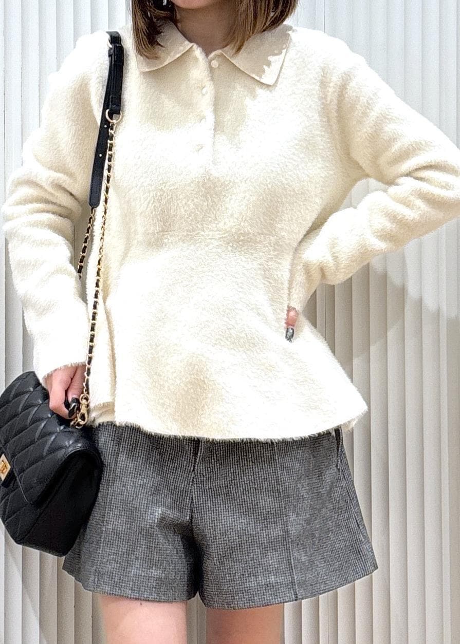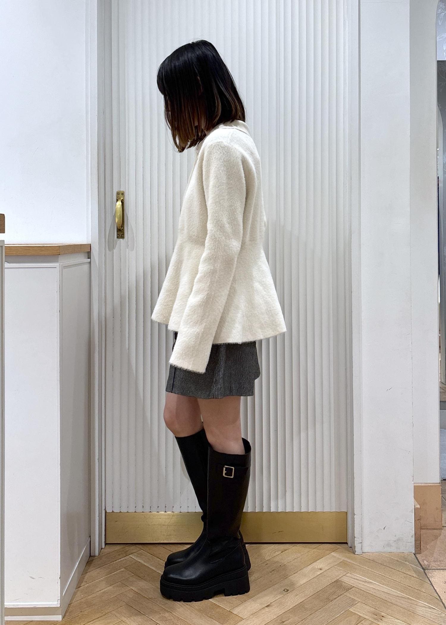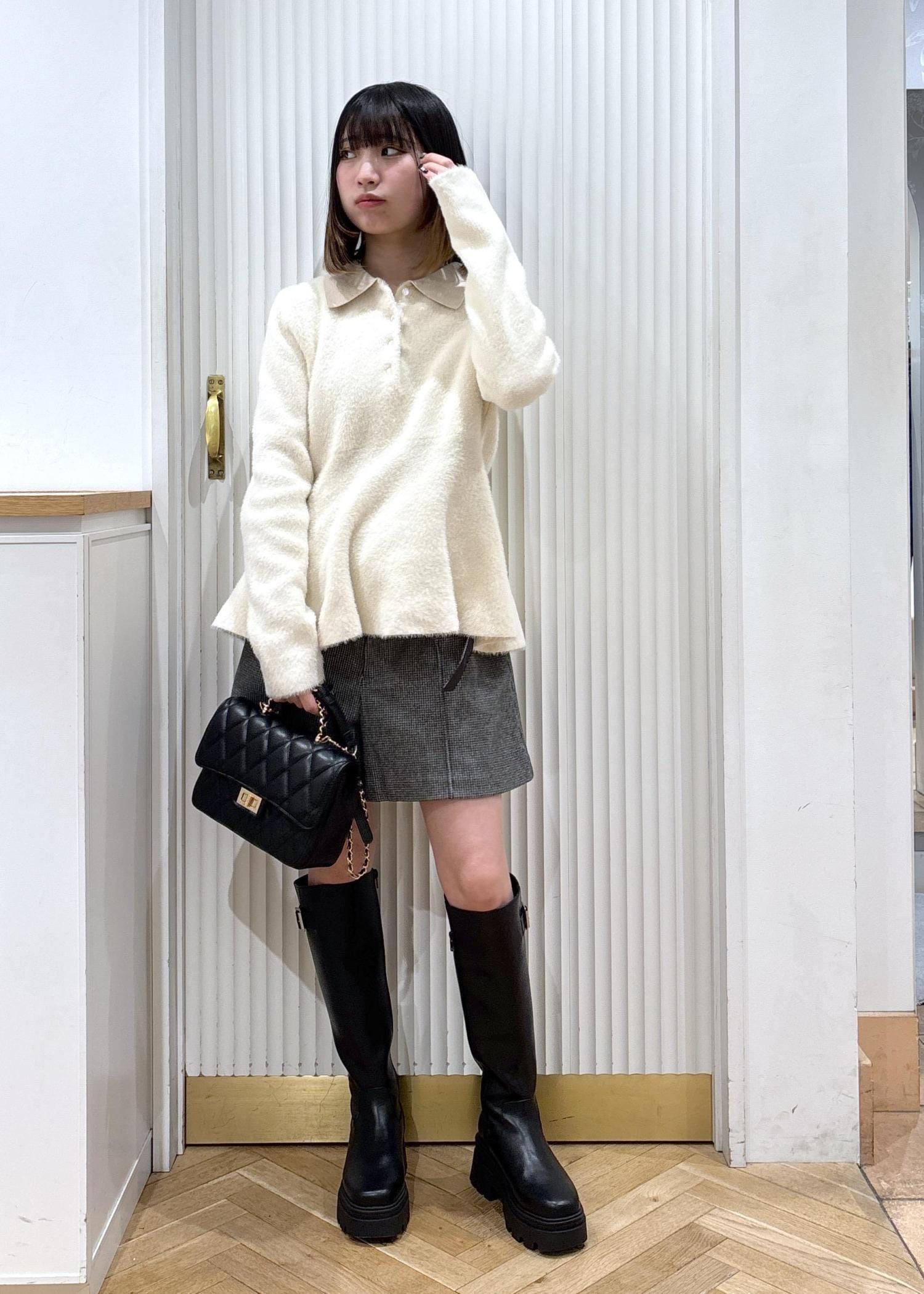 ペプラムのトップスを合わせると脚が短く見えやすかったり着膨れして見えるという方におすすめです!切り替え位置が高いので脚が長く見えやすいです!またショートパンツを合わせることで脚が出る面積が増え、厚底のロングブーツでより一層脚長効果アップします!トップスが白なので他を黒にすることでよりスッキリ見えします☺︎
