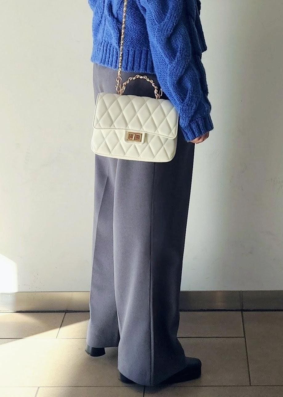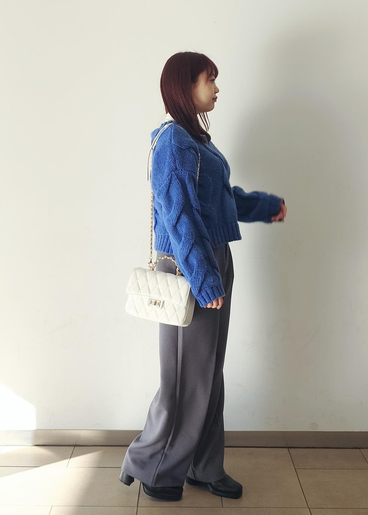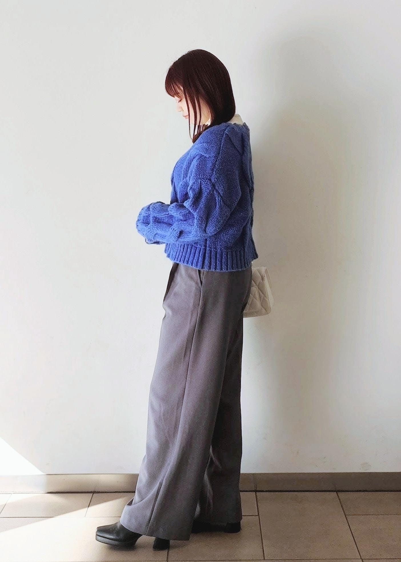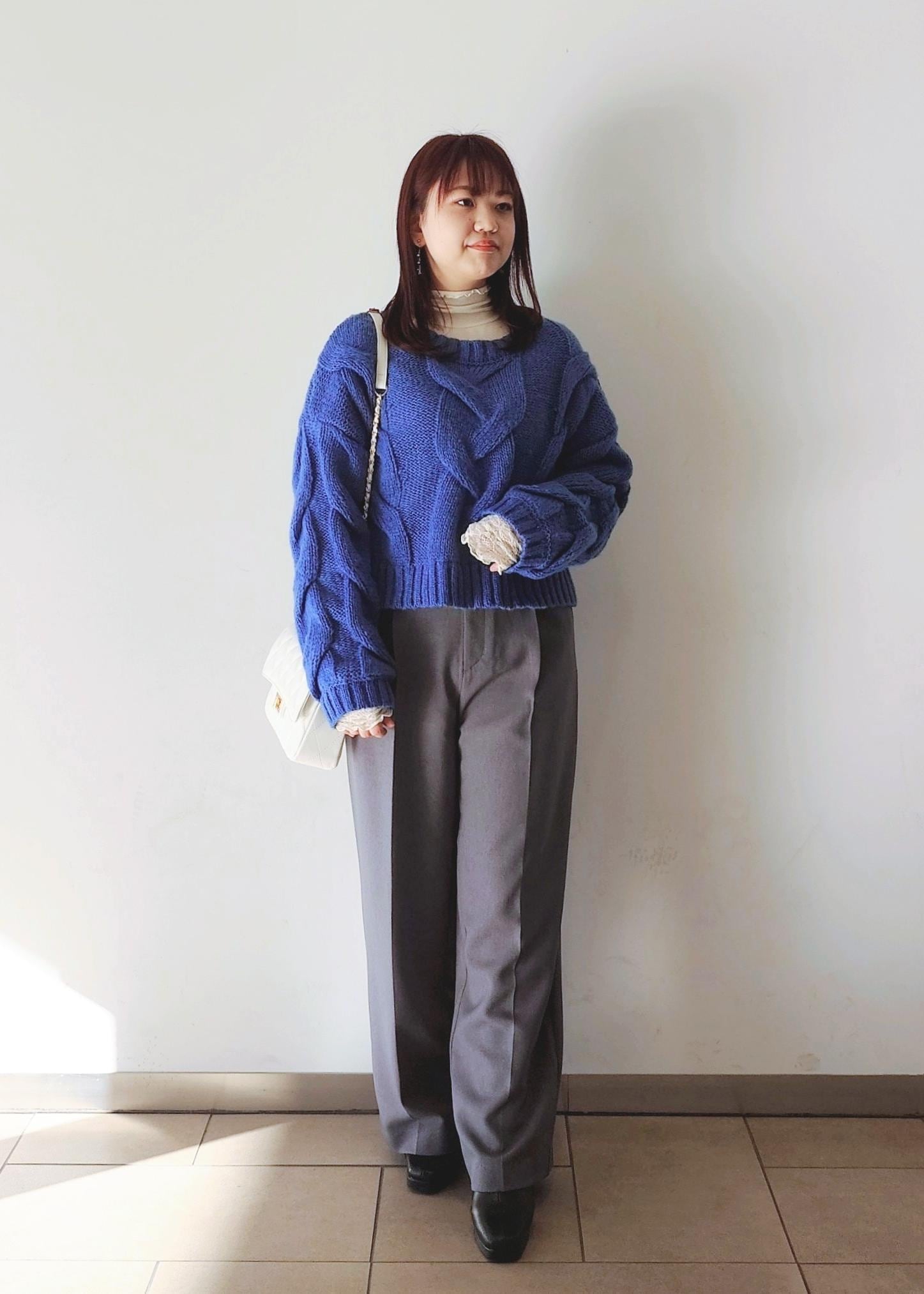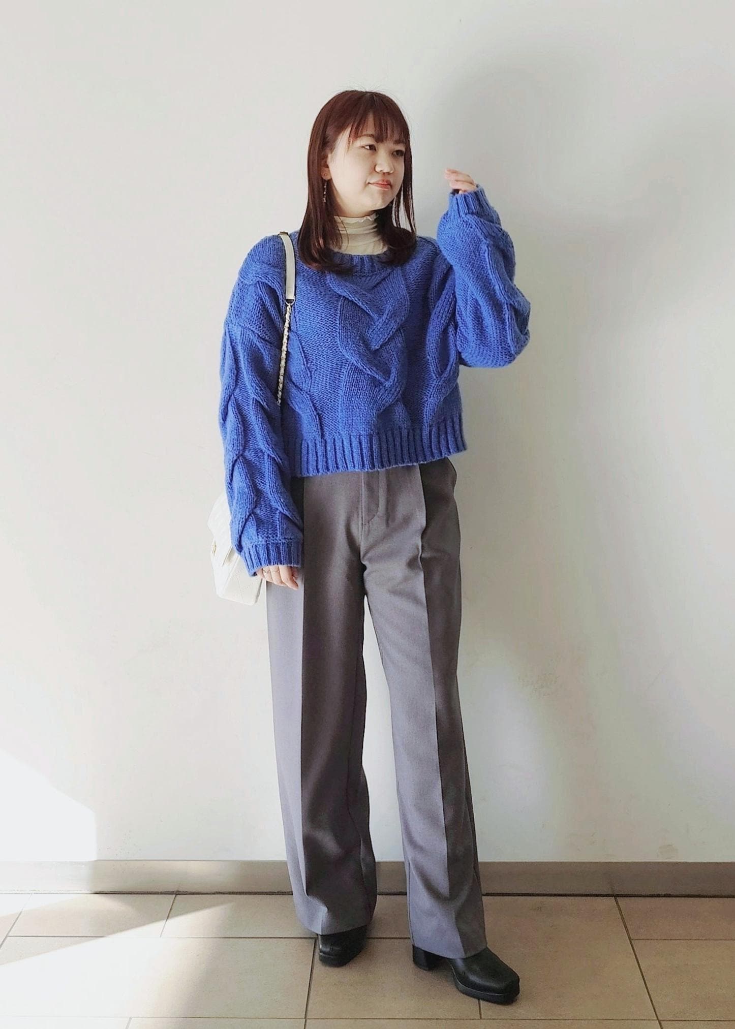 ブルーが映えるように、ニット以外を明るめのグレーやホワイトでまとめました。