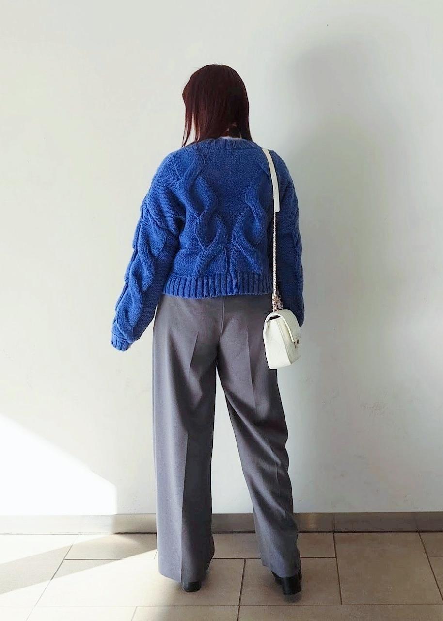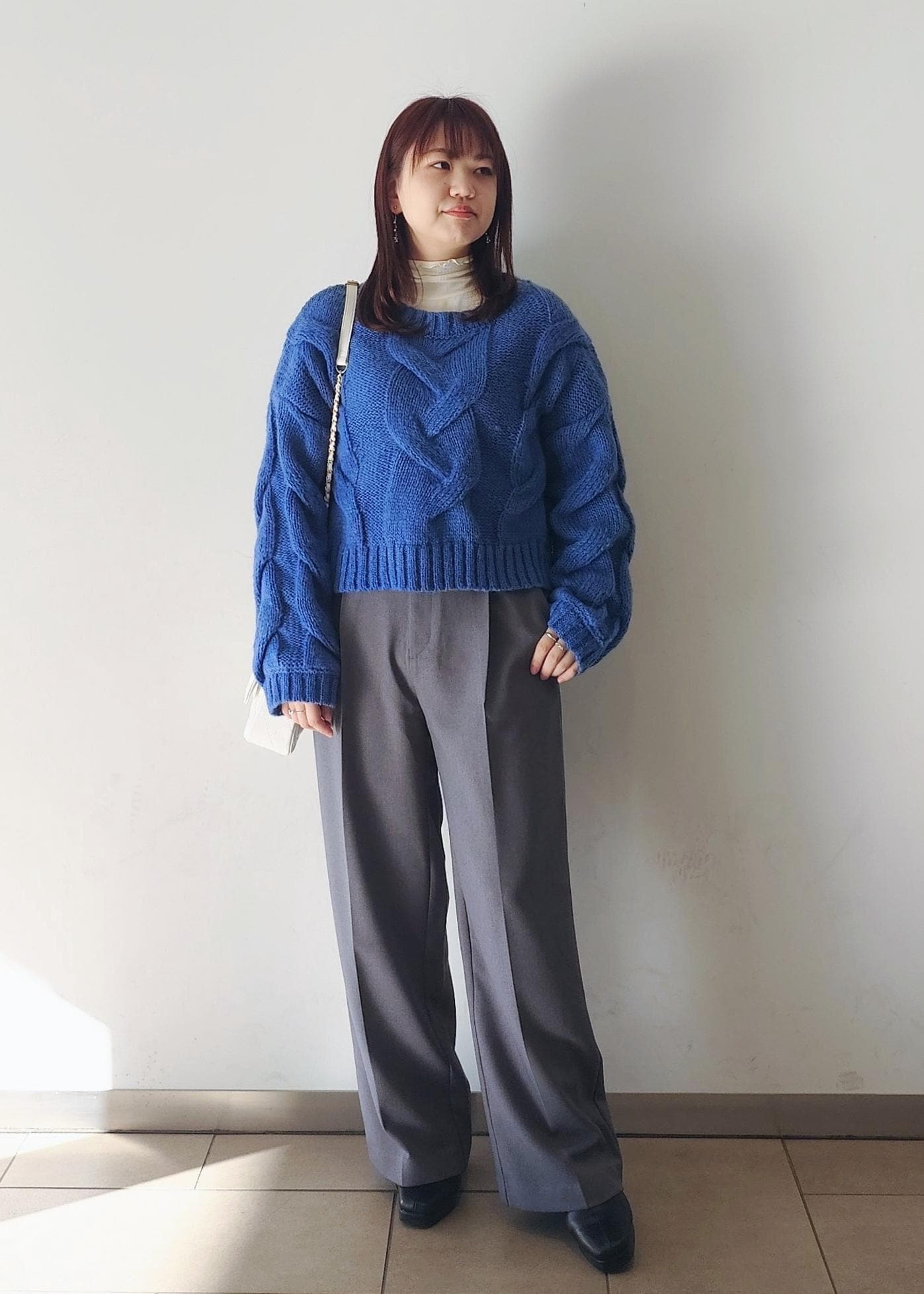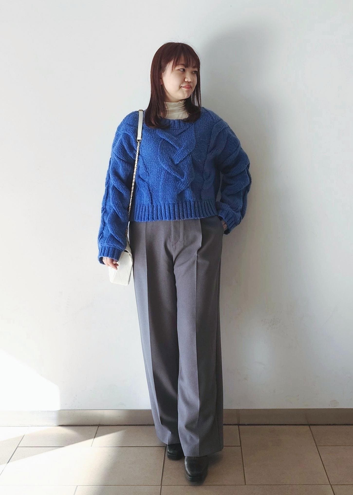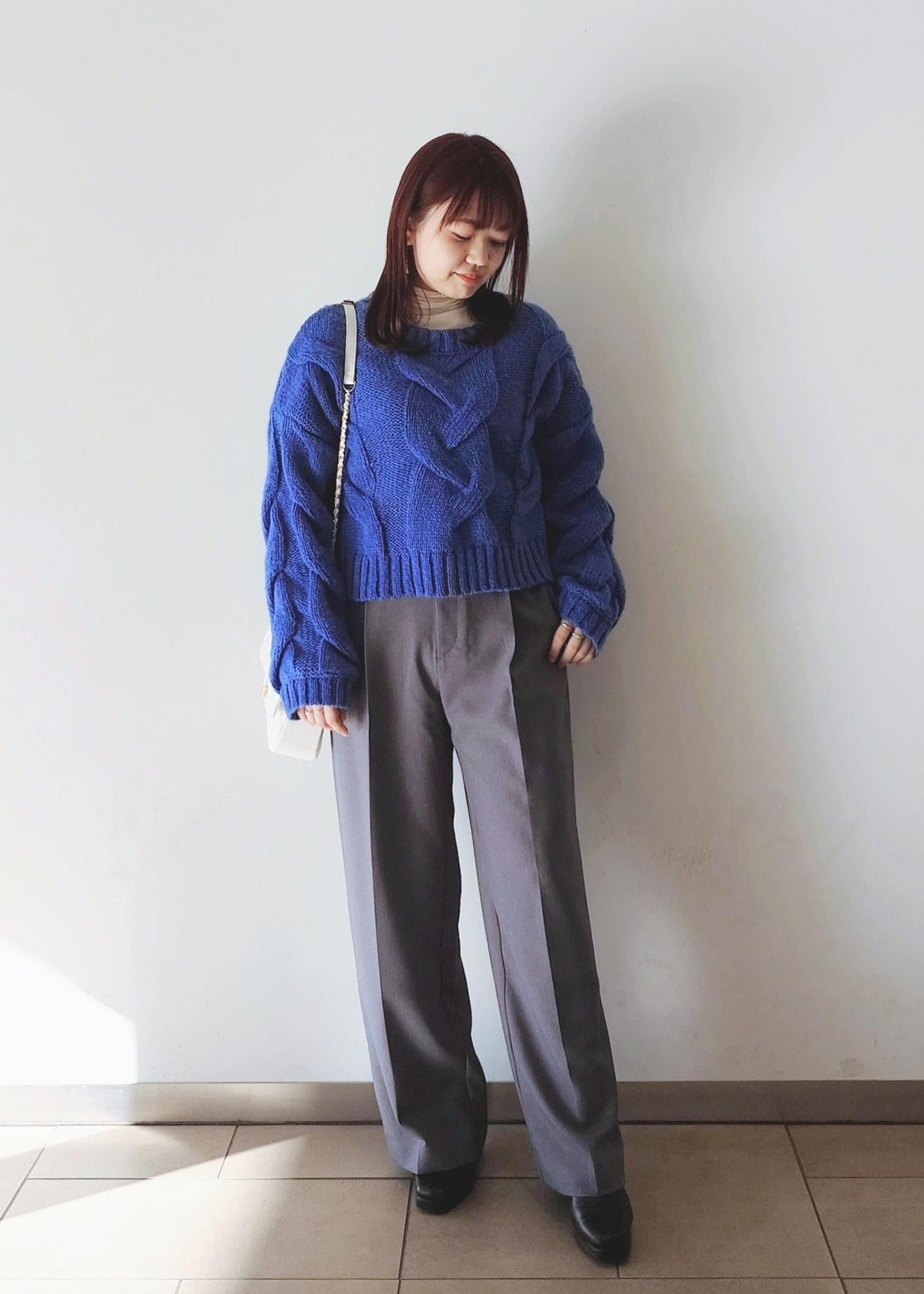 大きなケーブル編みが可愛いニットを主役にしたお仕事スタイル。