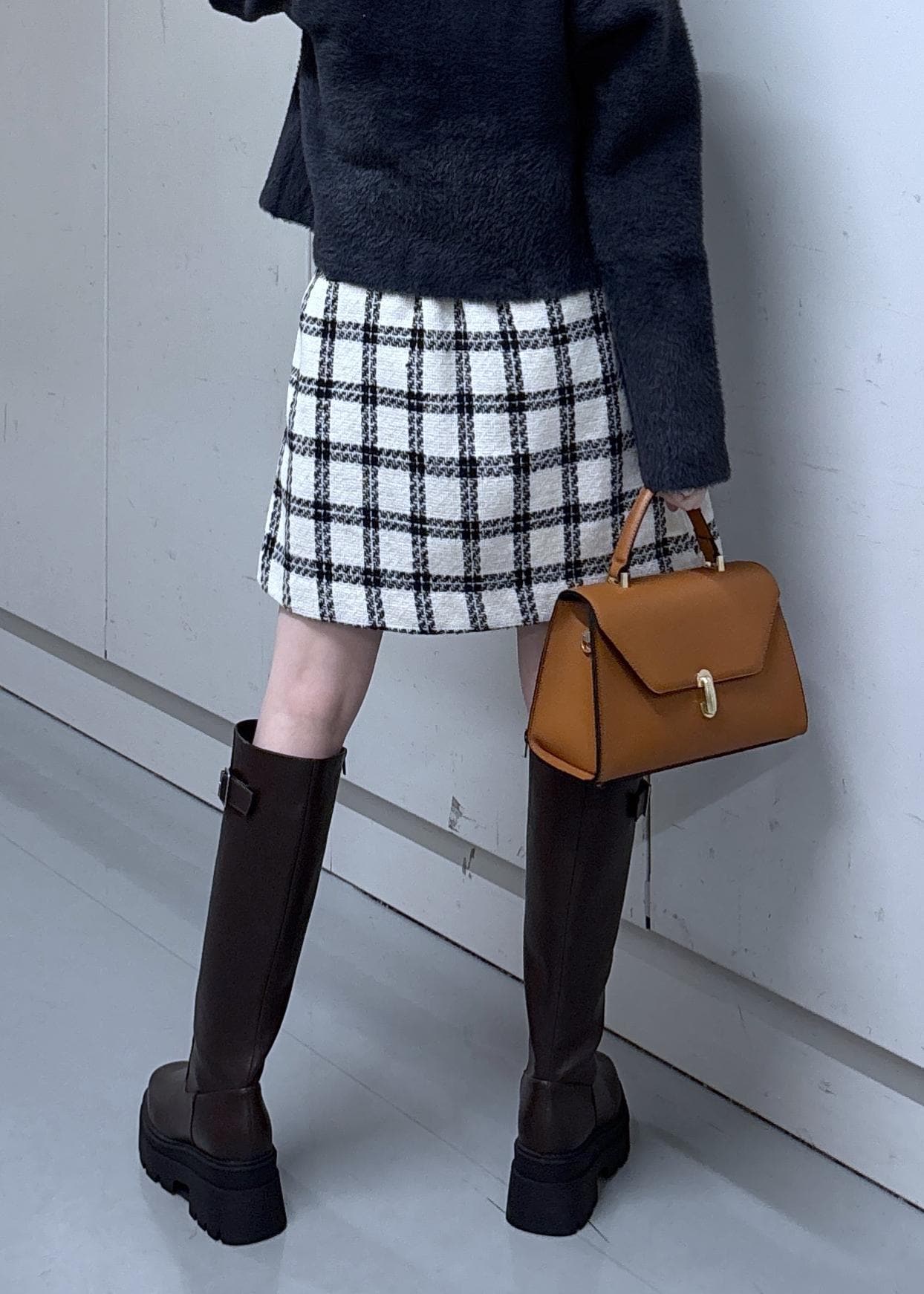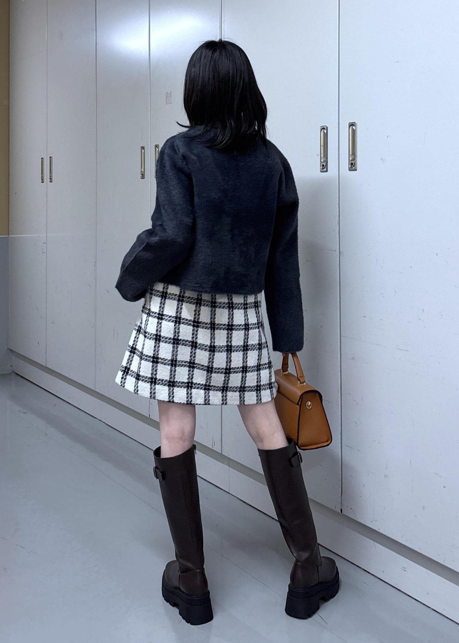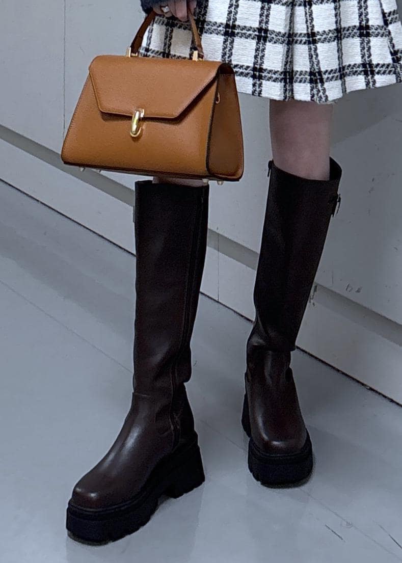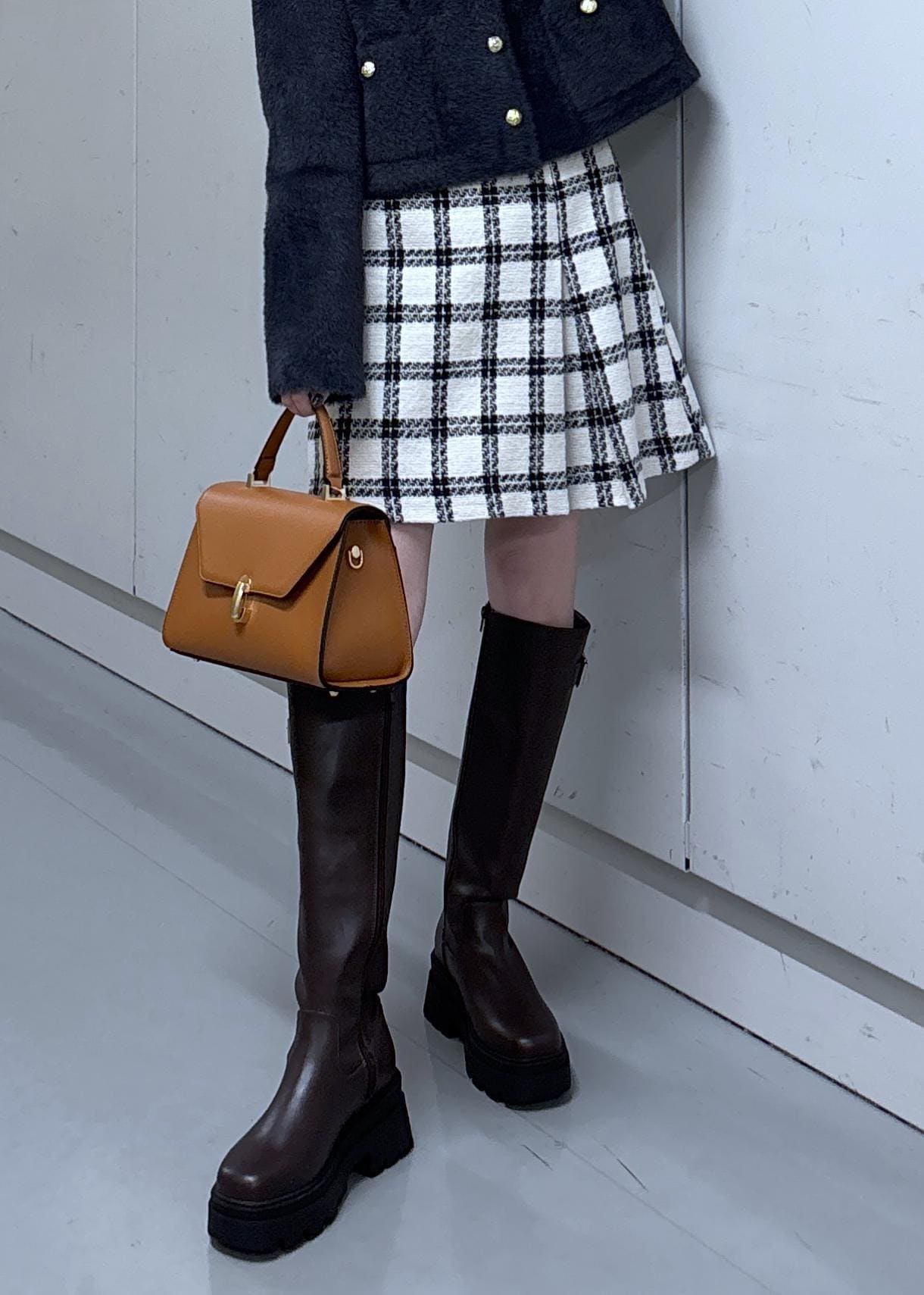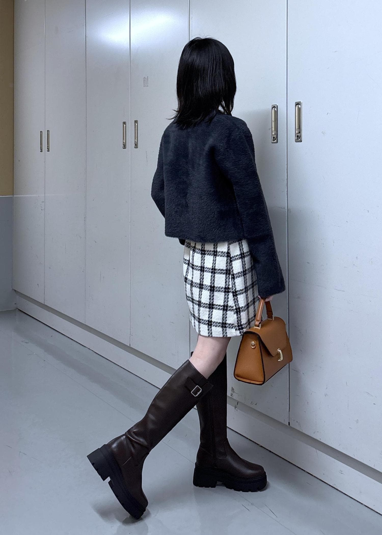 厚底ロングブーツとミニスカート、コンパクトな丈感のカーディガンの合わせでスタイルアップ♩