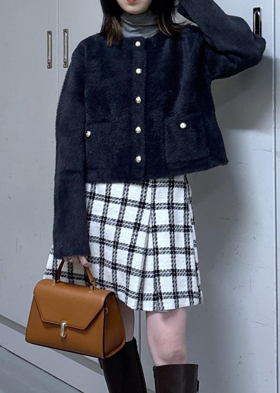 モノトーンですが、柔らかさのあるネイビーとホワイトの割合多めチェックで抜け感が出て重たくなりません◎