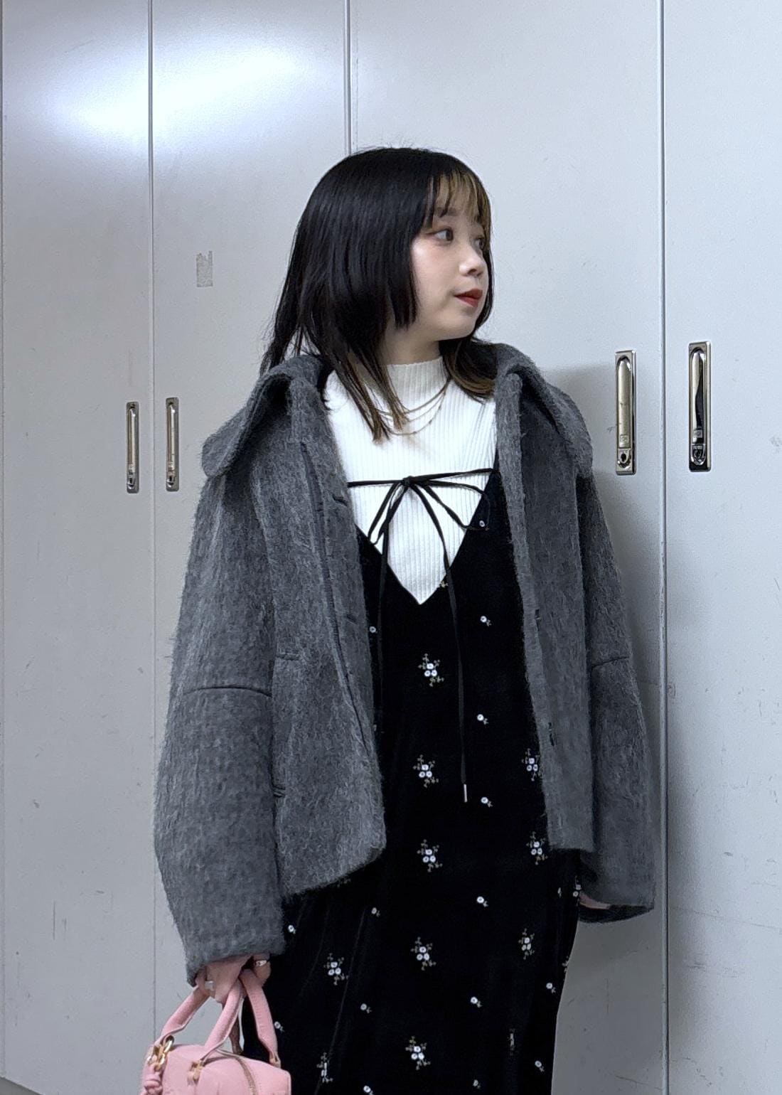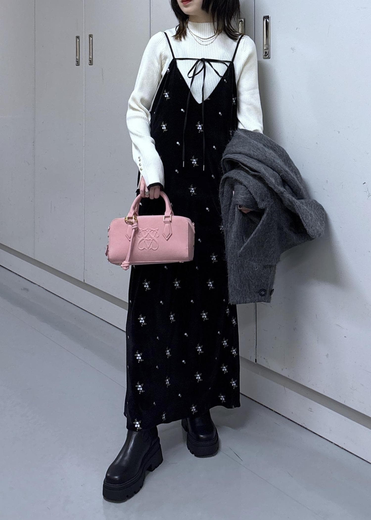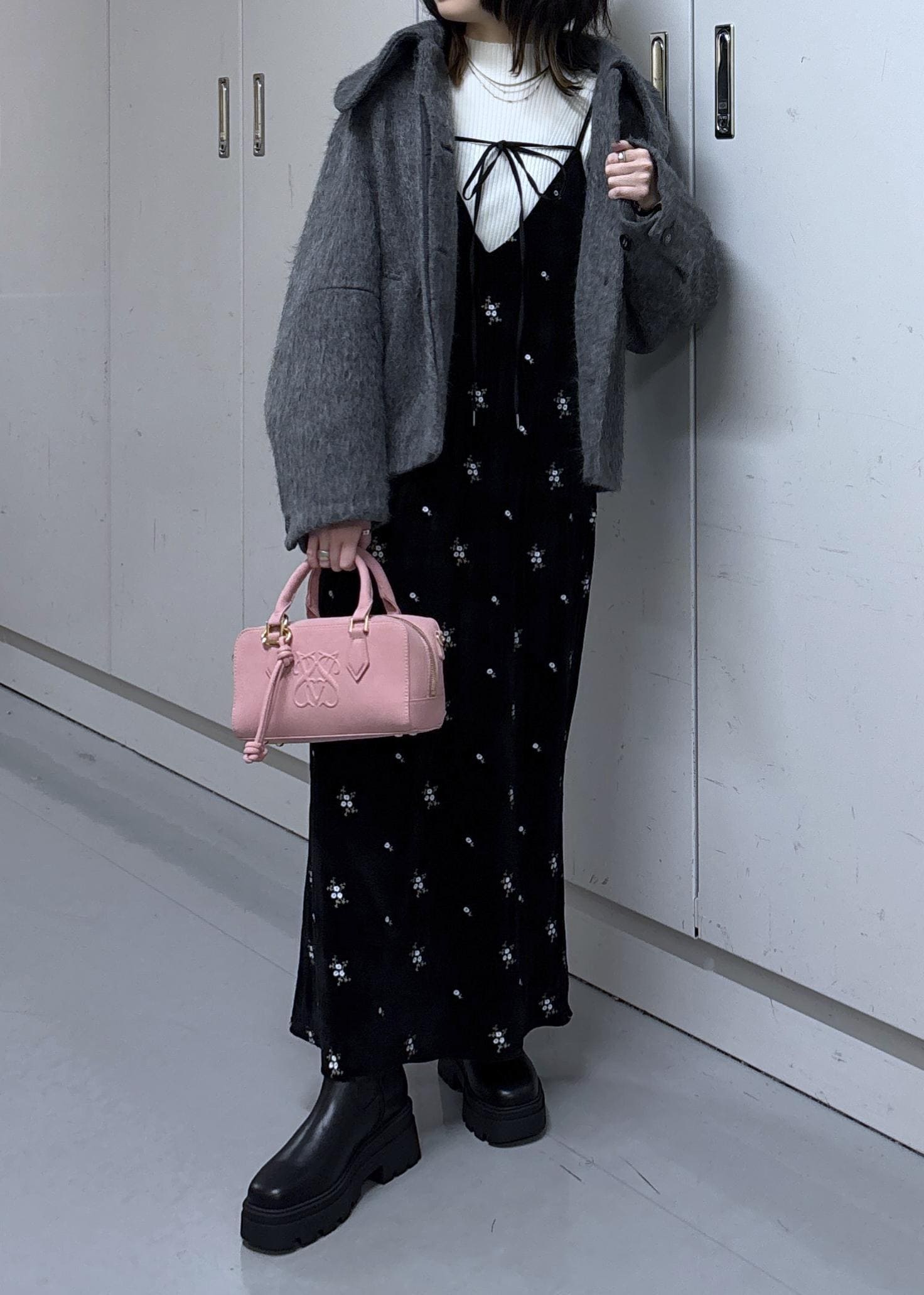 小花柄と胸元のリボンアレンジが甘めな印象ですが、ベロア素材で程よい光沢感もあり上品な華やかさもあります◎