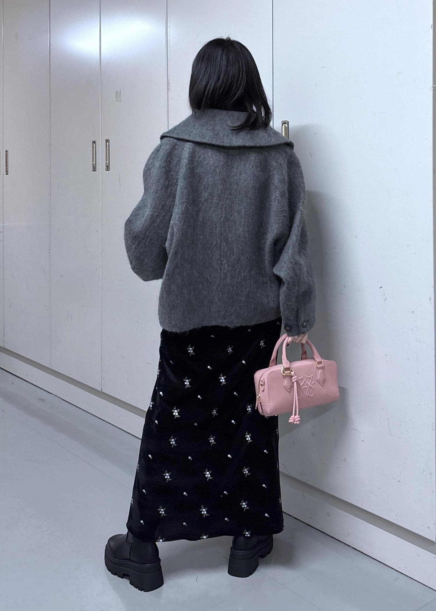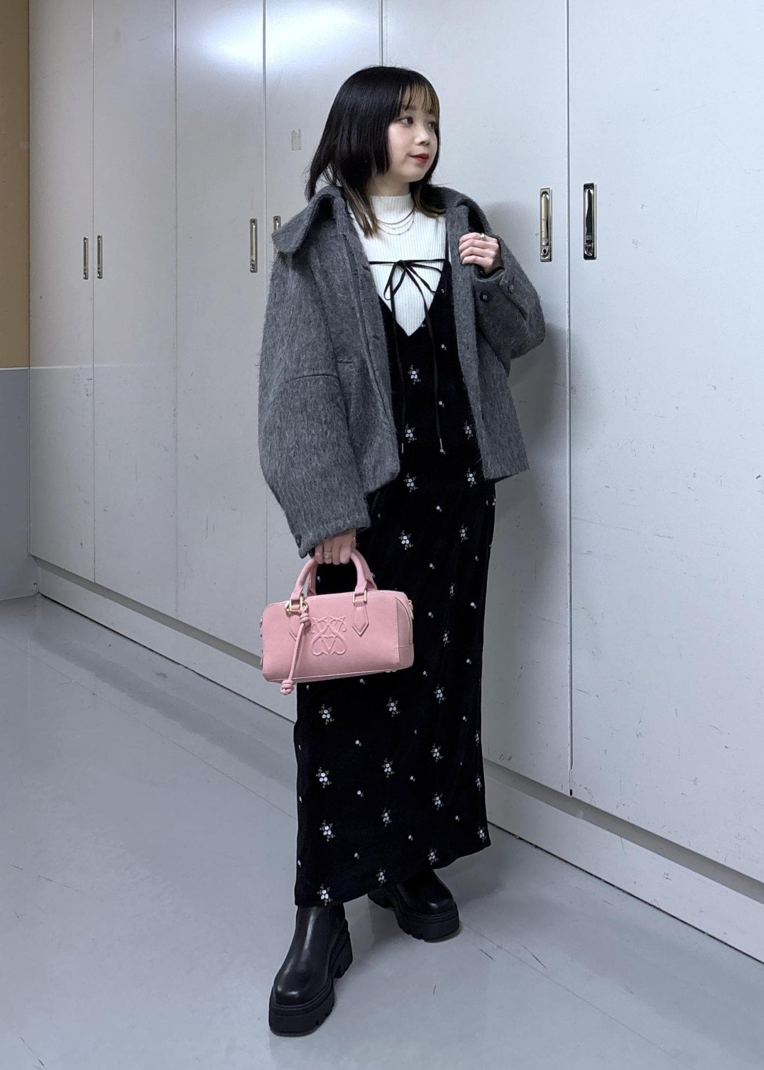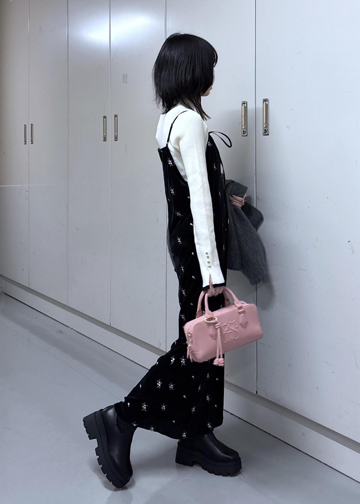 小花柄と胸元のリボンアレンジが甘めな印象ですが、ベロア素材で程よい光沢感もあり上品な華やかさもあります◎