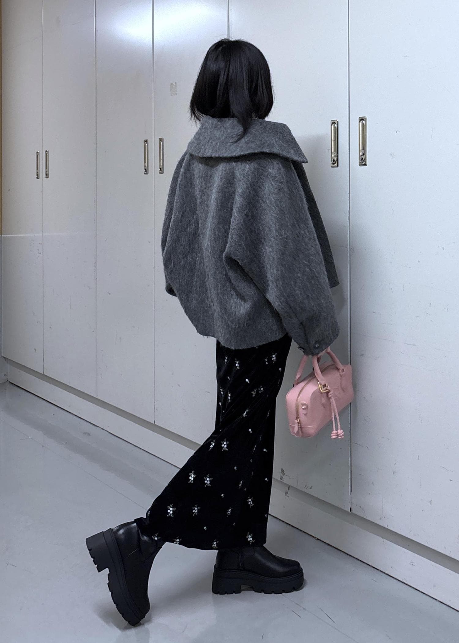NEW!VIS【アウター総選挙1位】ビッグカラーモモンガシャギーショートコートグレー / S¥10,989レビュー155cm、Sサイズ着用。おしりは隠れている気がします。