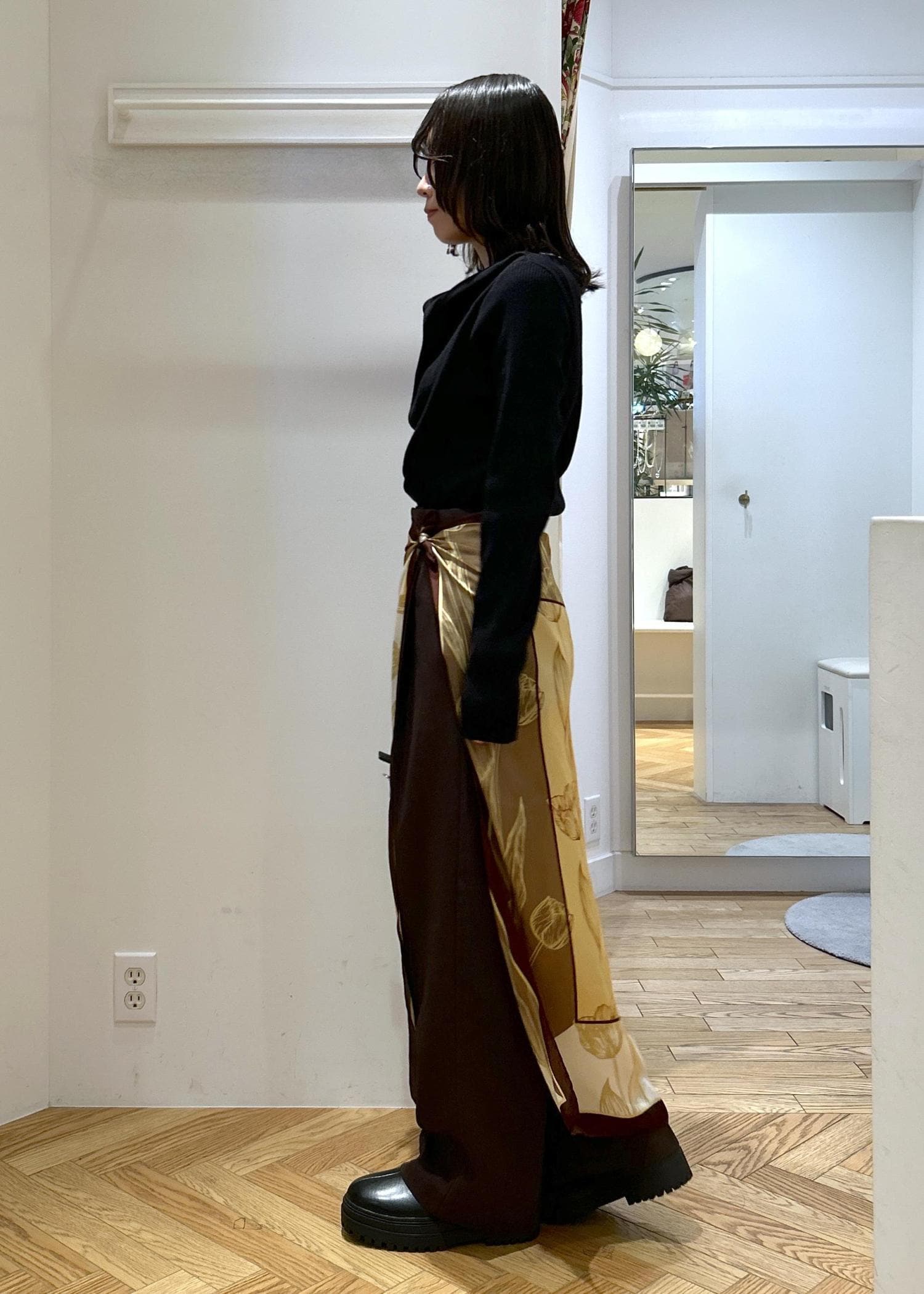 身長157センチでSサイズ着用。裸足だと床に触れるくらいの丈です。