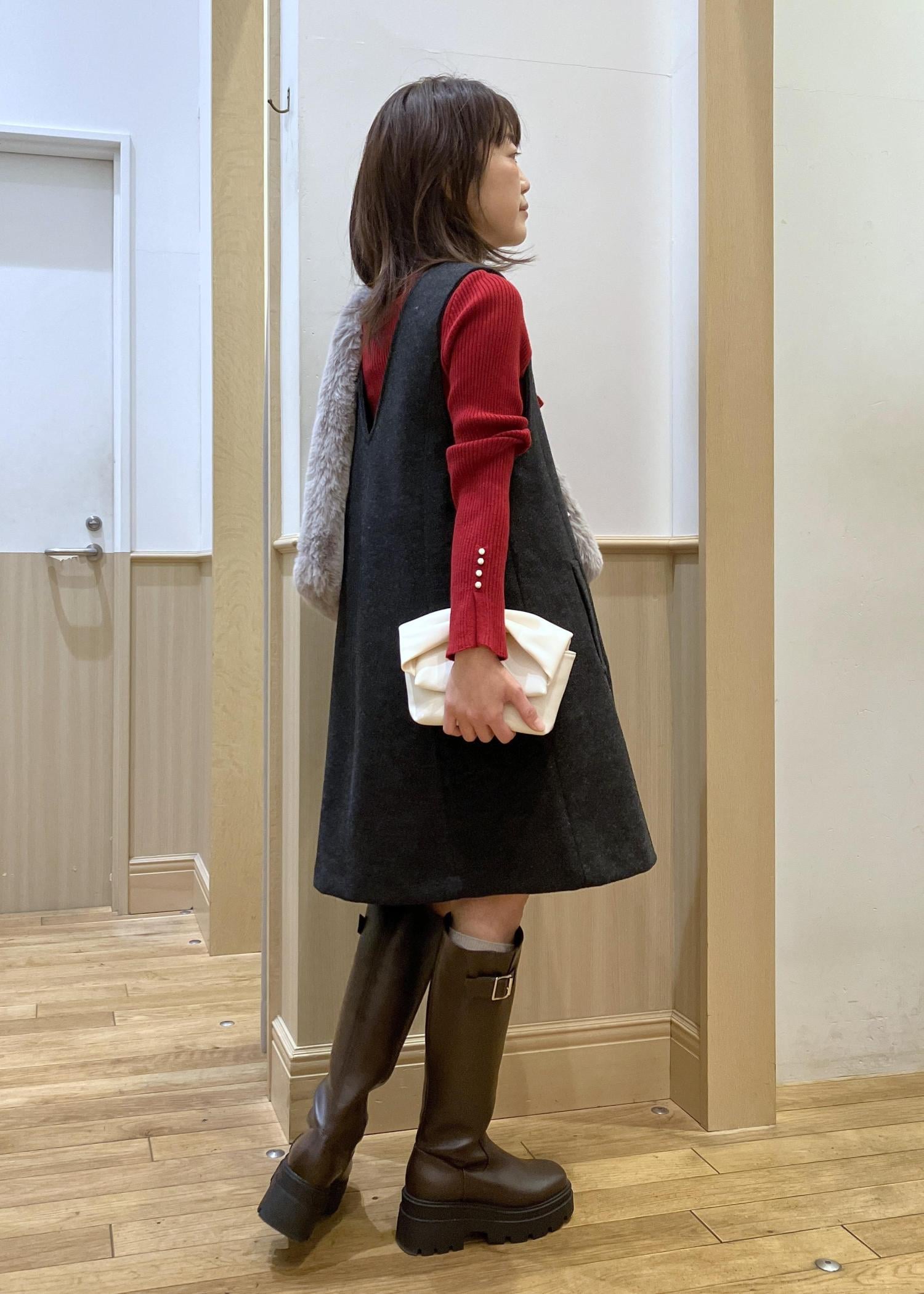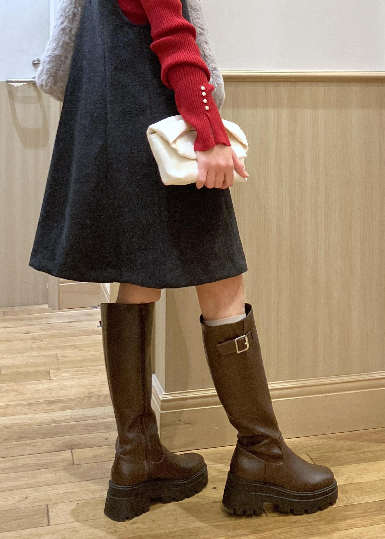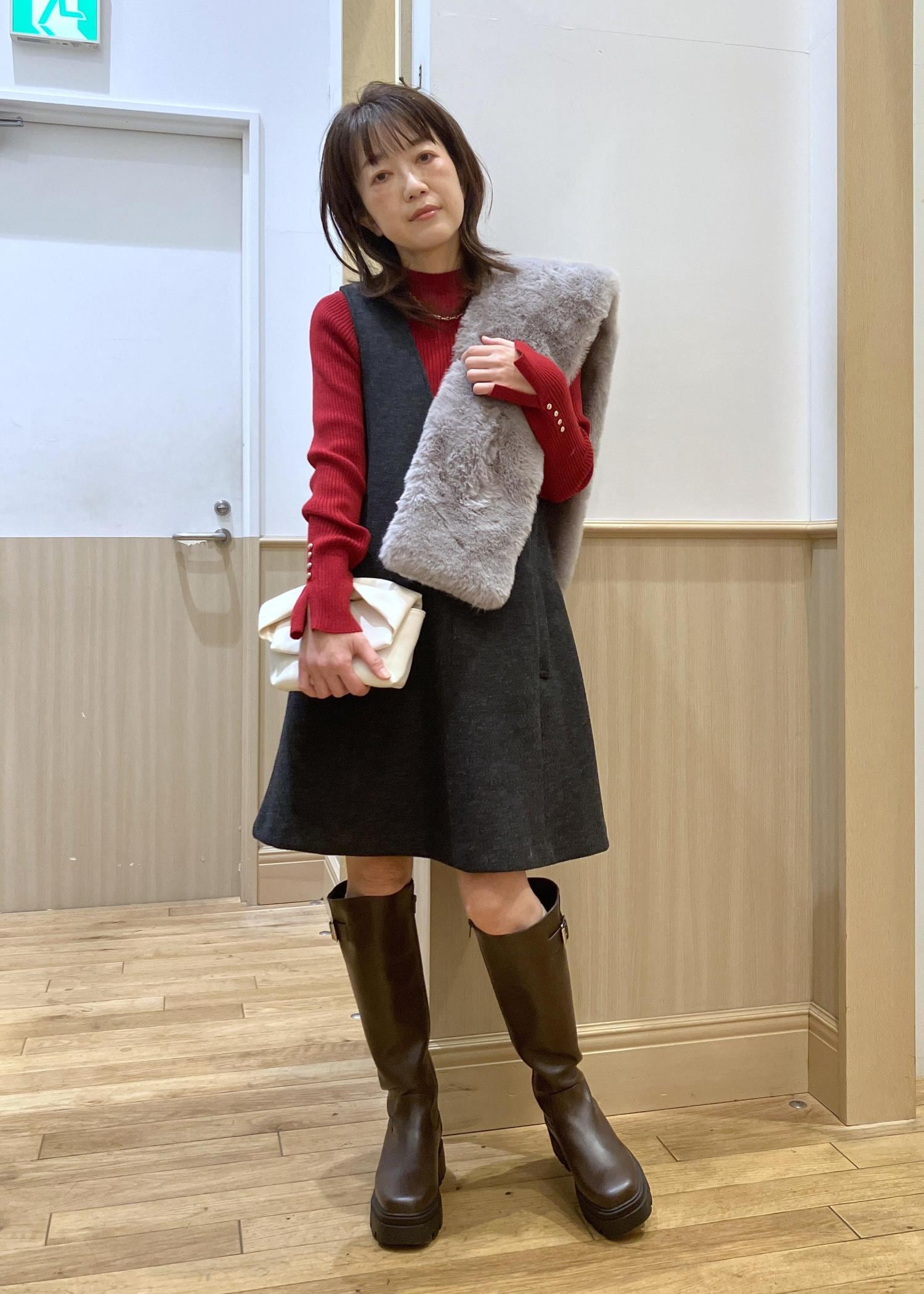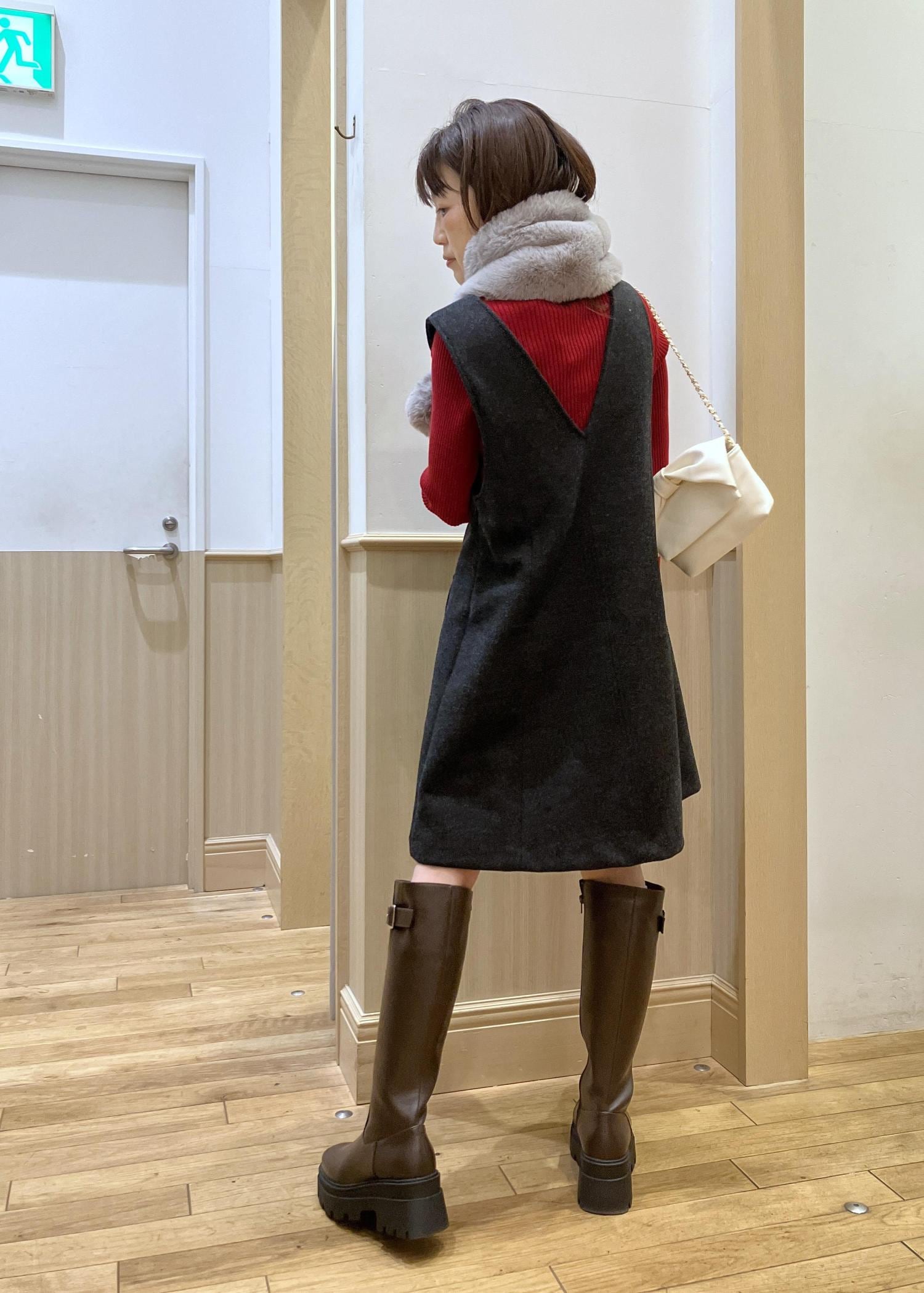 ロングブーツで合わせるとチャレンジしやすくてオススメです。インナーはシンプルなリブニットでスッキリまとめてます。