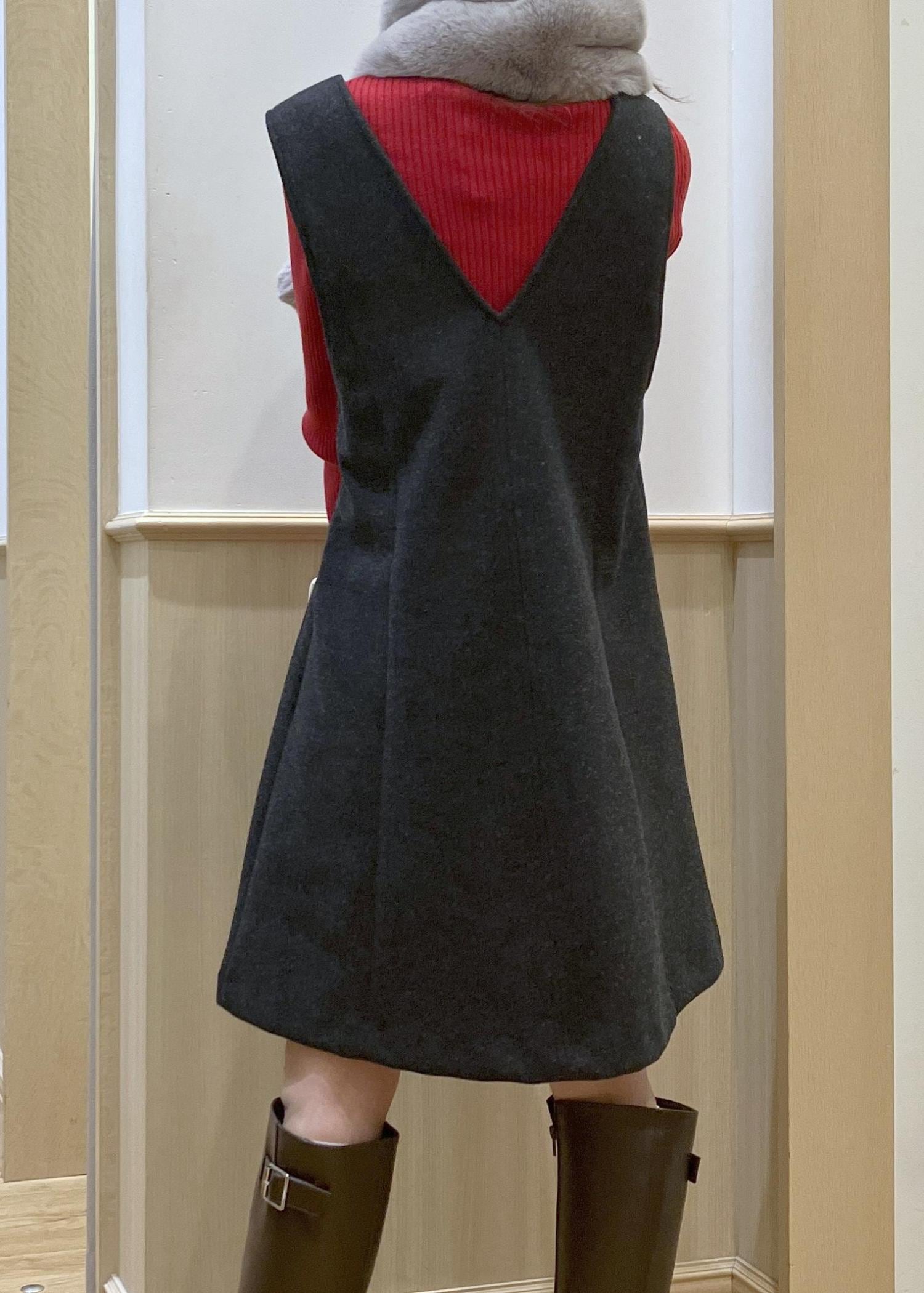 ふんわりブラウスや、襟付きシャツなど色々なインナーが合わせやすいような深めのVネックで脇下も余裕があるサイズになってます。 -
